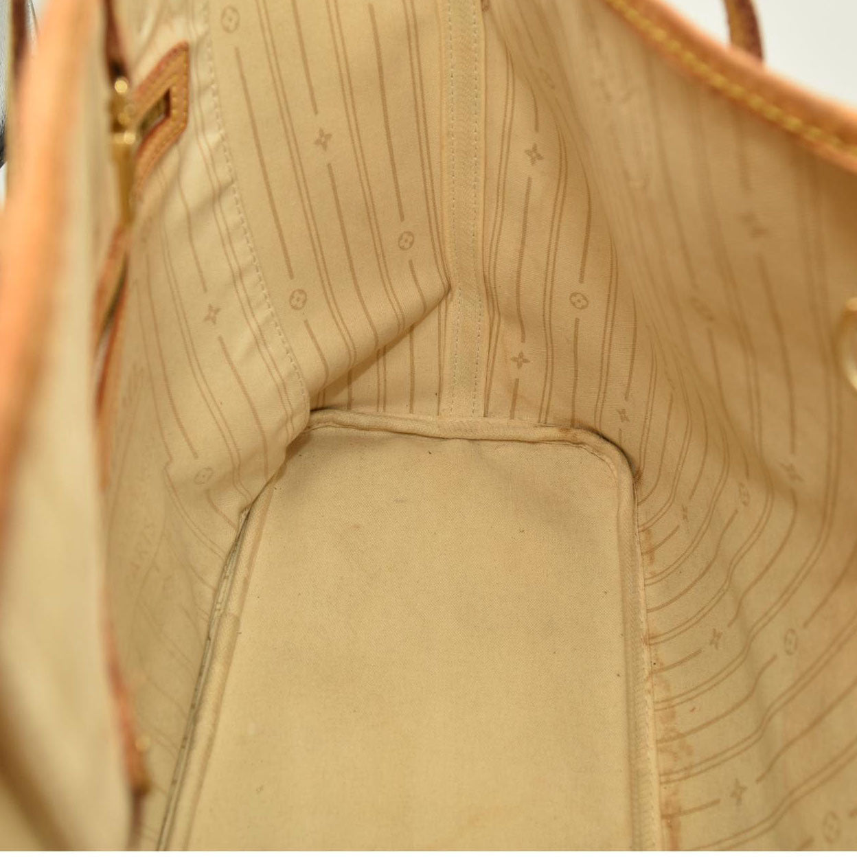 This is an authentic LOUIS VUITTON Damier Azur Neverfull MM. This stylish tote is crafted of Louis Vuitton's signature damier canvas in blue and white. This shoulder bag features vachetta cowhide leather trim, including strap handles and side cinch cords, with polished gold hardware. The top is wide and open to a striped ivory fabric interior with a hanging zipper pocket.