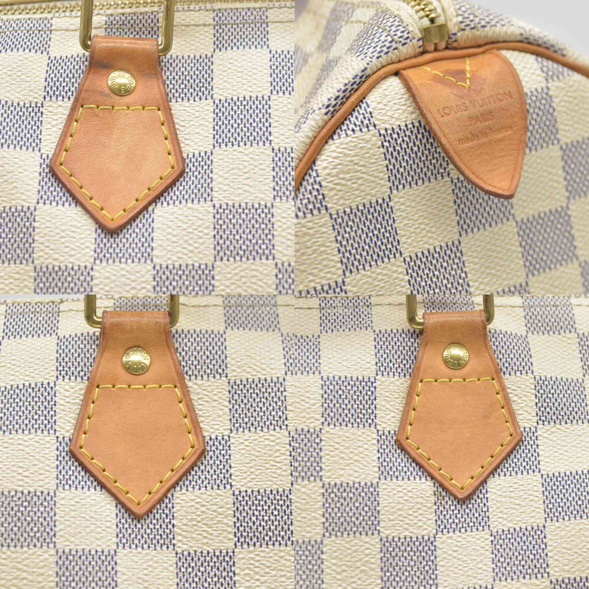 This is an authentic LOUIS VUITTON Damier Azur Speedy 25. This iconic tote is crafted of Louis Vuitton Damier checkered canvas in blue and white. The handbag features natural vachetta cowhide leather trim and rolled top handles with polished gold tone handle rings. The top zipper opens to a beige fabric interior with a hanging pocket.