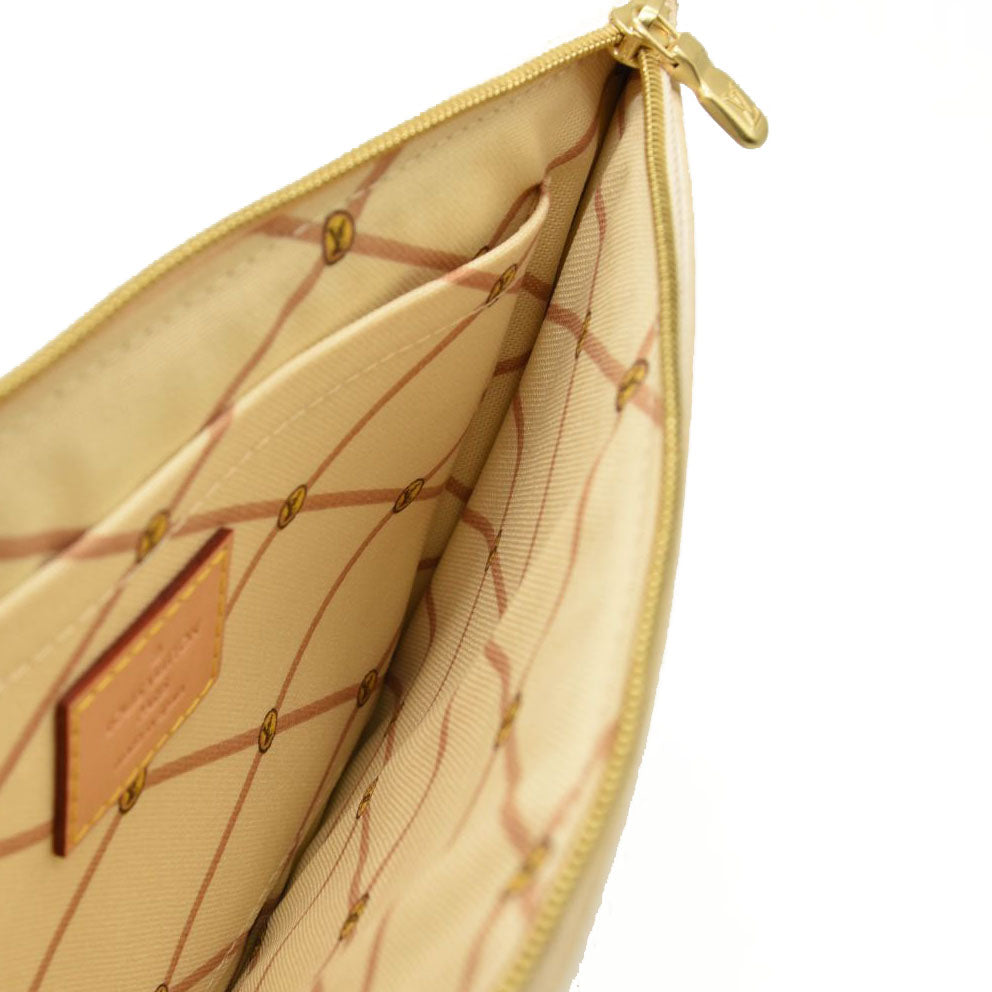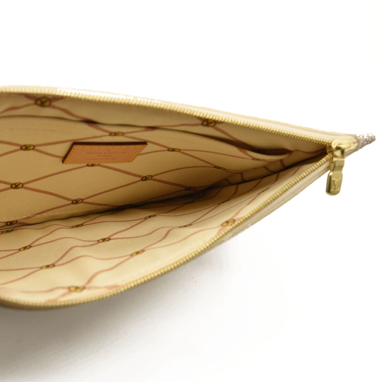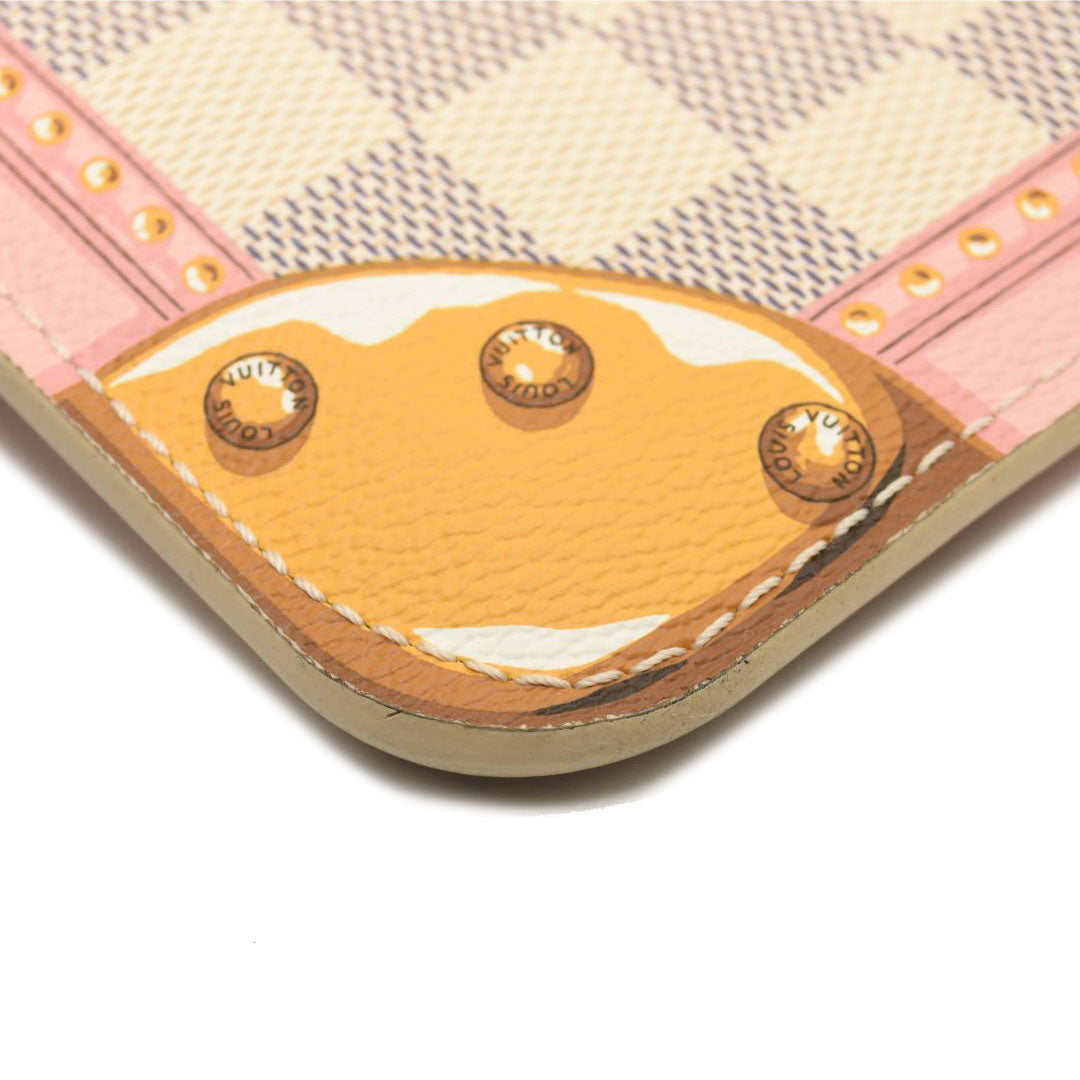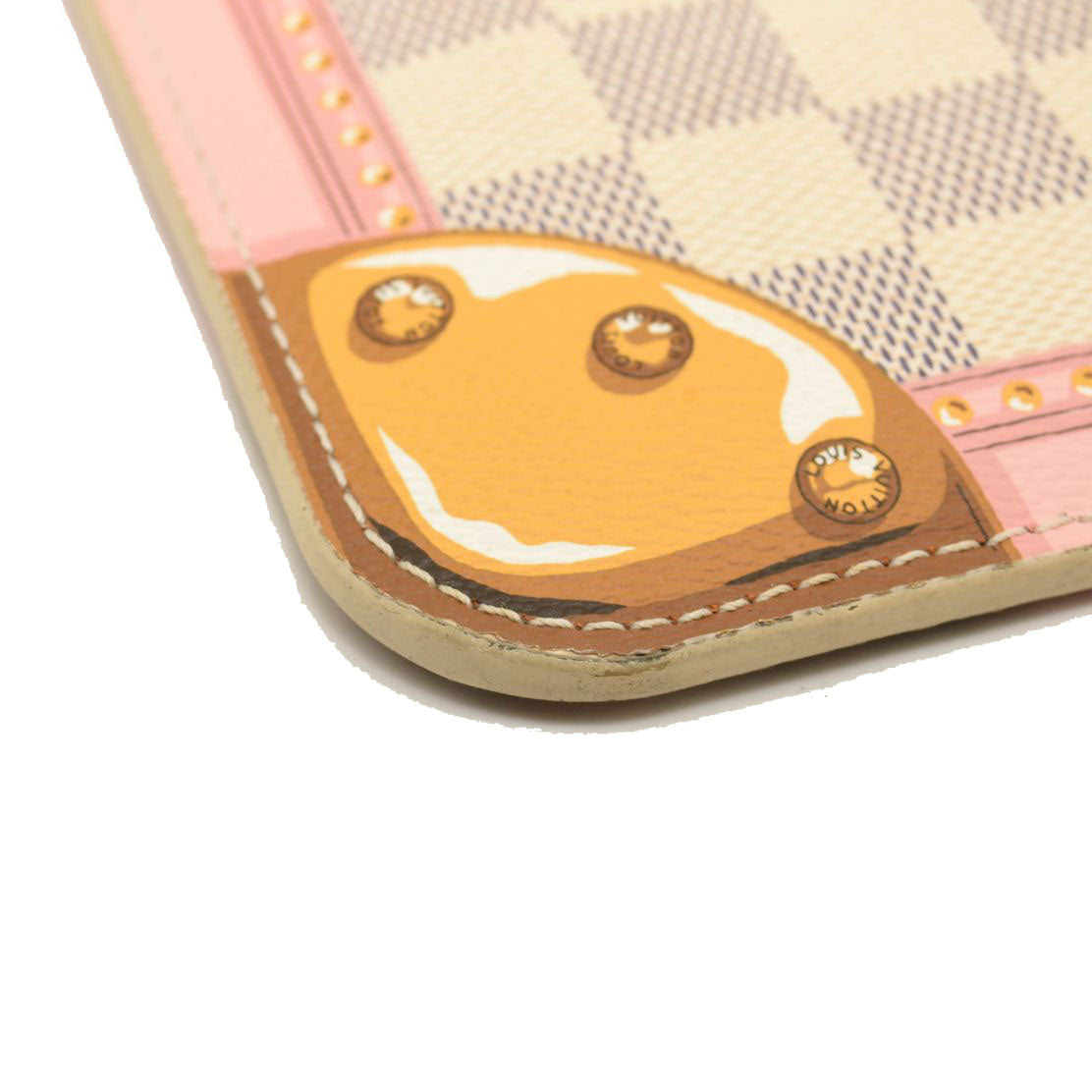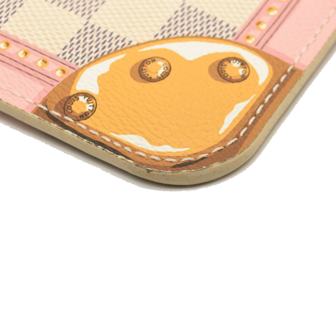 This is an authentic LOUIS VUITTON Damier Azur Summer Trunks Neverfull MM GM Pochette. This stylish pochette is crafted of blue and white checkered canvas overlaid with decor from the classic Louis Vuitton archives. The polished brass top zipper opens to a ivory fabric interior with a patch pocket.