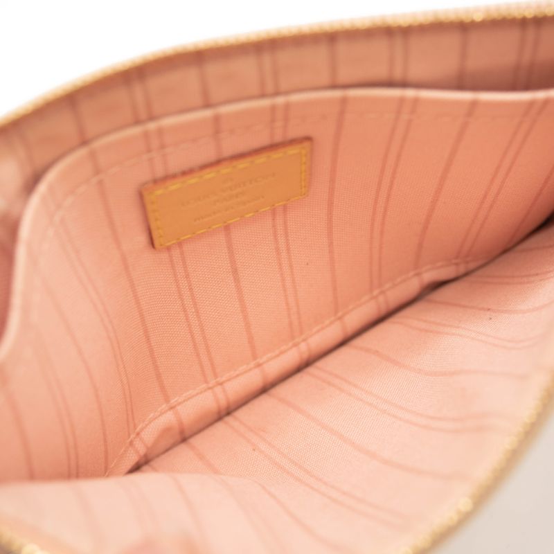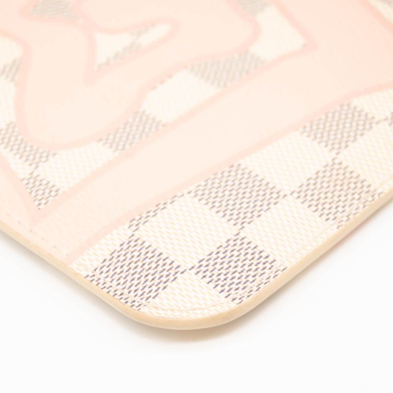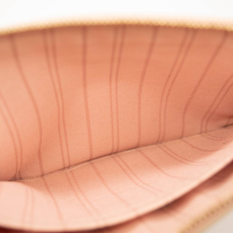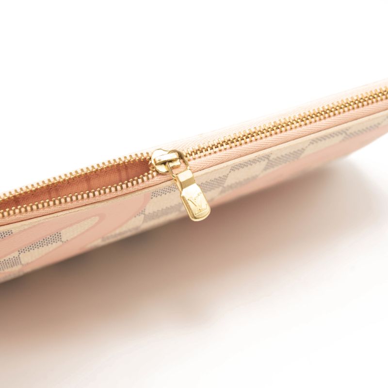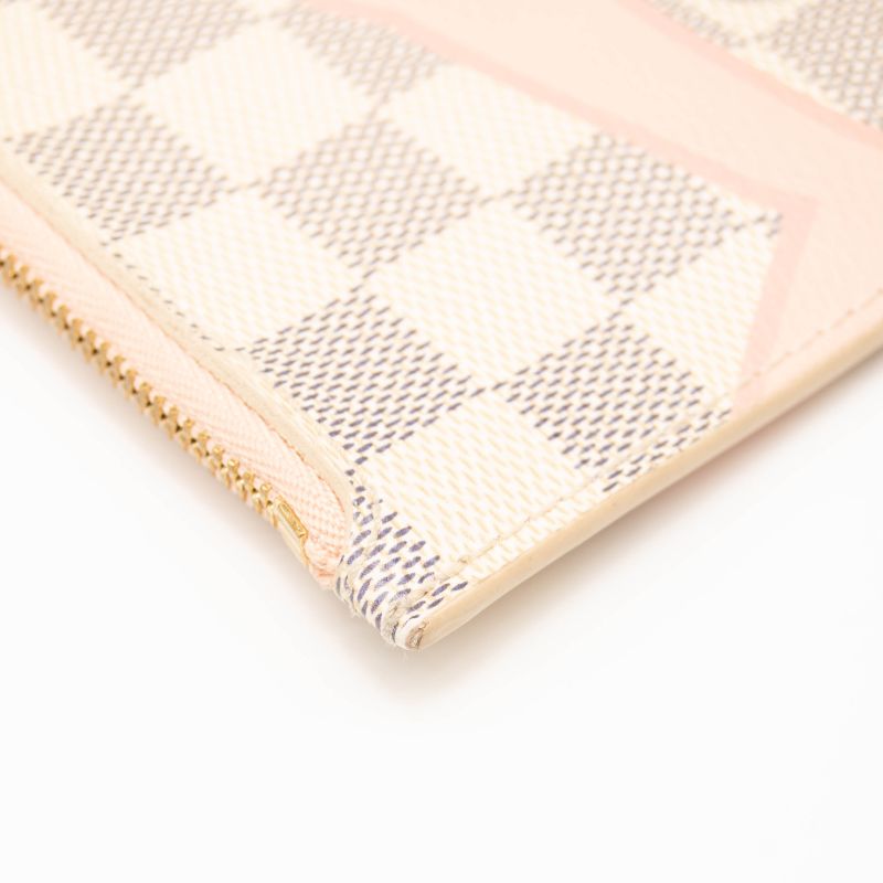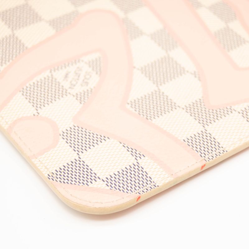 This is an authentic LOUIS VUITTON Damier Azur Tahitienne Neverfull MM GM Pochette. This stylish pochette is crafted of Damier blue and white checkered canvas, overlaid with a splashy pink monogram print adapted from the Louis Vuitton archives. The polished brass top zipper opens to a pink striped interior with a patch pocket.