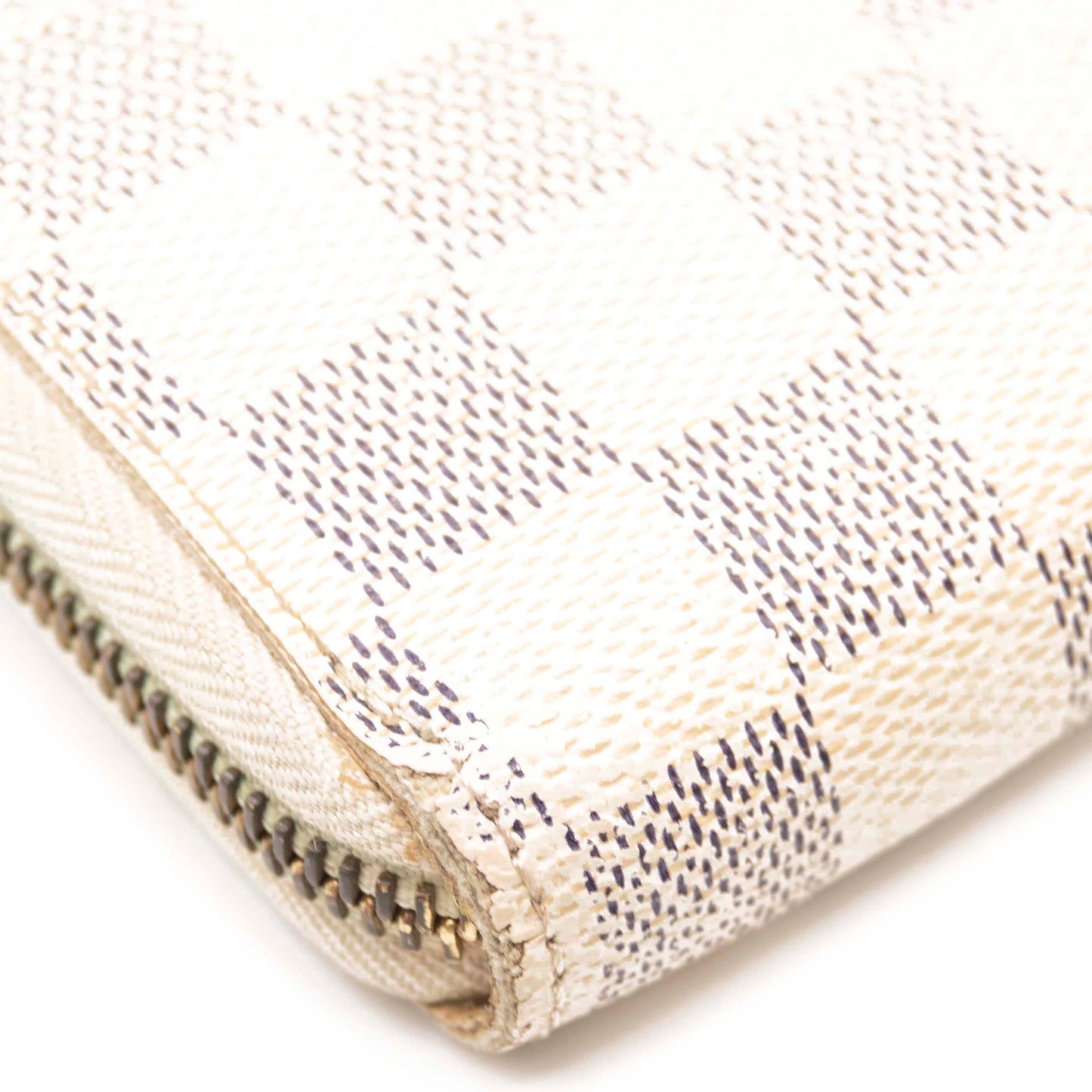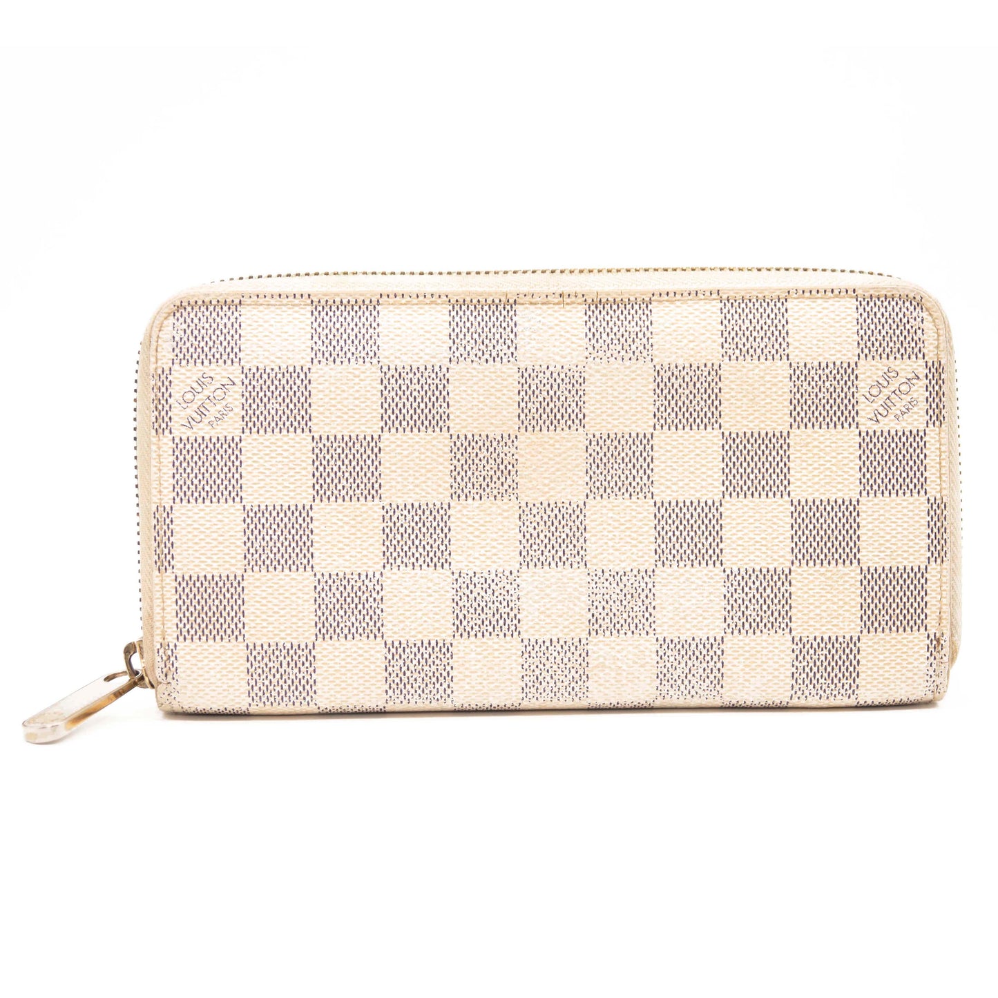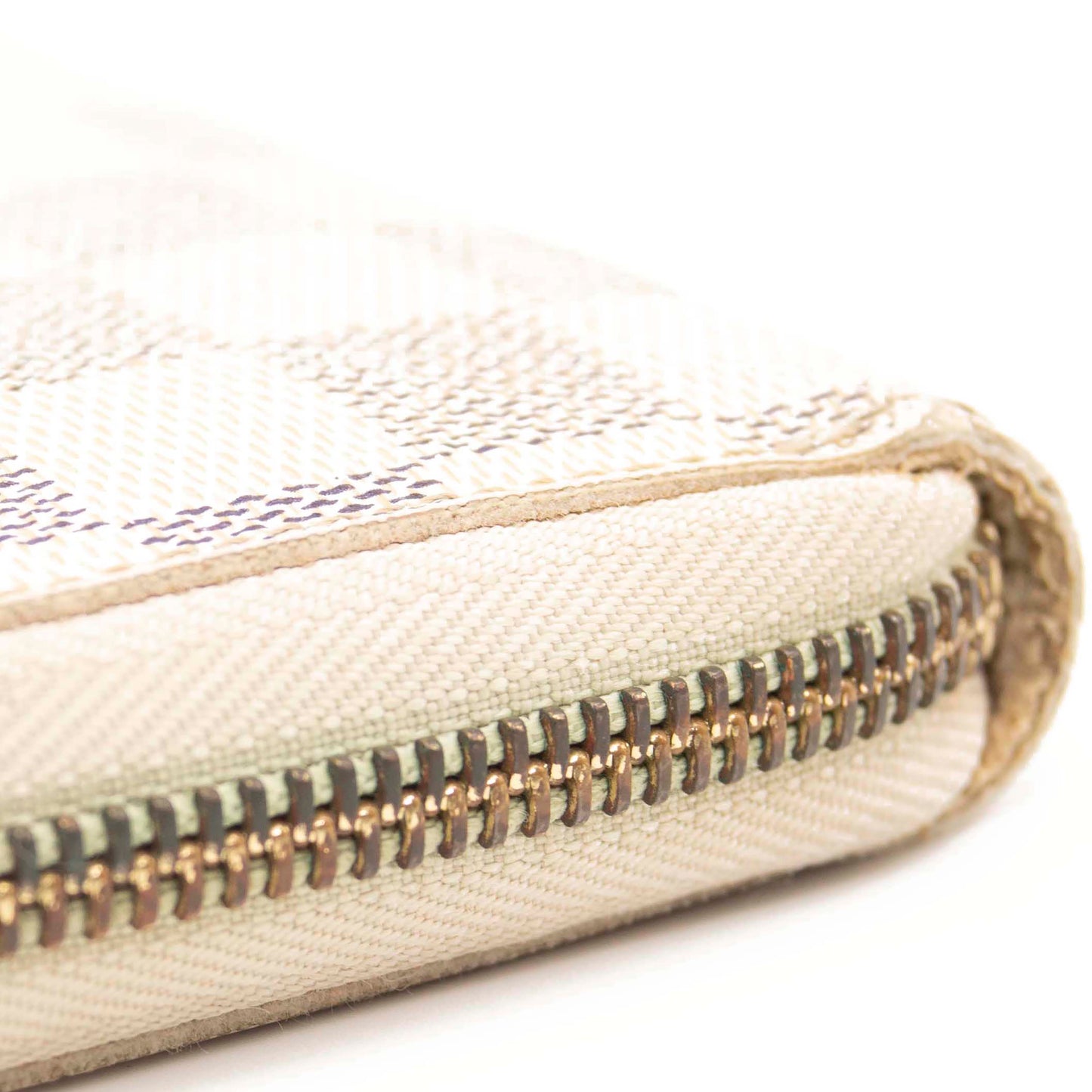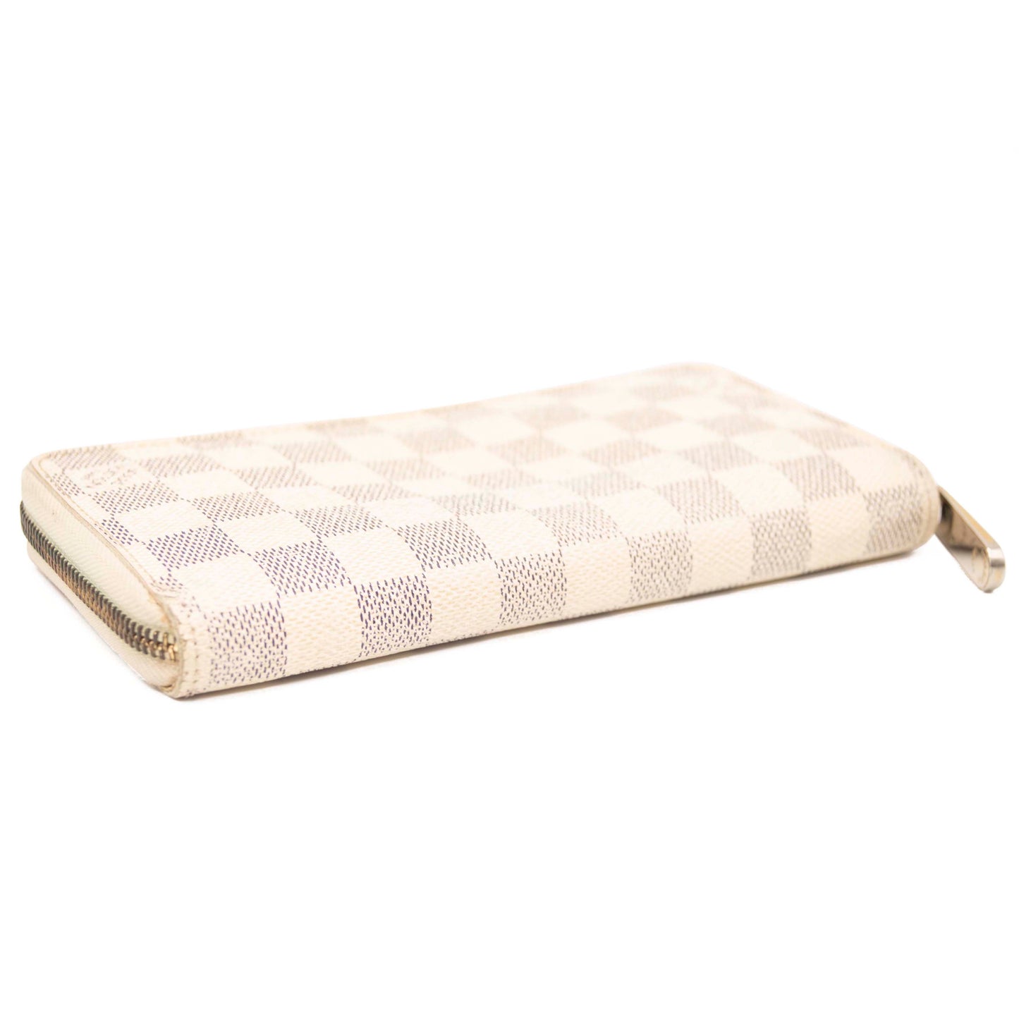 This is an authentic LOUIS VUITTON Damier Azur Zippy Wallet. This wallet is crafted of Louis Vuitton's signature Damier check canvas in white. The wallet features a polished gold wrap-around zipper that opens to a partitioned cream cross-grain leather interior with card slots, patch pockets, and a zipper compartment.