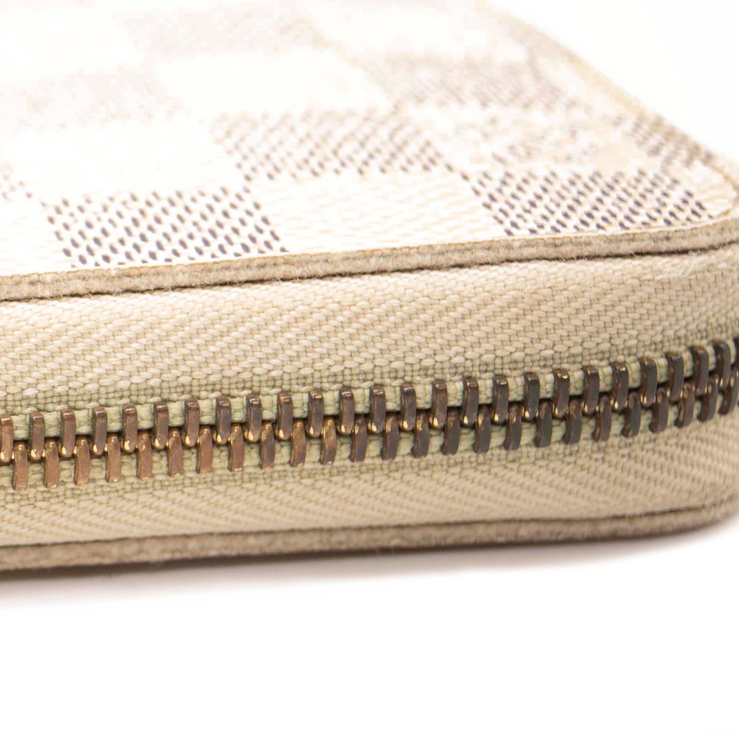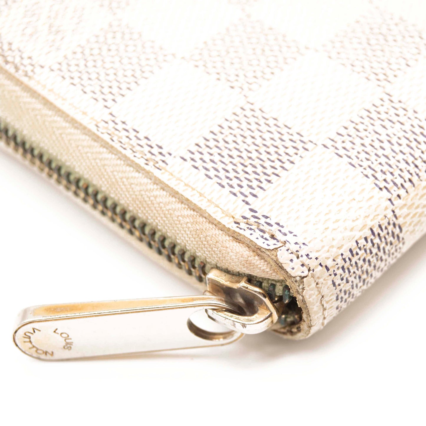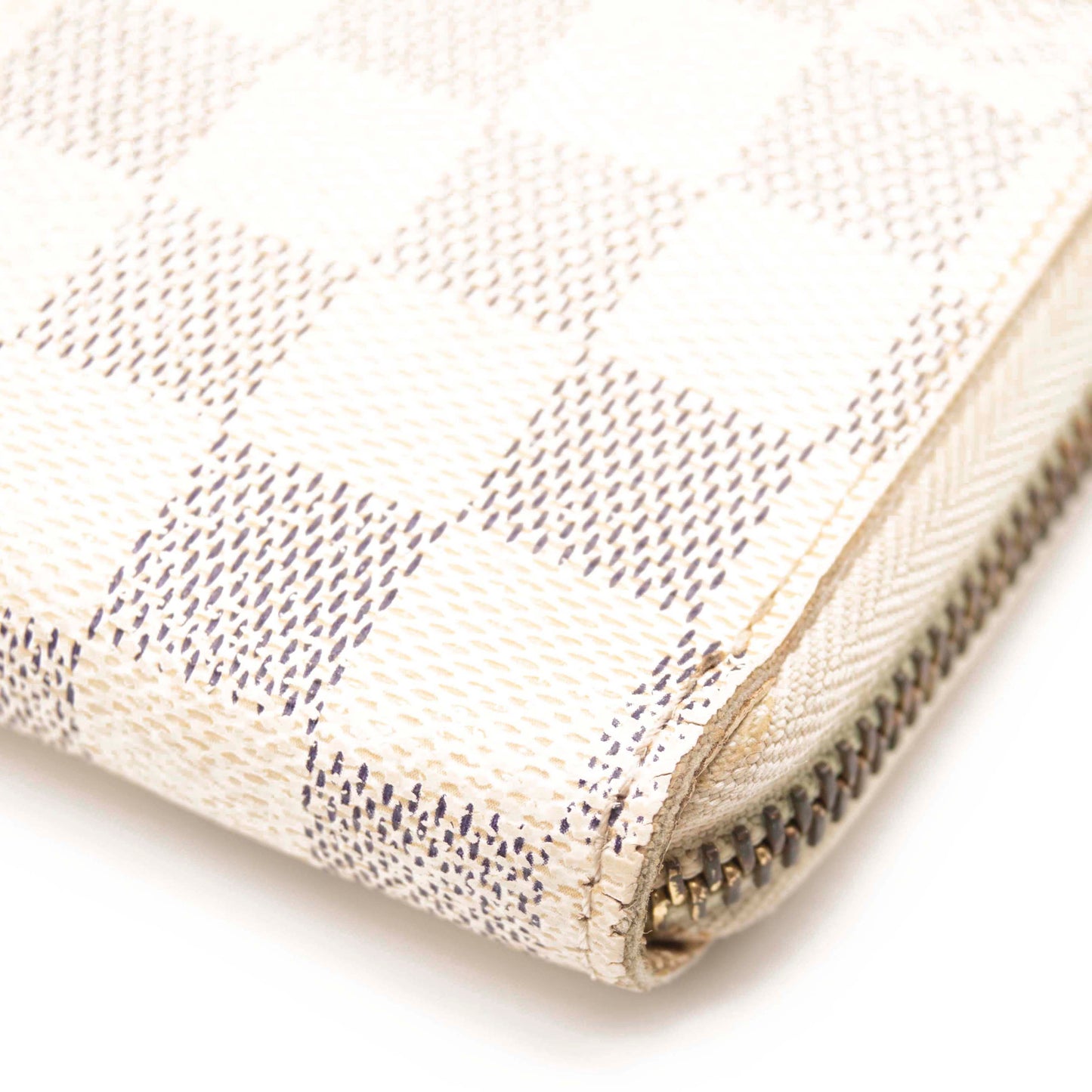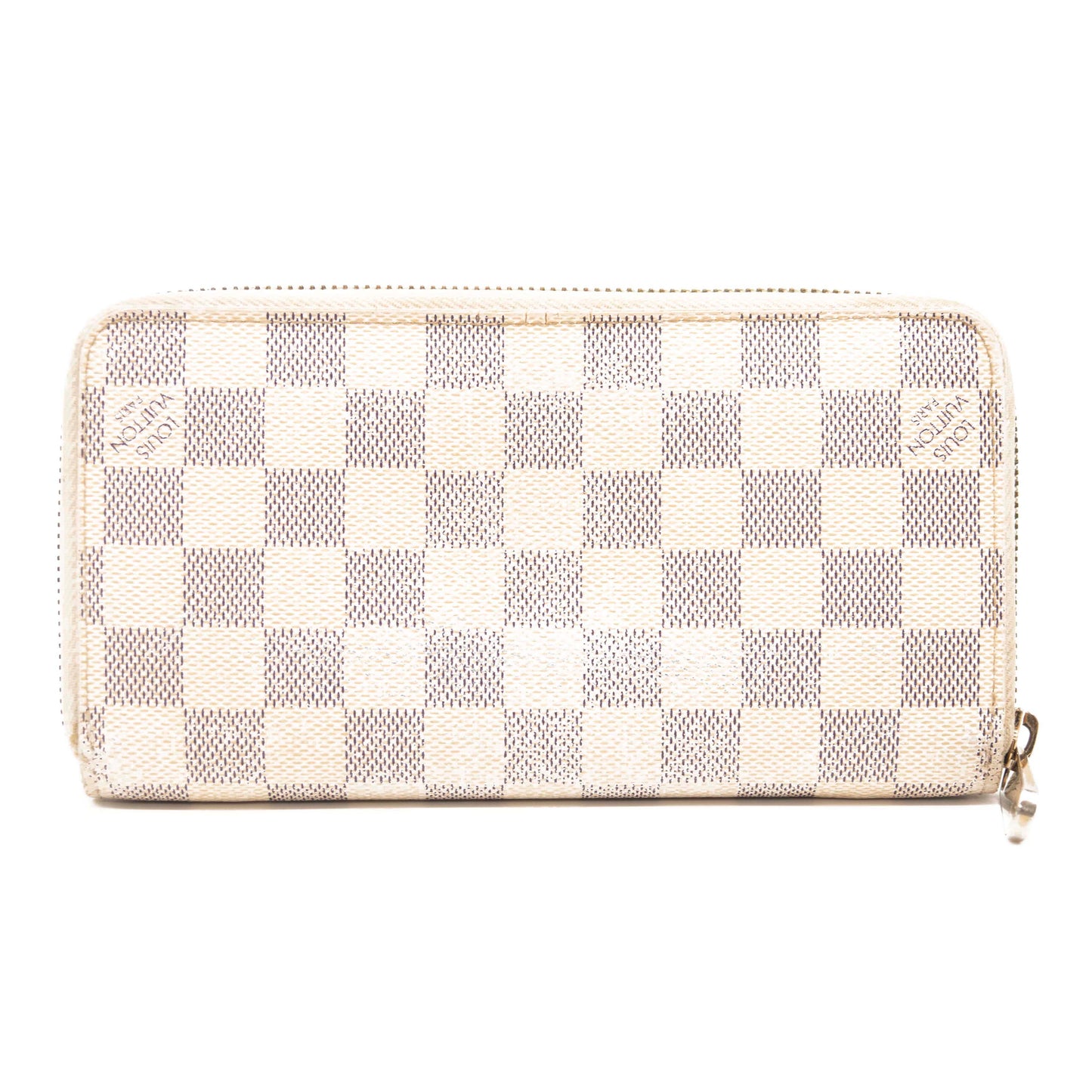 This is an authentic LOUIS VUITTON Damier Azur Zippy Wallet. This wallet is crafted of Louis Vuitton's signature Damier check canvas in white. The wallet features a polished gold wrap-around zipper that opens to a partitioned cream cross-grain leather interior with card slots, patch pockets, and a zipper compartment.
