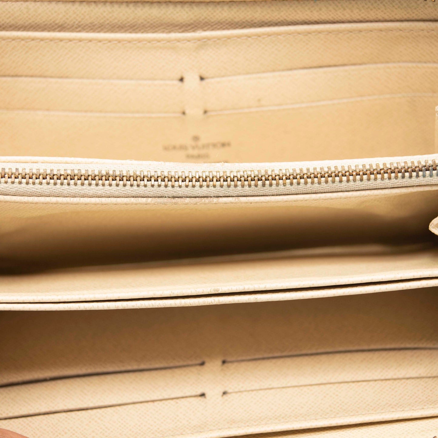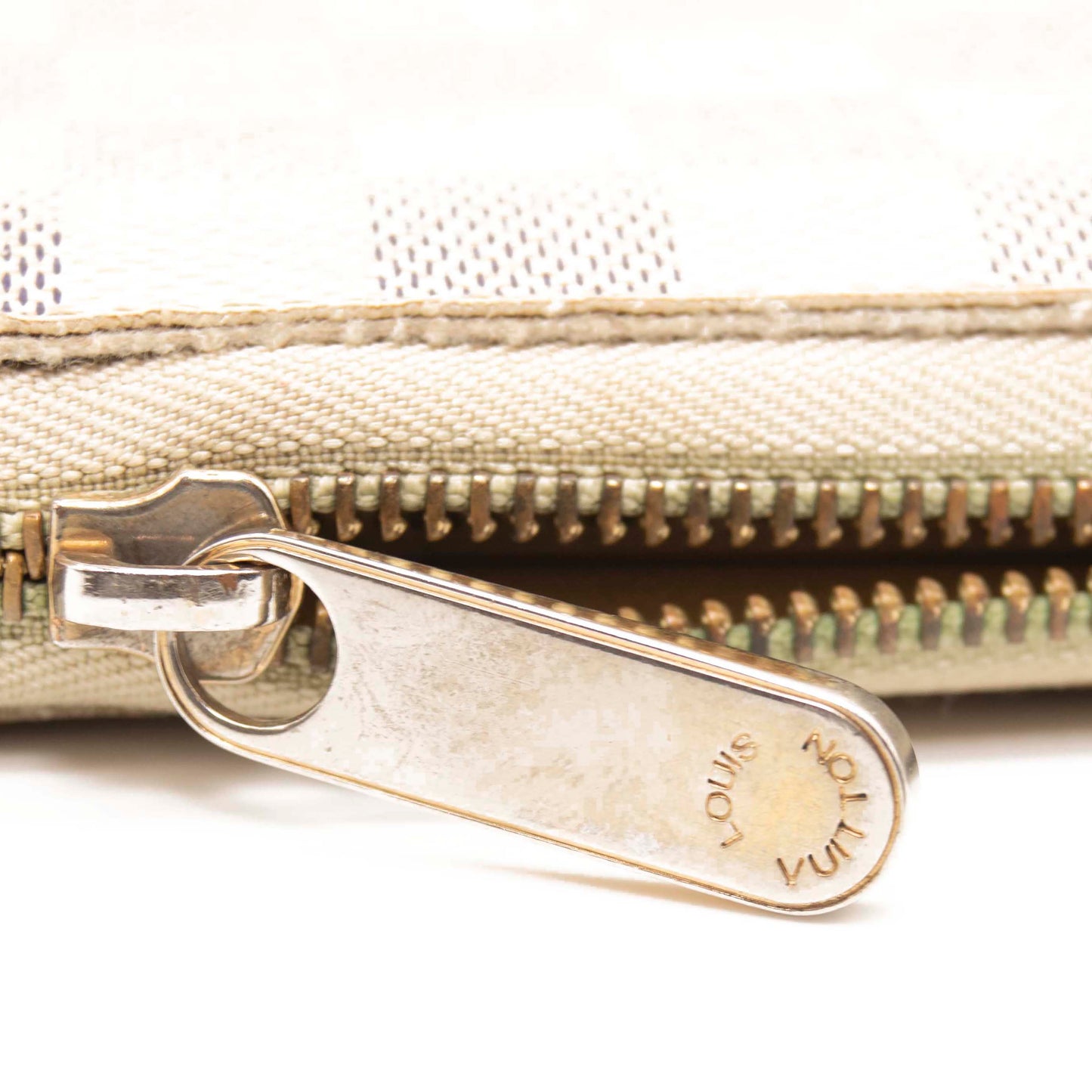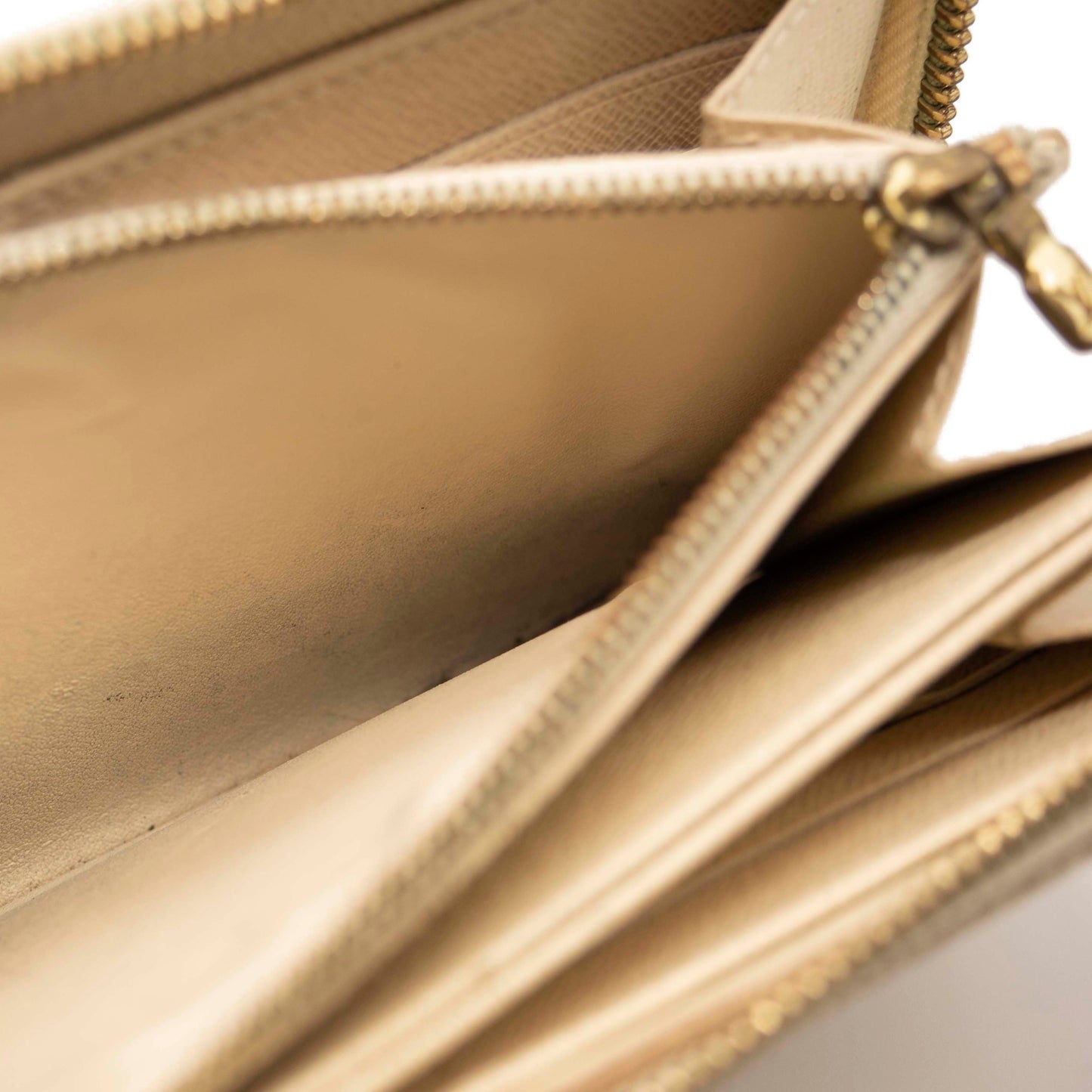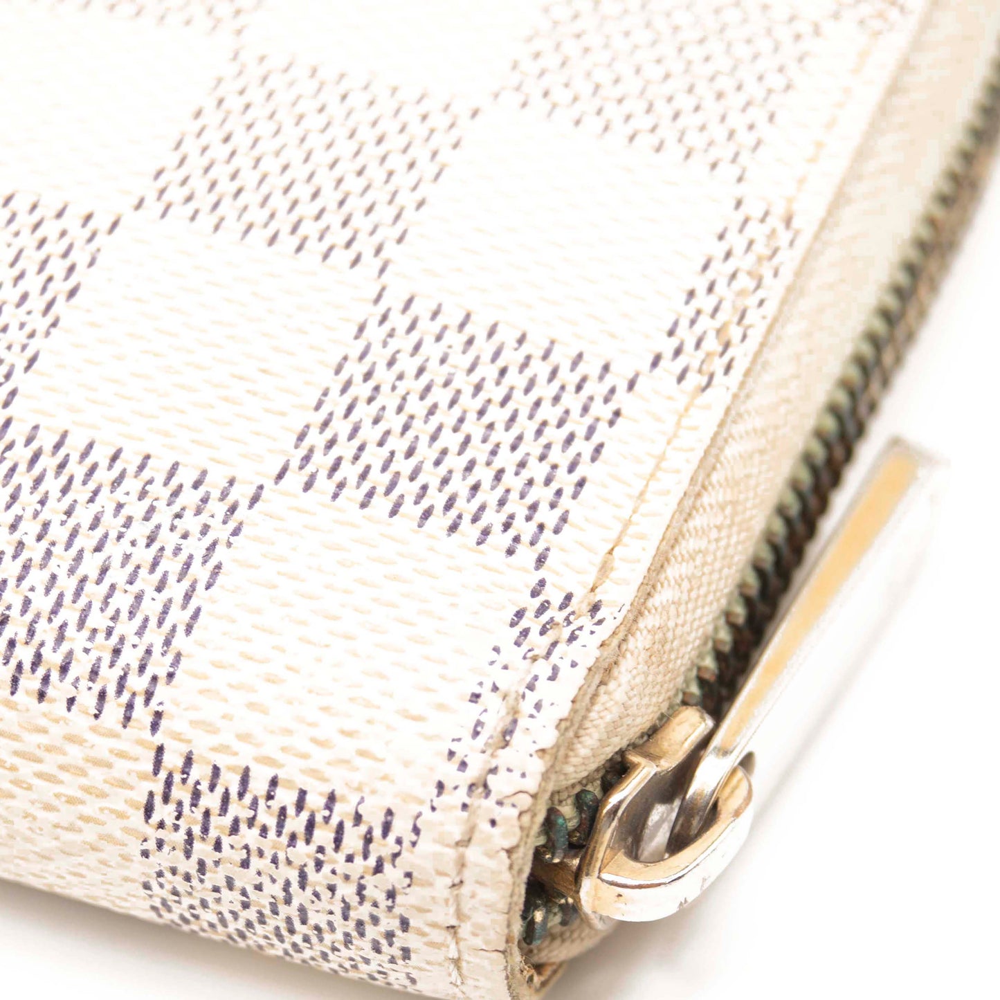 This is an authentic LOUIS VUITTON Damier Azur Zippy Wallet. This wallet is crafted of Louis Vuitton's signature Damier check canvas in white. The wallet features a polished gold wrap-around zipper that opens to a partitioned cream cross-grain leather interior with card slots, patch pockets, and a zipper compartment.