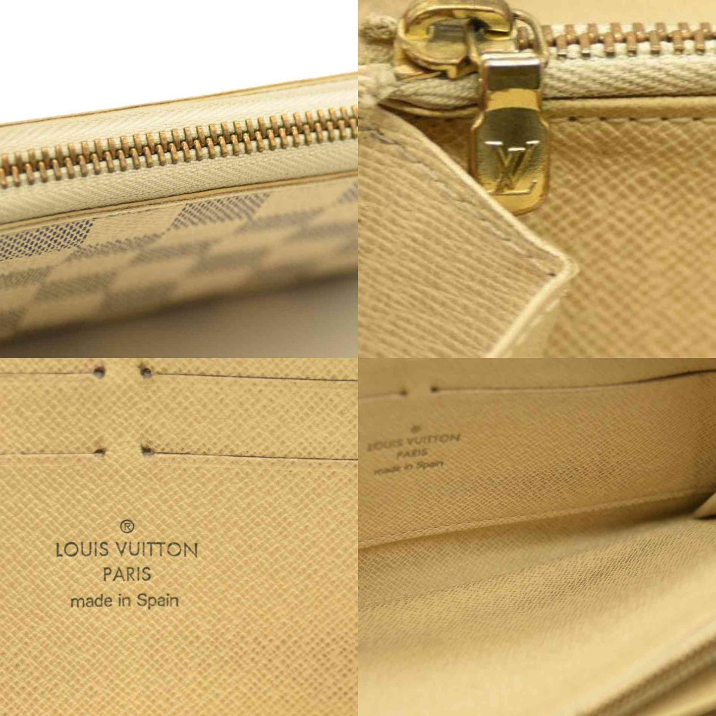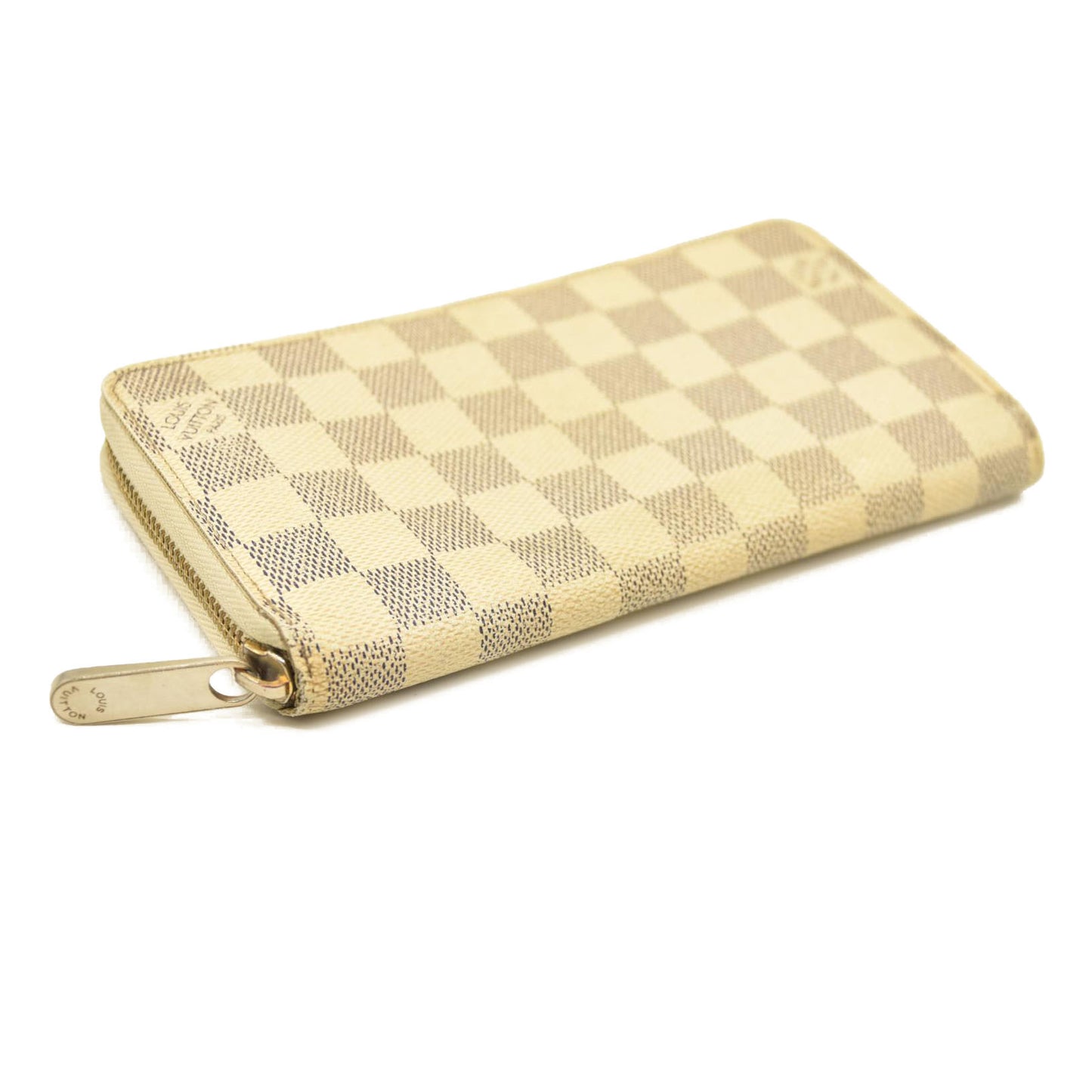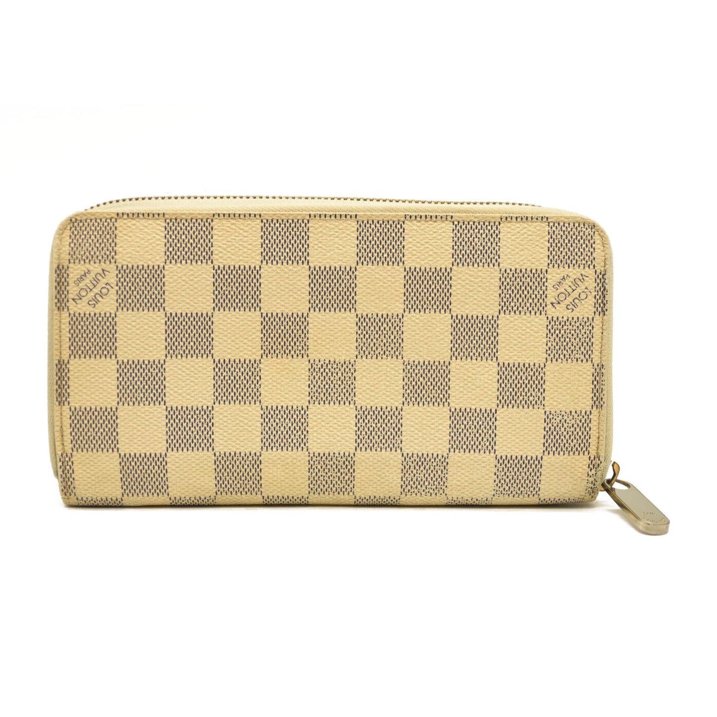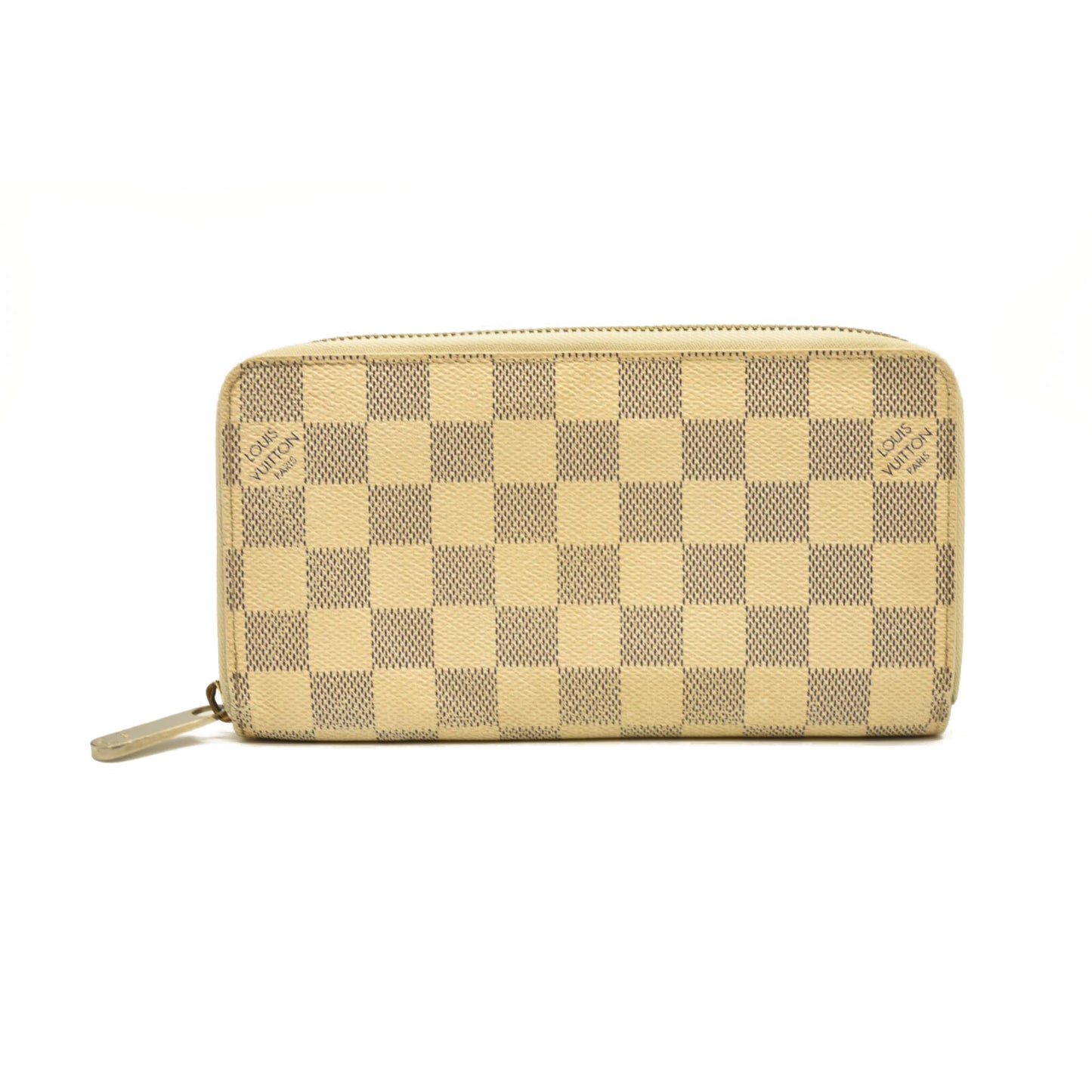 This is an authentic LOUIS VUITTON Damier Azur Zippy Wallet. This stylish wallet is crafted of azur blue Louis Vuitton Damier checkered pattern on toile canvas. The wallet has a 3/4 wrap-around polished gold plated zipper that opens to an ivory leather interior with a center zipper pocket and card slots.