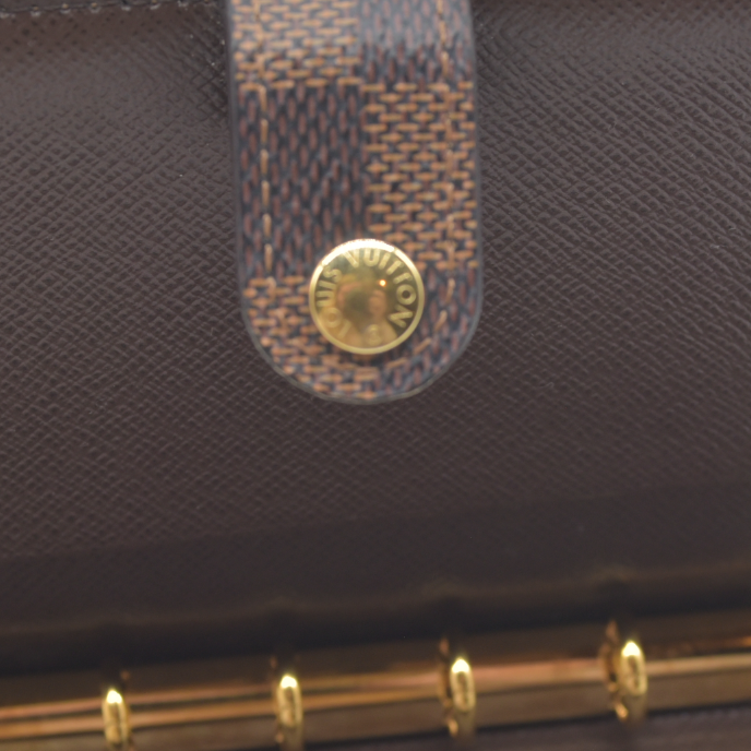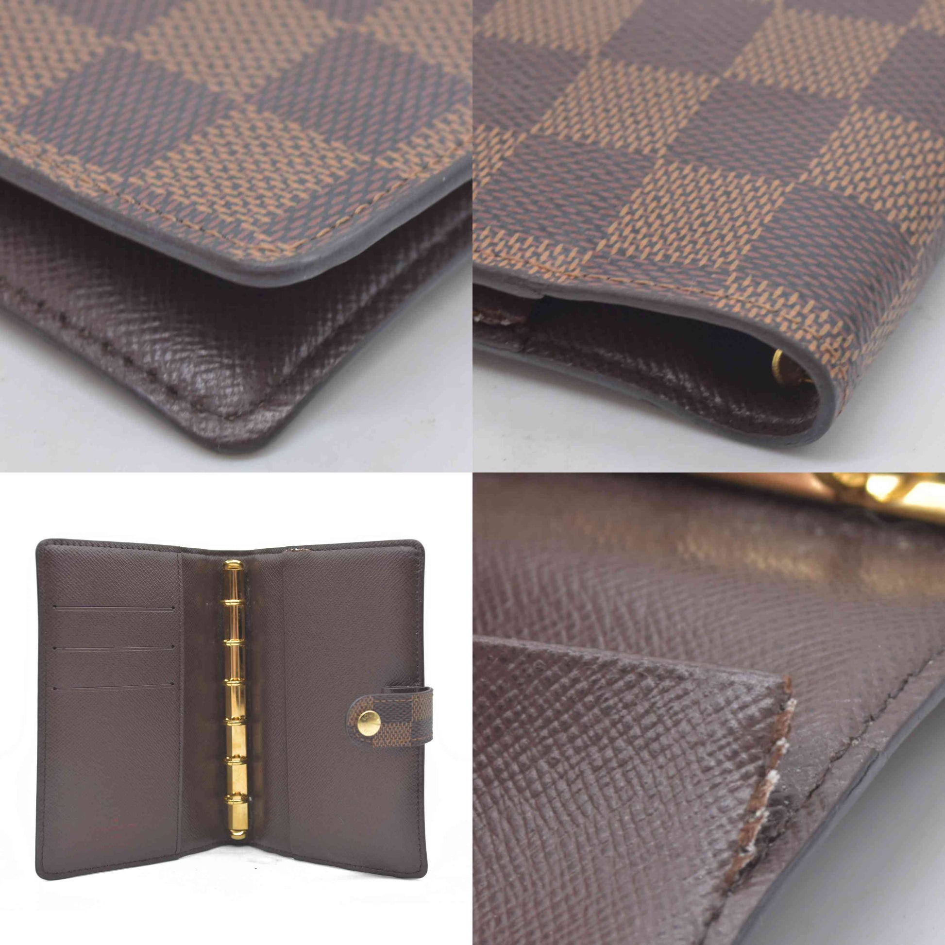 Brown coated canvas Louis Vuitton Damier Ebene Small Ring agenda cover with gold-tone hardware, tonal leather interior, double slit pocket, 3 card slots, brand stamp at interior, pen loop, and snap closure at front.