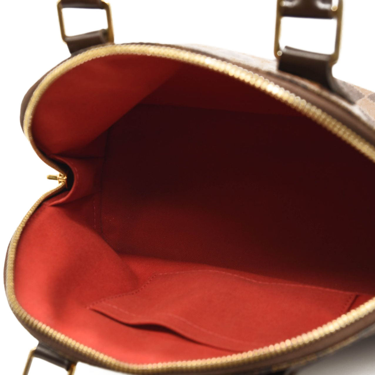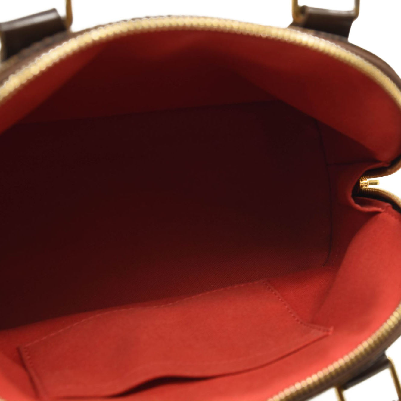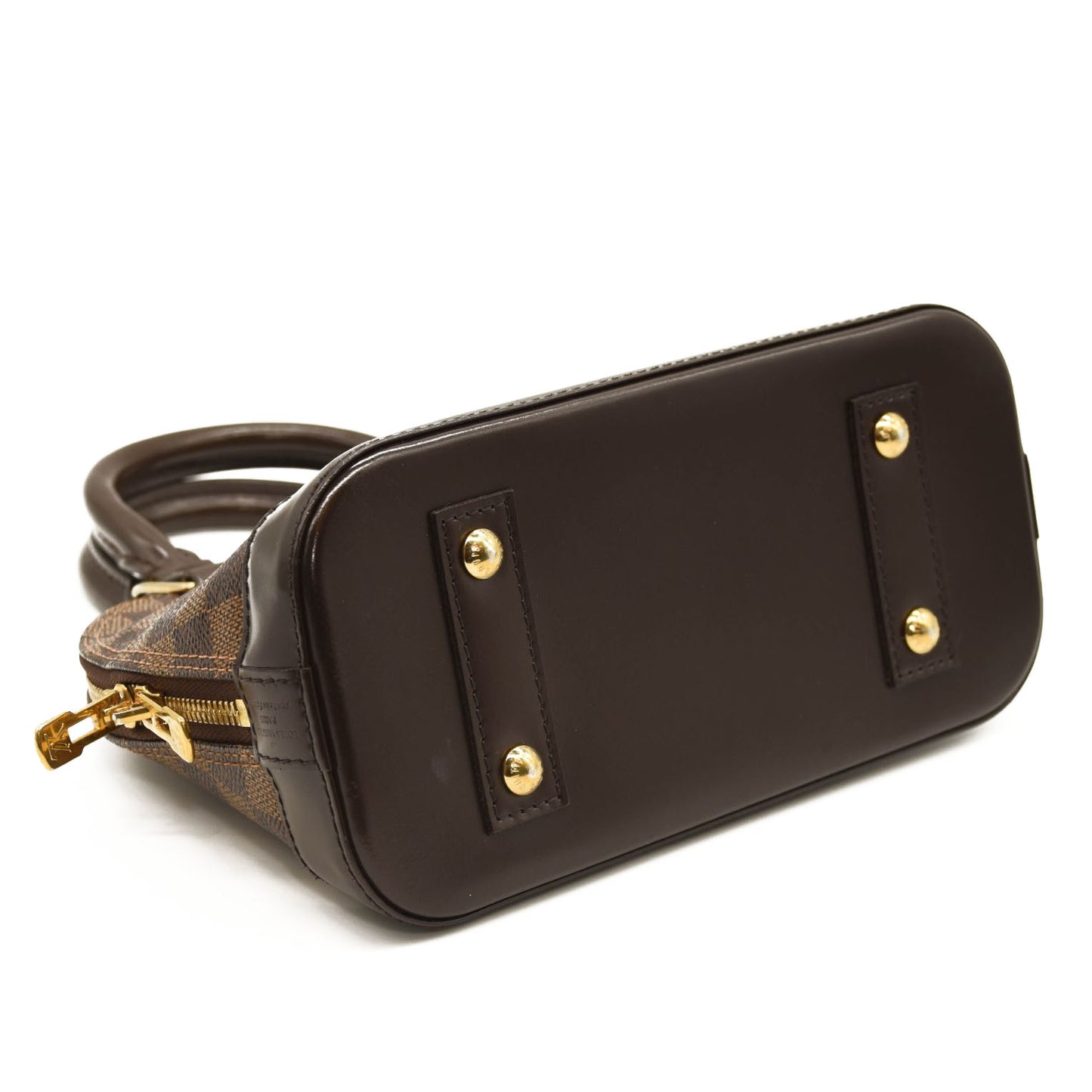 This is an authentic LOUIS VUITTON Damier Ebene Alma BB. This mini bowling style tote is crafted of Louis Vuitton signature checked coated canvas. The bag features extensive brown polished cowhide leather including a solid base, rolled leather top handles and trim, a clochette for keys and brass hardware including a padlock. The top zippers open to a red fabric interior with a flat pocket. This sophisticated bag is suitable for everyday use, by Louis Vuitton!