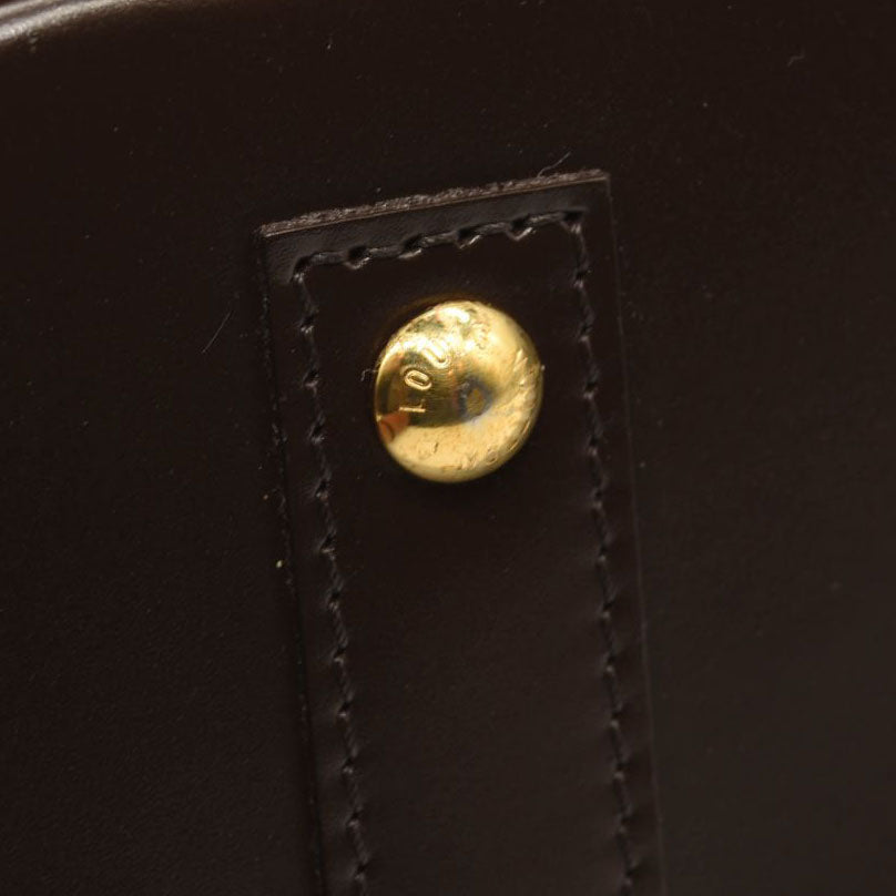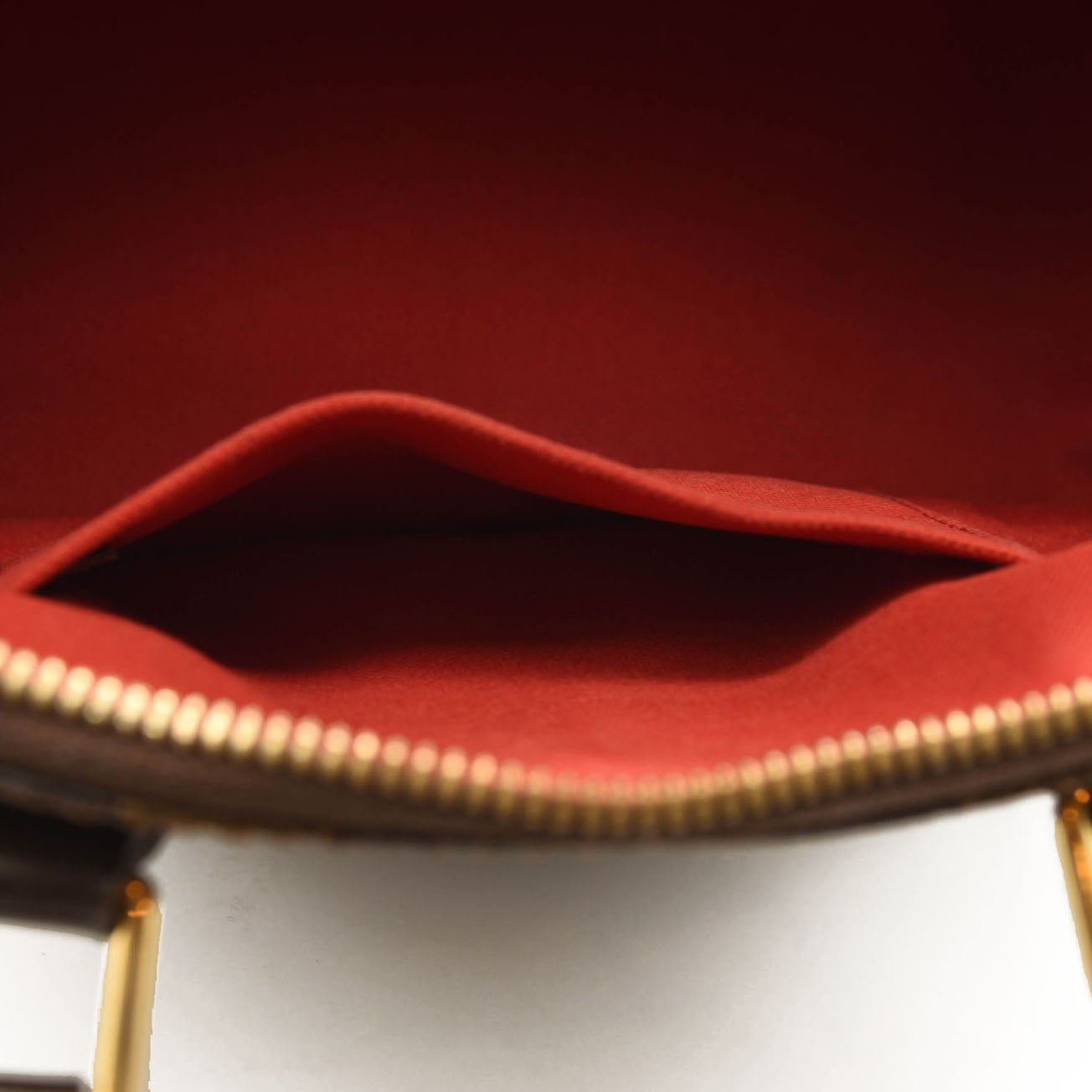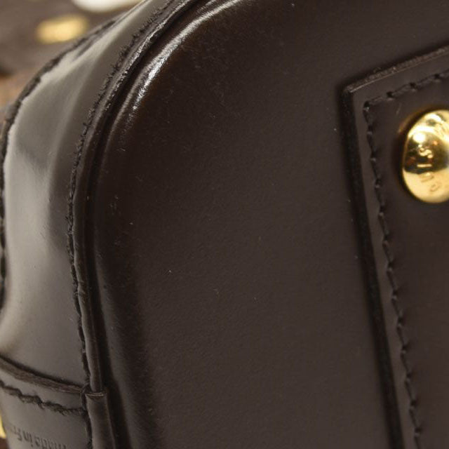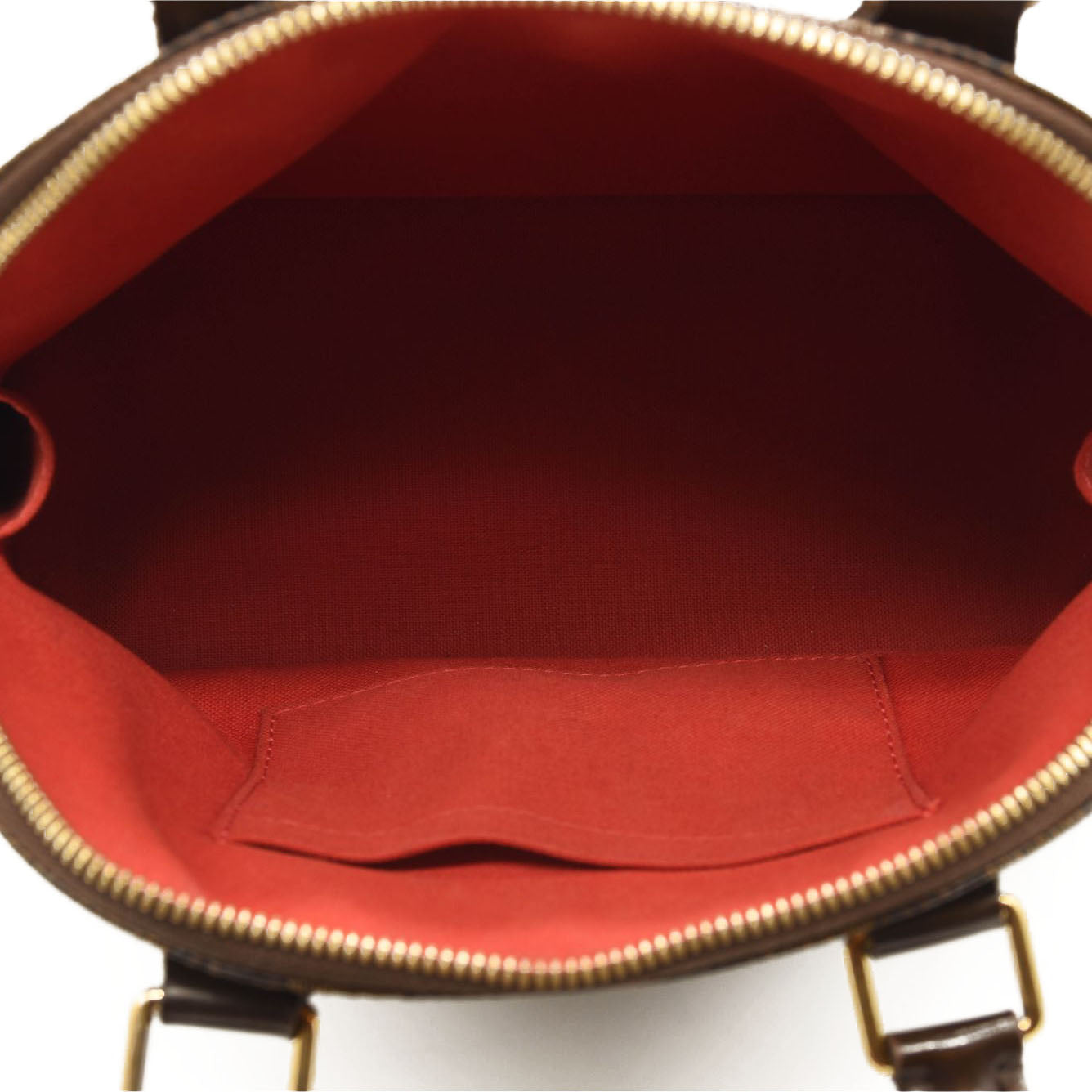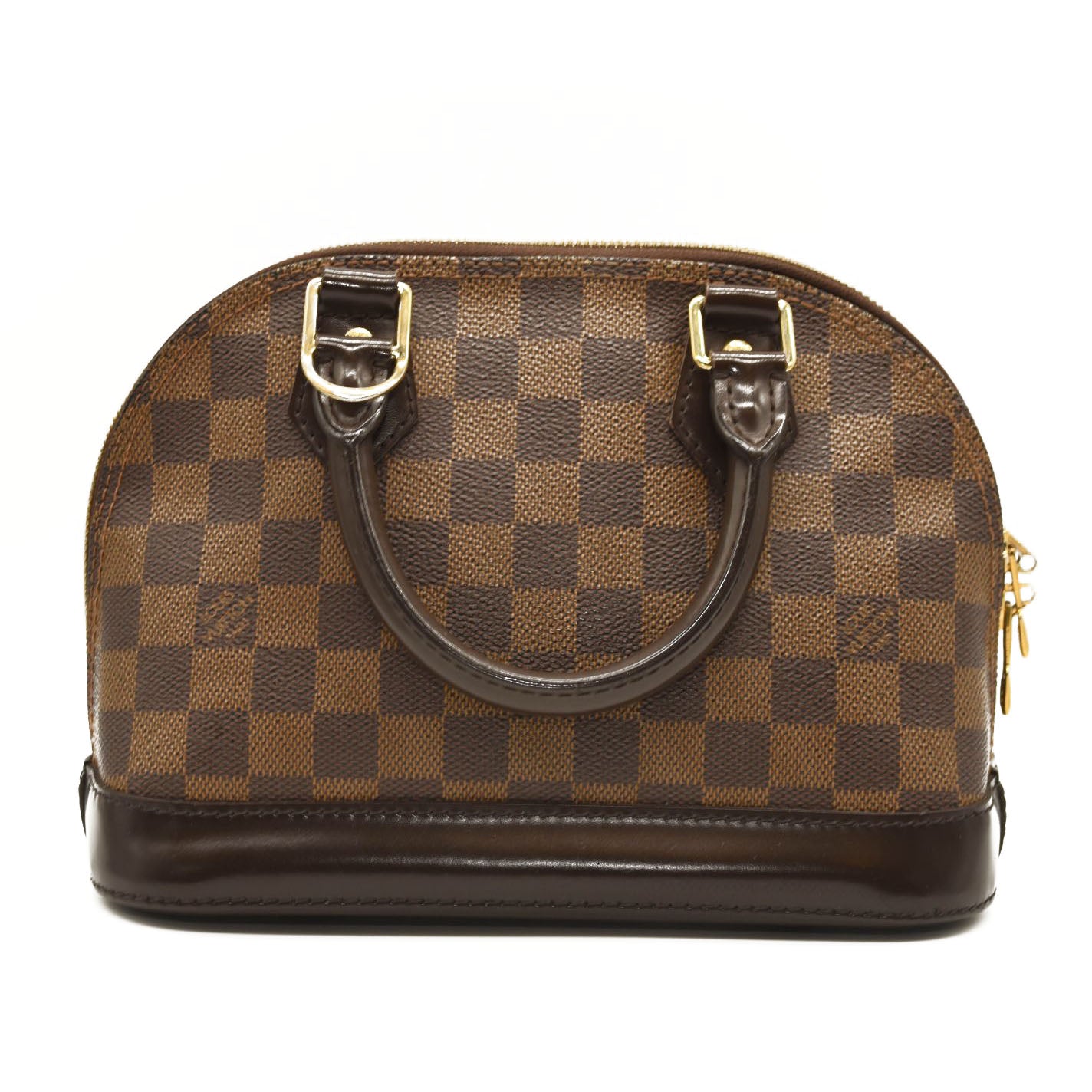 This is an authentic LOUIS VUITTON Damier Ebene Alma BB. This mini bowling style tote is crafted of Louis Vuitton signature checked coated canvas. The bag features extensive brown polished cowhide leather including a solid base, rolled leather top handles and trim, a clochette for keys and brass hardware including a padlock. The top zippers open to a red fabric interior with a flat pocket. This sophisticated bag is suitable for everyday use, by Louis Vuitton!