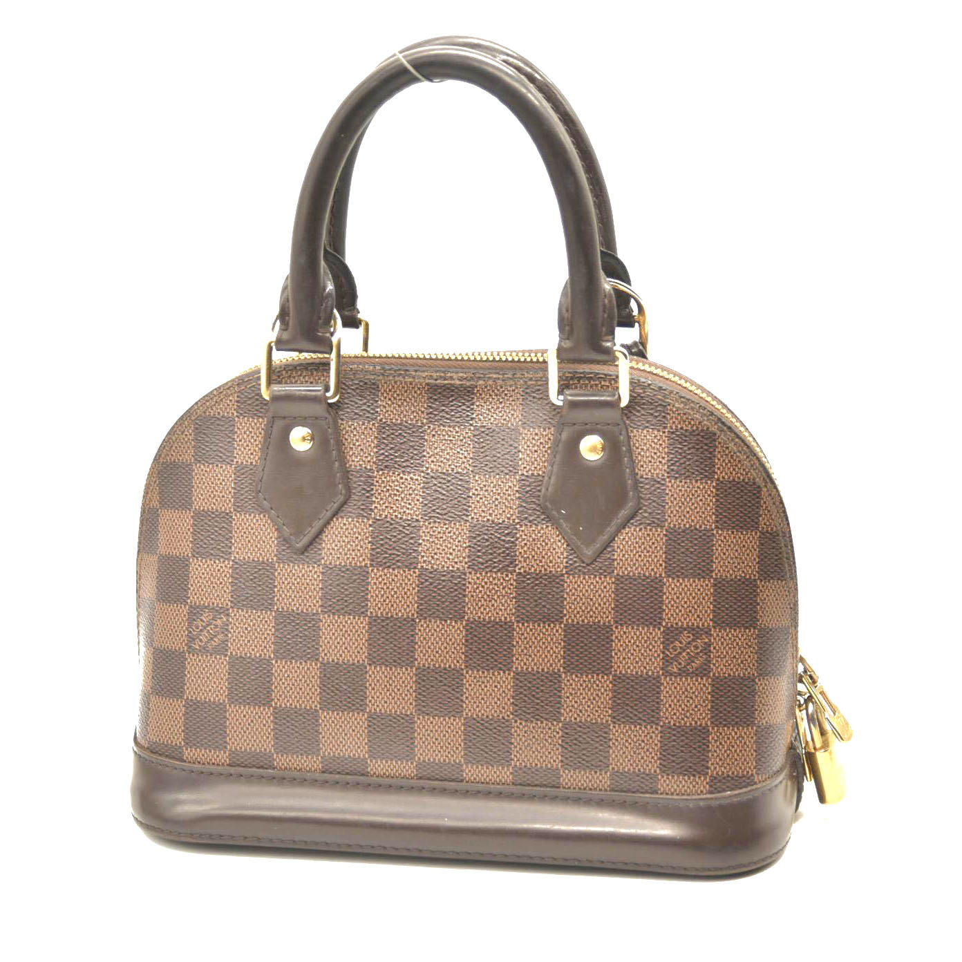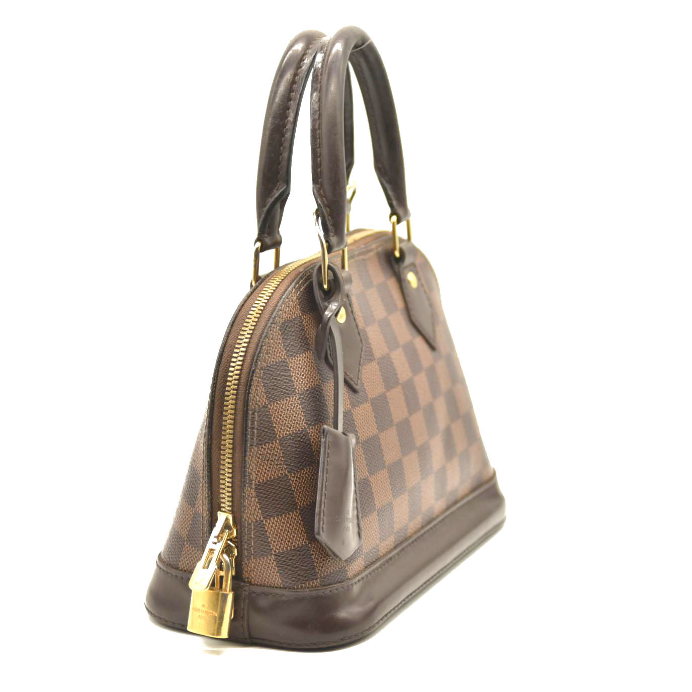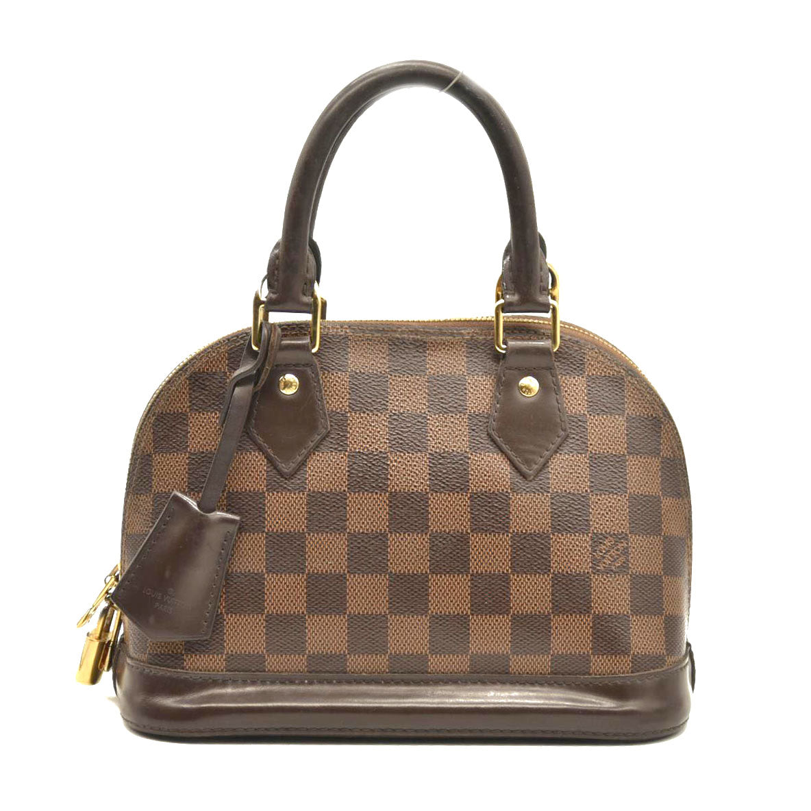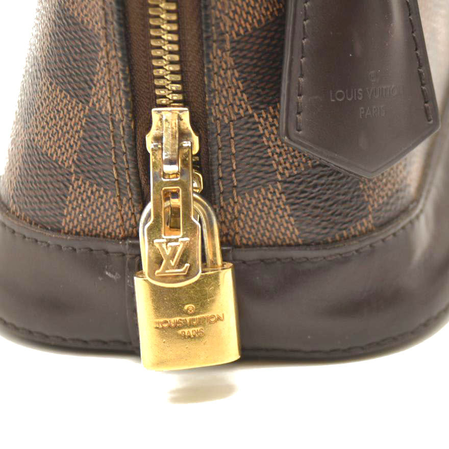 This is an authentic LOUIS VUITTON Damier Ebene Alma BB. This mini bowling style tote is crafted of Louis Vuitton signature checked coated canvas. The bag features extensive brown polished cowhide leather including a solid base, rolled leather top handles and trim, a clochette for keys and brass hardware including a padlock. The top zippers open to a red fabric interior with a flat pocket. This sophisticated bag is suitable for everyday use, by Louis Vuitton!