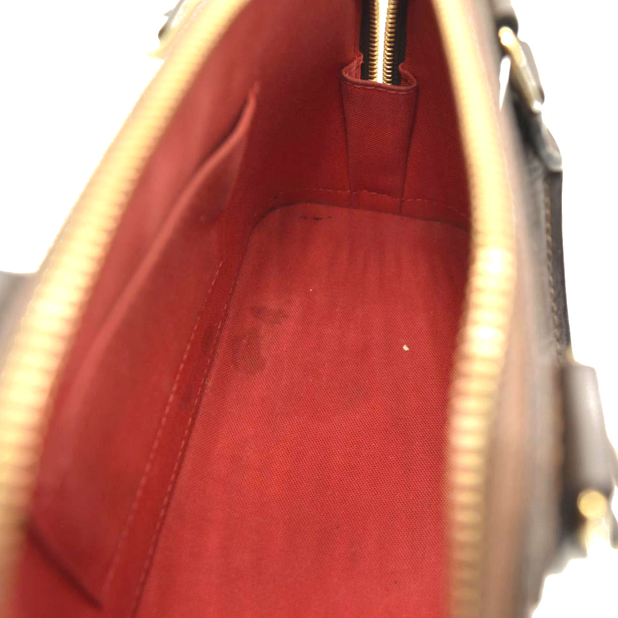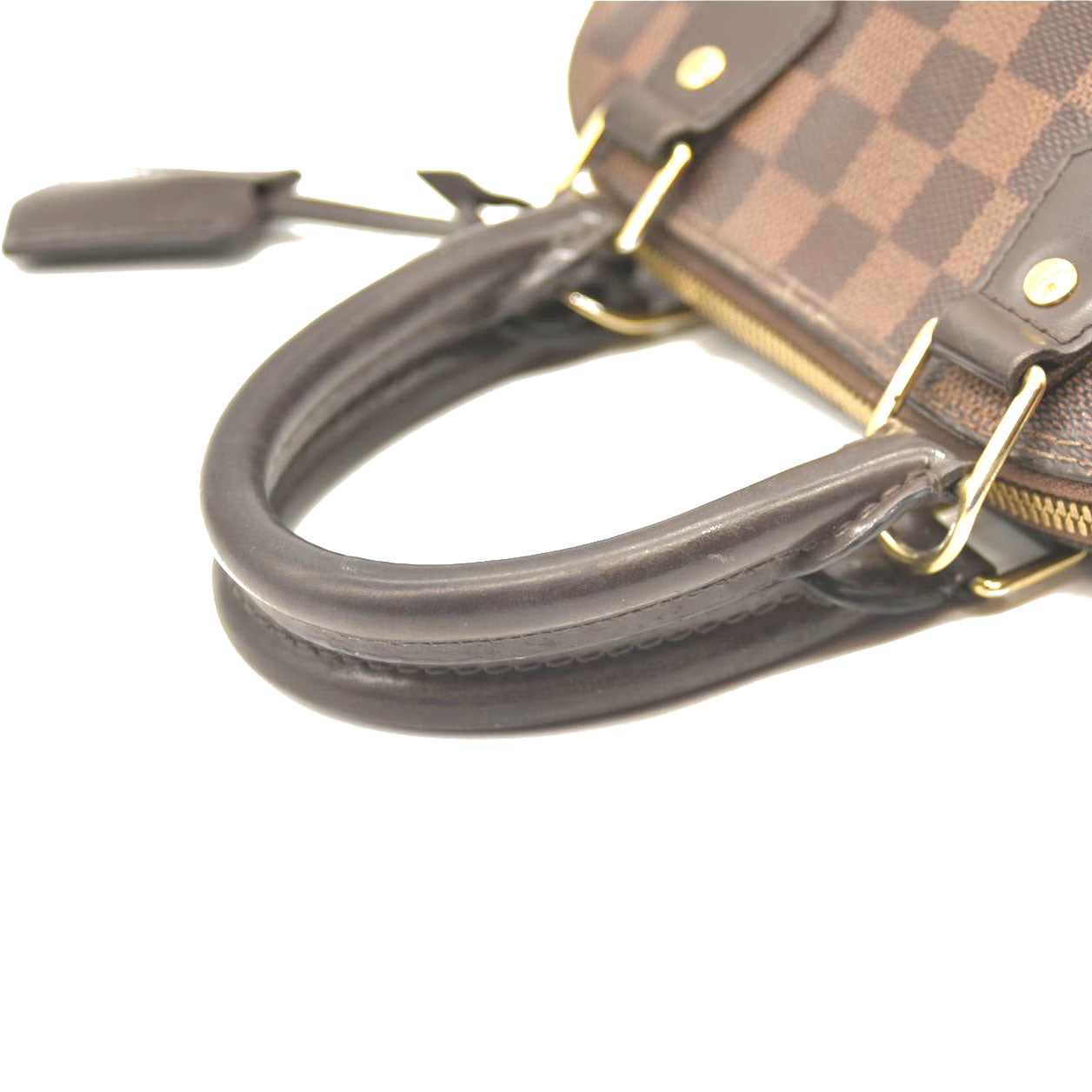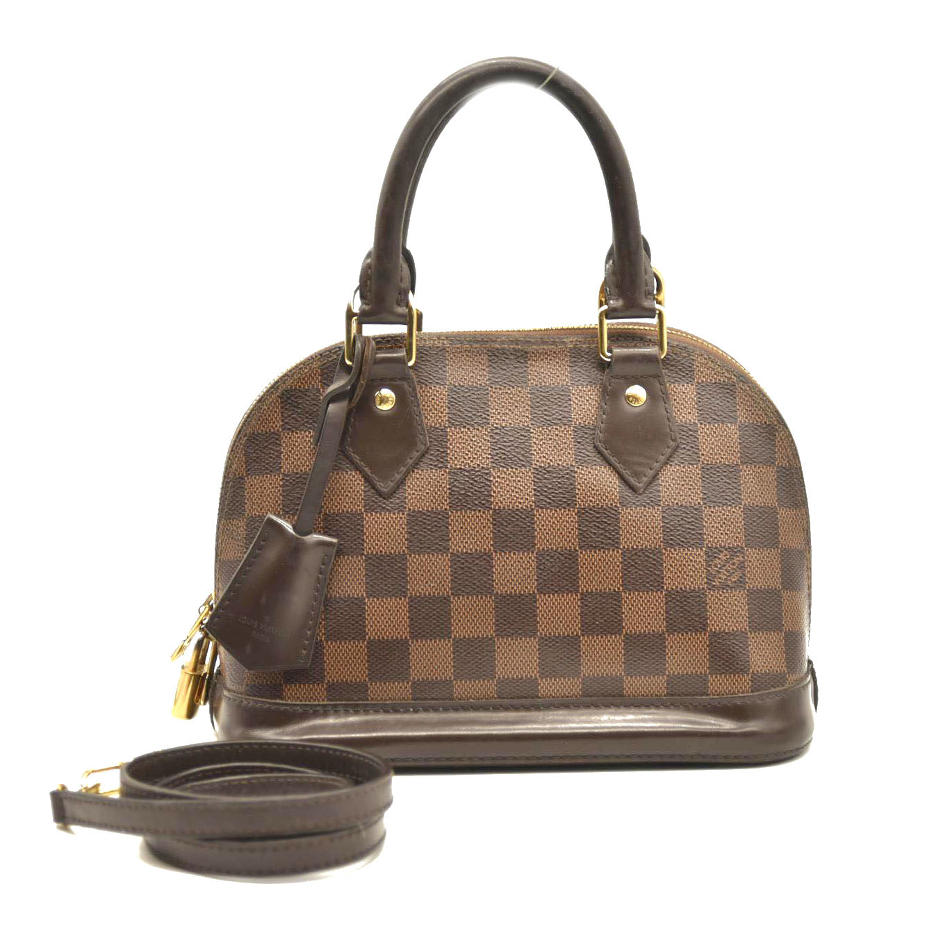 This is an authentic LOUIS VUITTON Damier Ebene Alma BB. This mini bowling style tote is crafted of Louis Vuitton signature checked coated canvas. The bag features extensive brown polished cowhide leather including a solid base, rolled leather top handles and trim, a clochette for keys and brass hardware including a padlock. The top zippers open to a red fabric interior with a flat pocket. This sophisticated bag is suitable for everyday use, by Louis Vuitton!