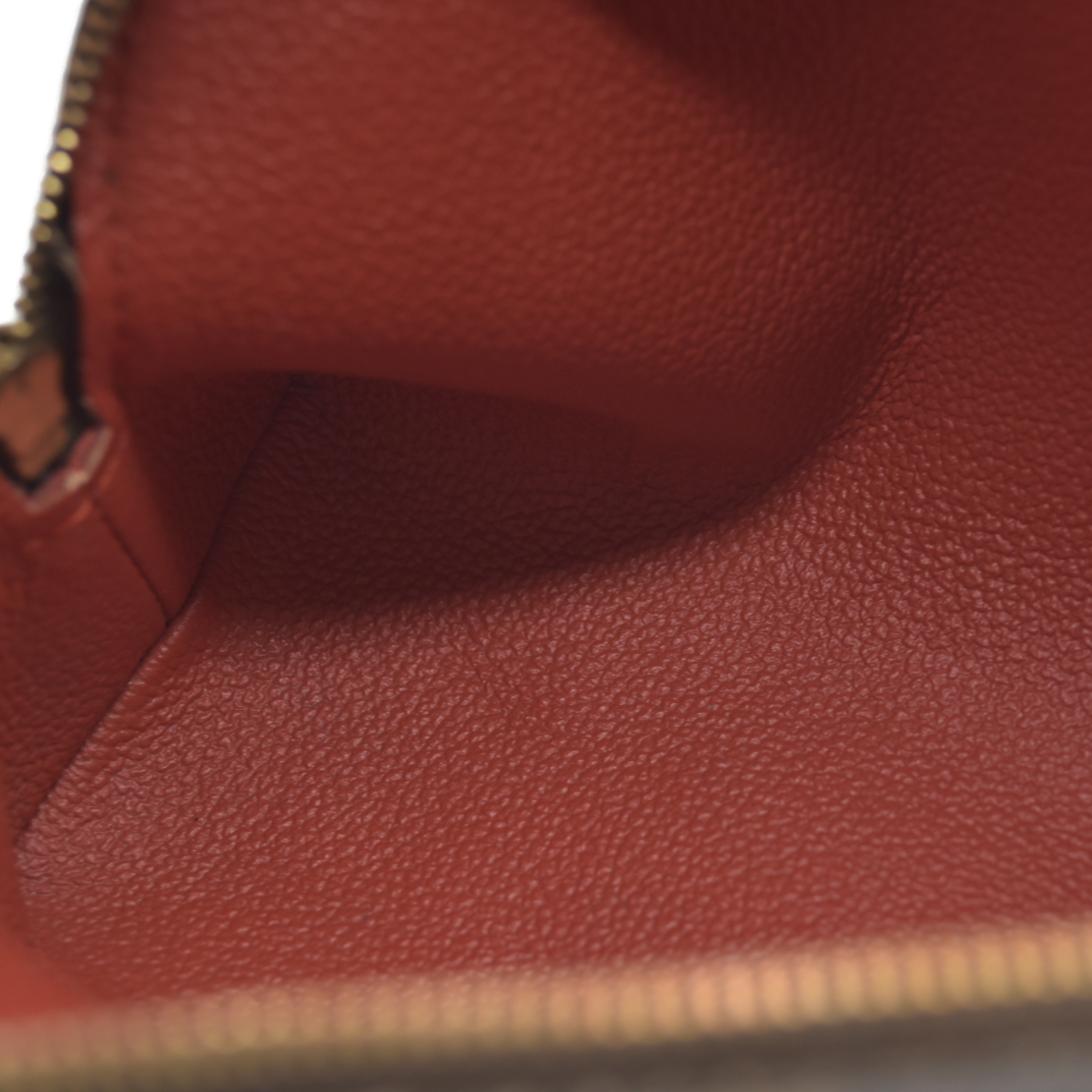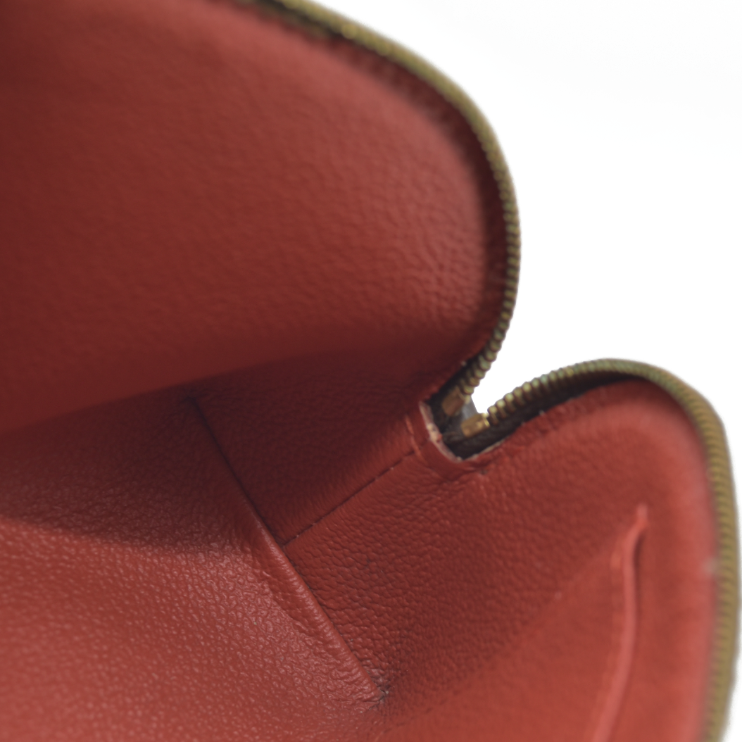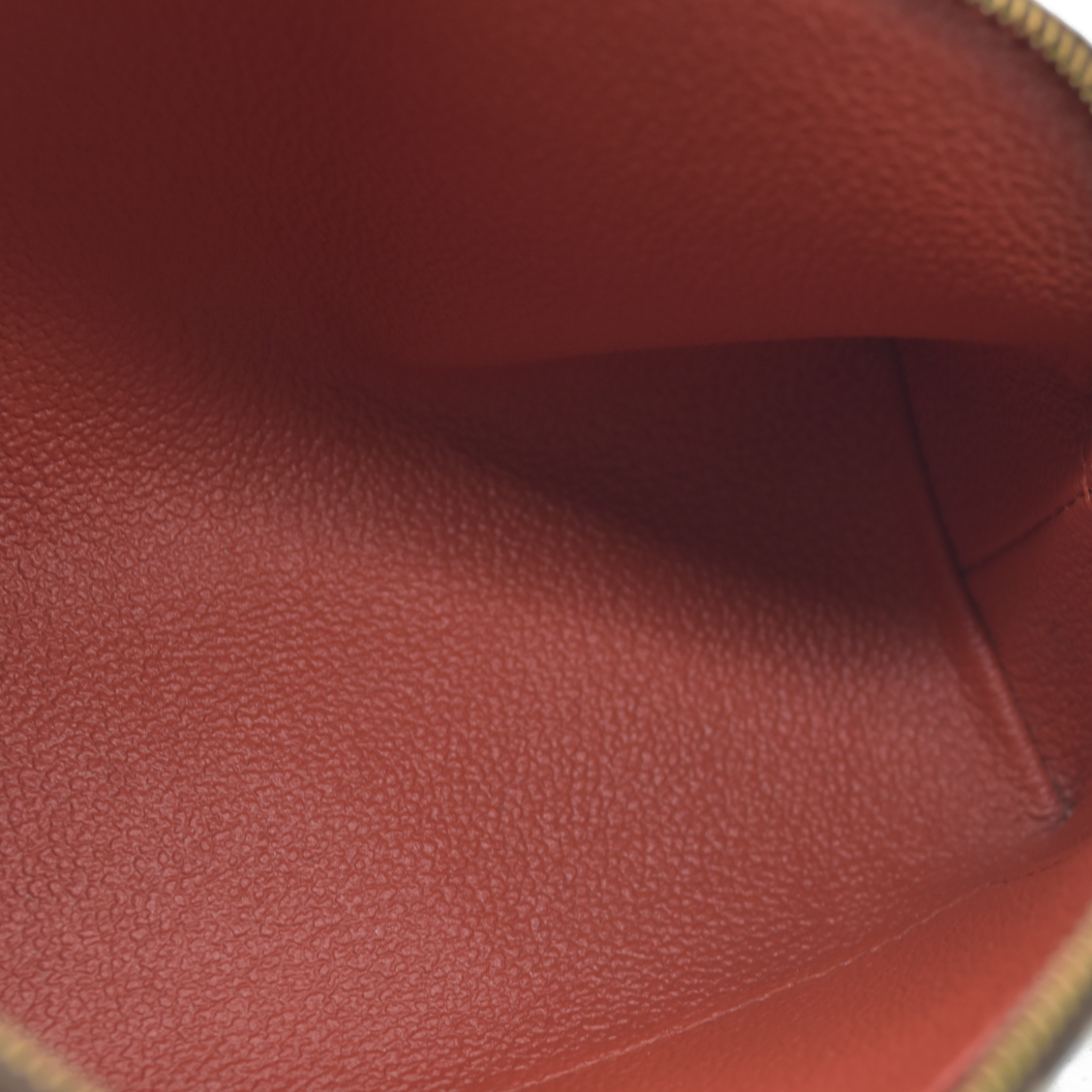 This is an authentic LOUIS VUITTON Damier Ebene Cosmetic Pouch. This chic cosmetic case is crafted of Damier checked coated canvas. The bag unzips to a red leather-like interior with a small patch pocket.