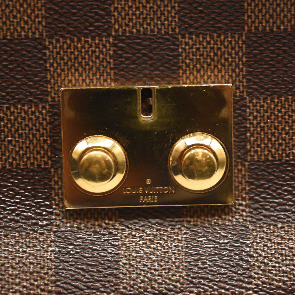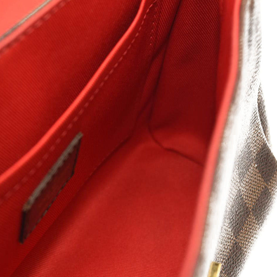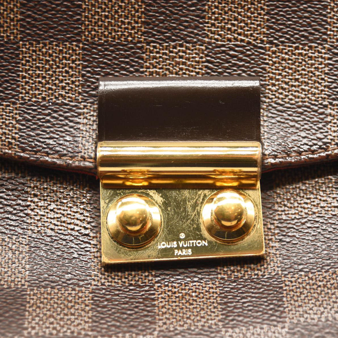 This is an authentic LOUIS VUITTON Damier Ebene Croisette. This compact tote is crafted of Louis Vuitton Damier checkered canvas in brown. This bag features a removable tassel, signature ebene cowhide leather trim, a top handle, and an optional shoulder strap. The bag has a flap secured by a brass S-lock and opens to a rouge red fabric interior with a patch pocket.
