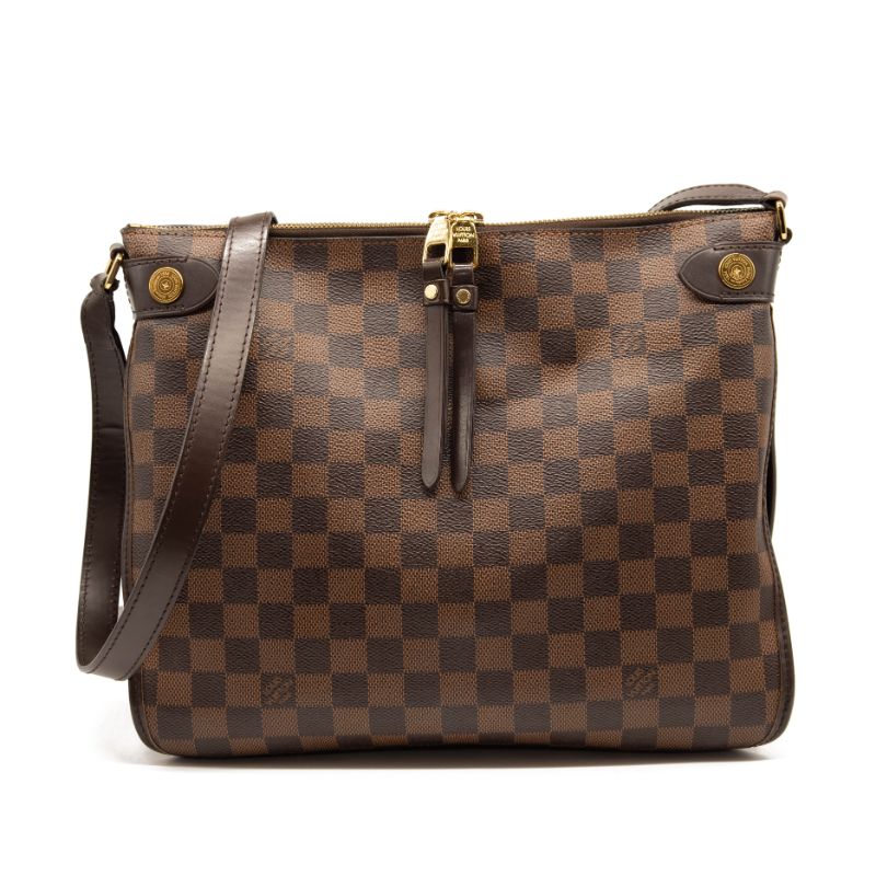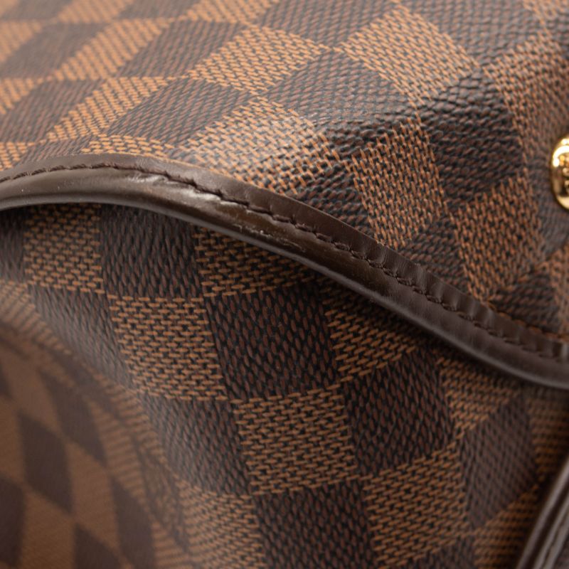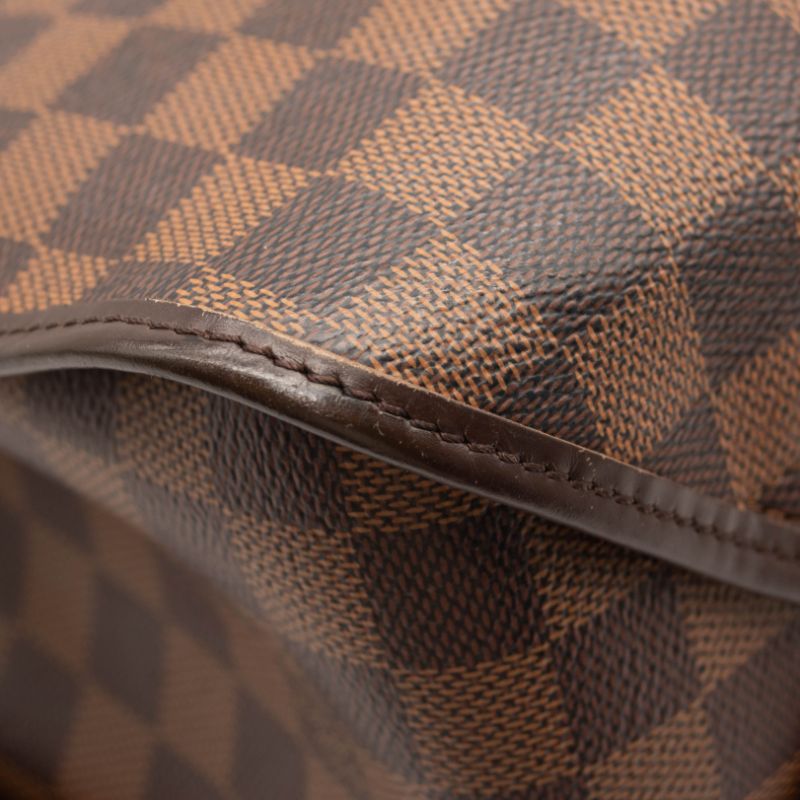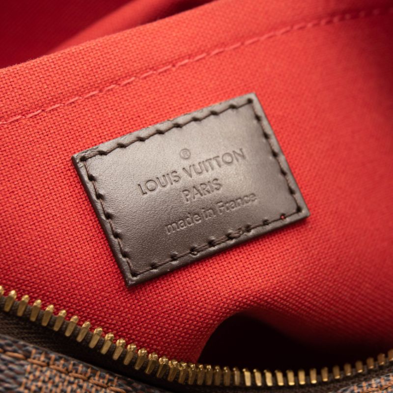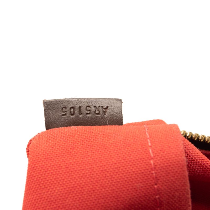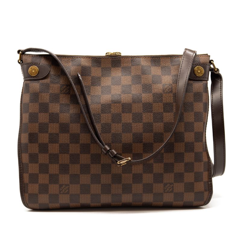 This is an authentic LOUIS VUITTON Damier Ebene Duomo Messenger. This stylish shoulder bag is crafted of Louis Vuitton's signature Damier checkered canvas in brown. This shoulder bag features an adjustable dark chocolate brown leather shoulder strap, matching trim, and polished brass hardware. The top zipper opens to a red fabric interior with pockets.