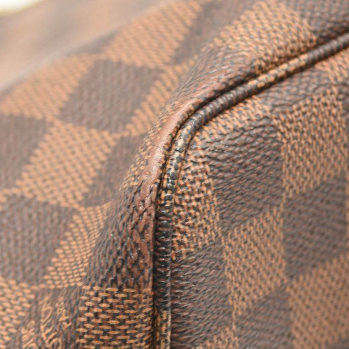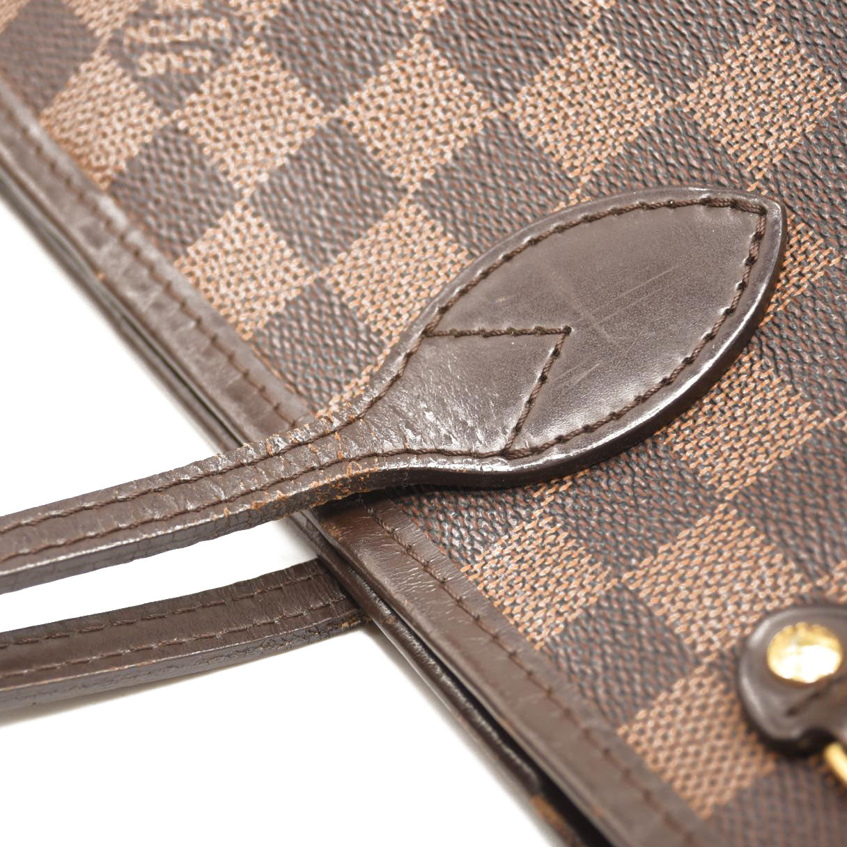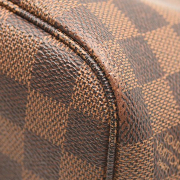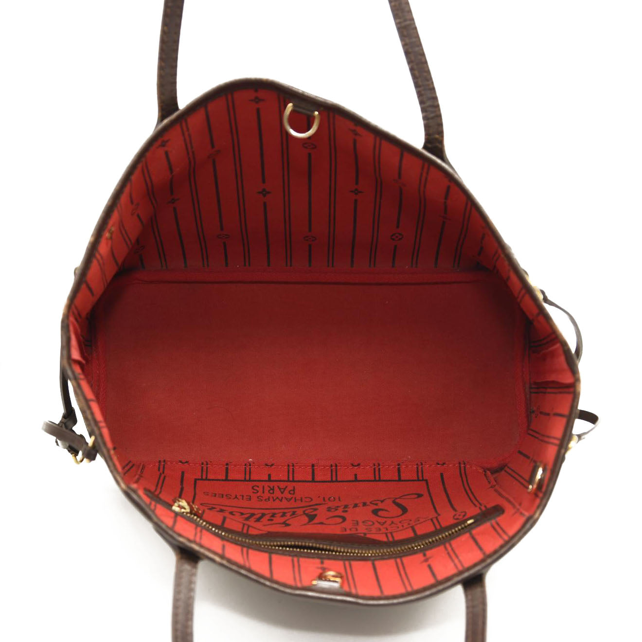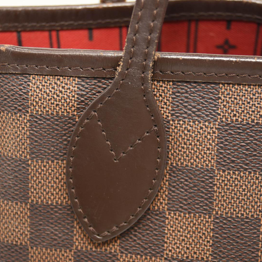 This is an authentic LOUIS VUITTON Damier Ebene Neo Neverfull PM. This chic tote is crafted of classic Louis Vuitton damier patterned canvas with brown cowhide leather trim including strap handles. The top is open to a rouge red striped fabric interior with a hanging zipper pocket.