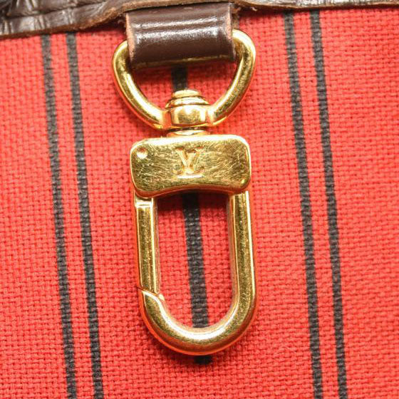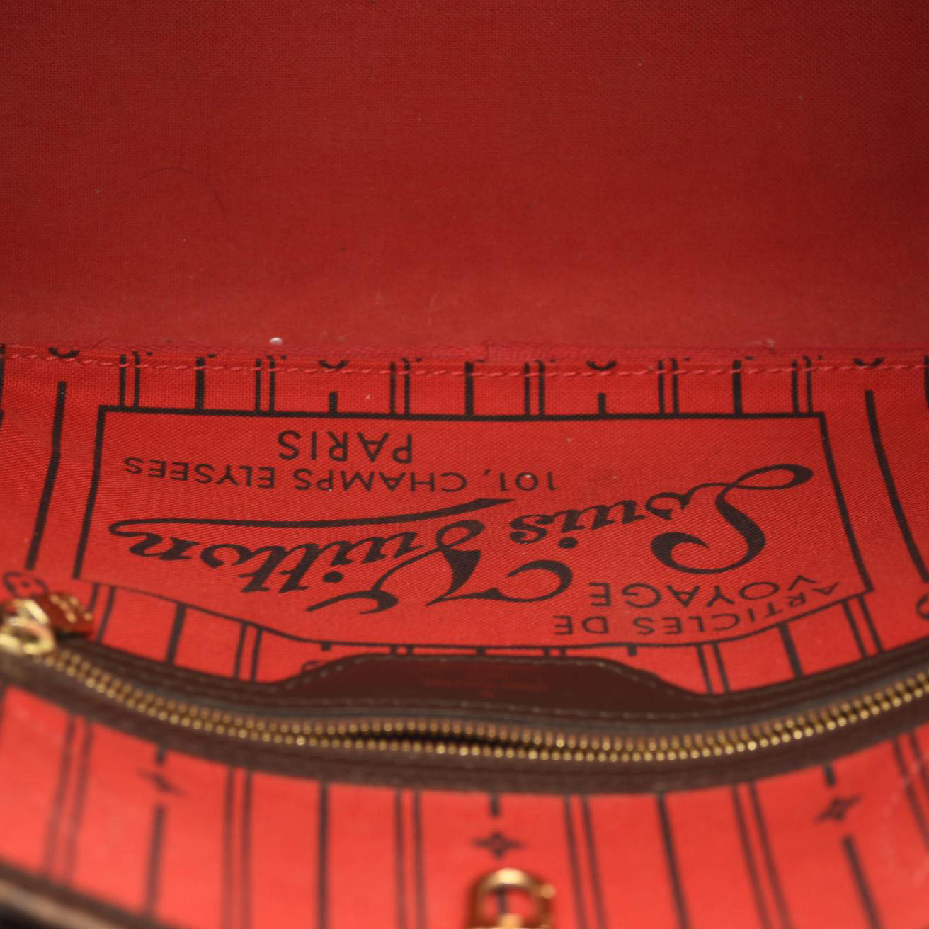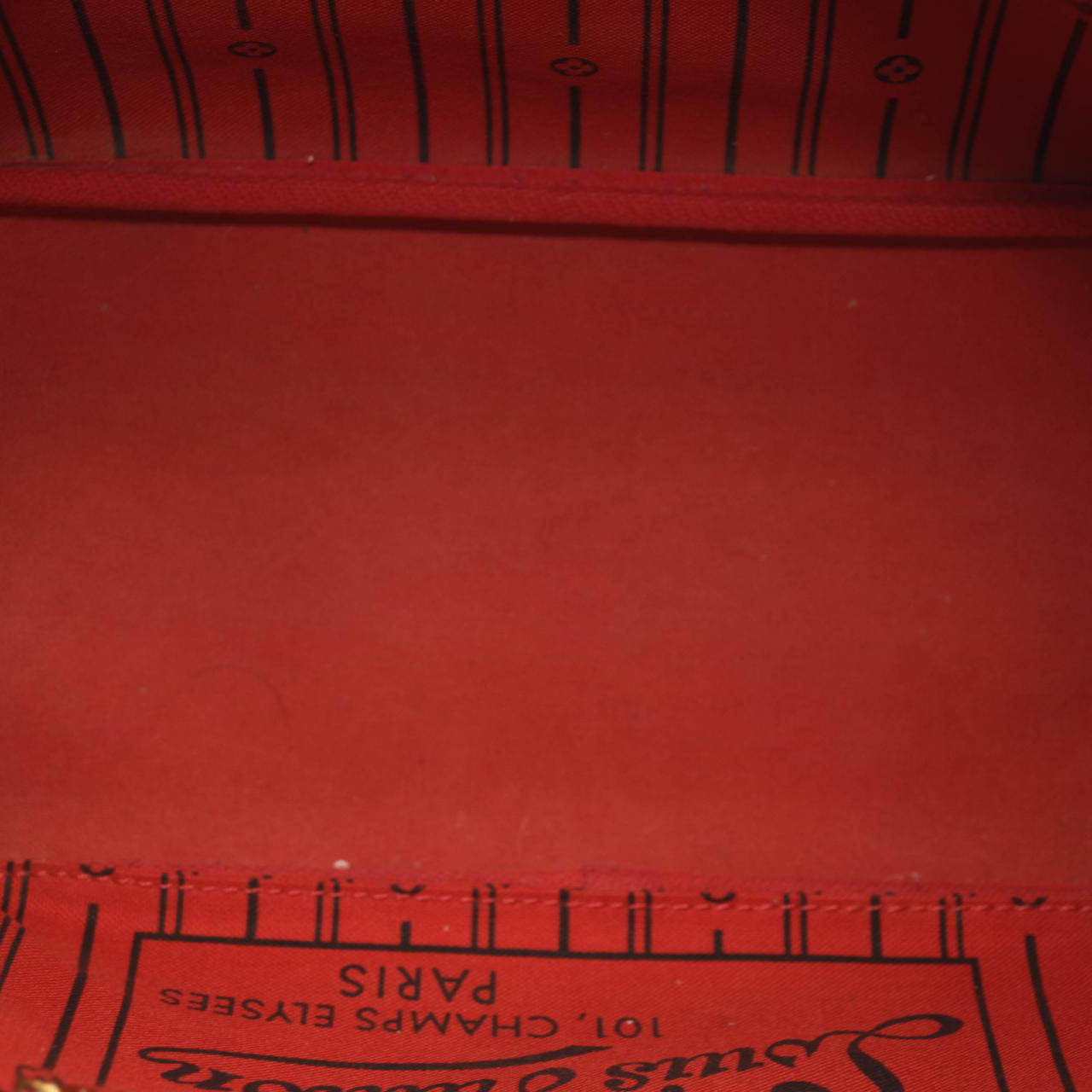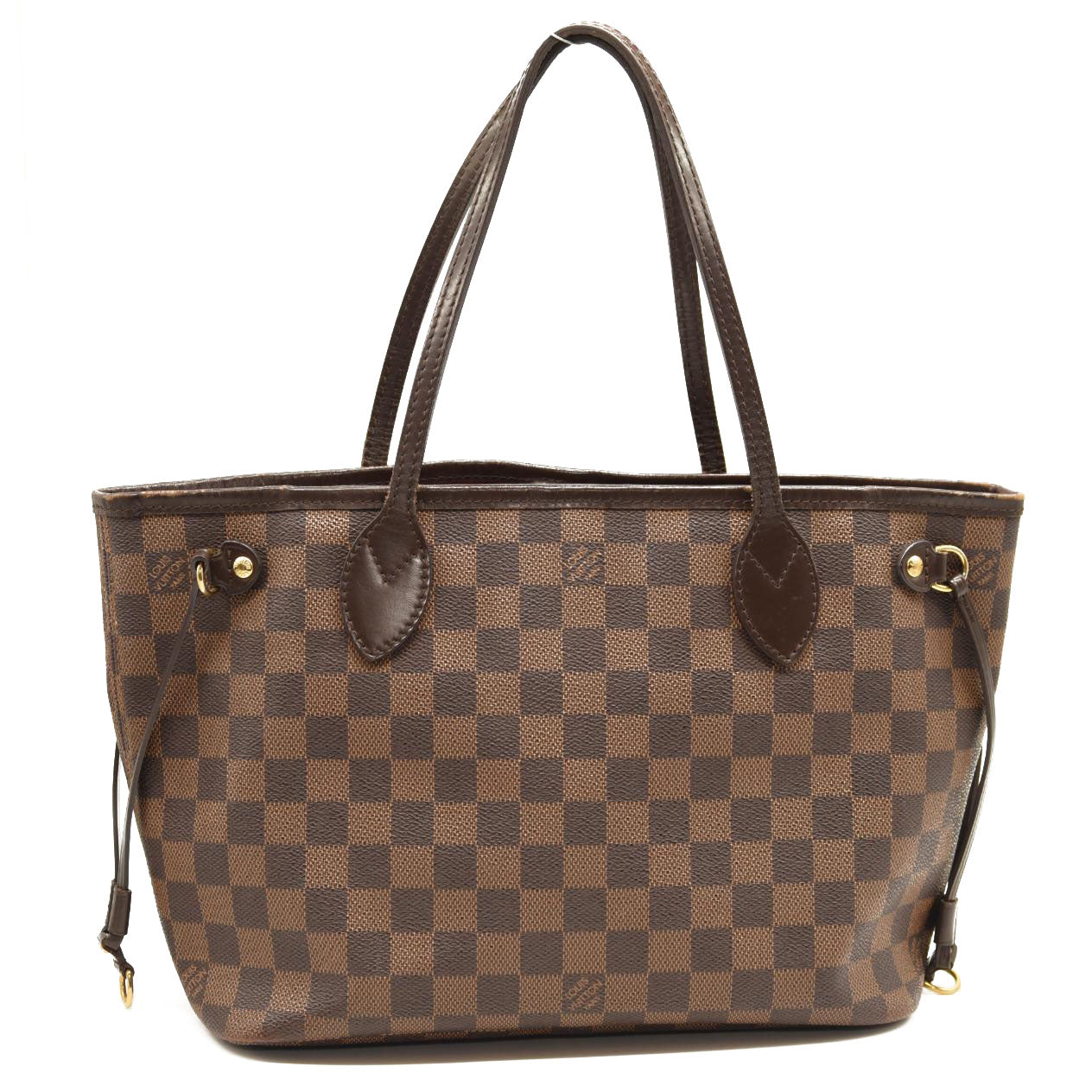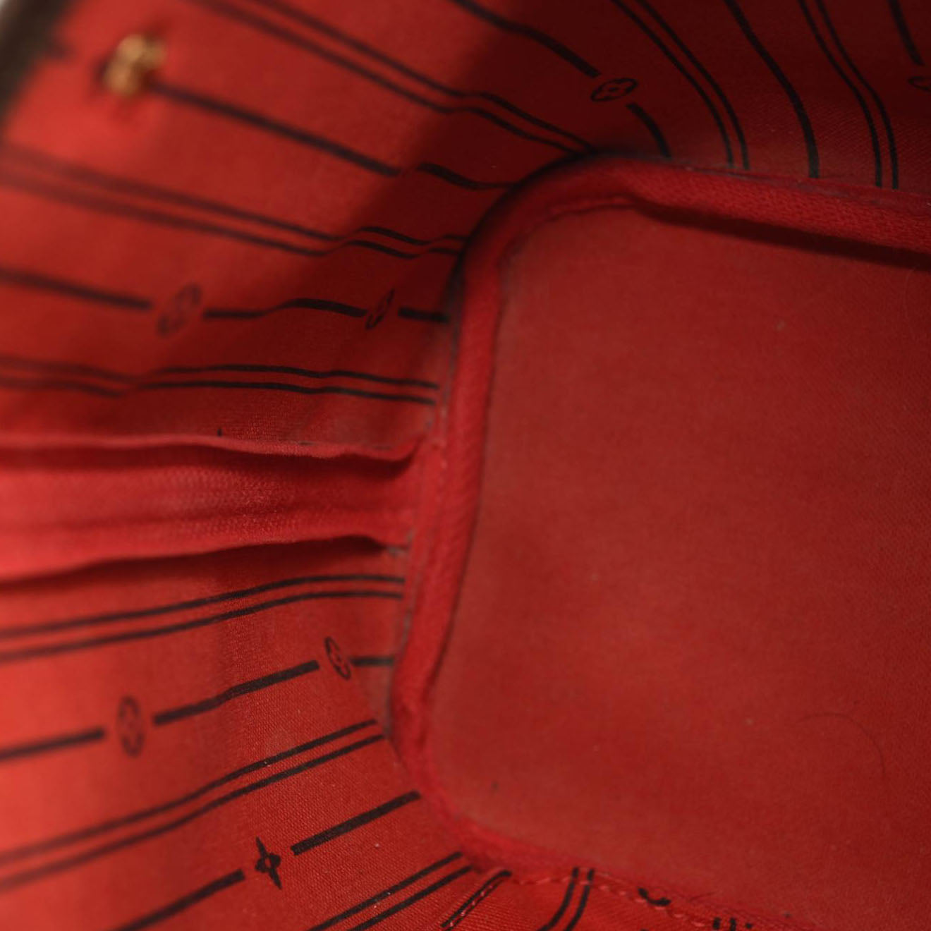 This is an authentic LOUIS VUITTON Damier Ebene Neo Neverfull PM. This chic tote is crafted of classic Louis Vuitton damier patterned canvas with brown cowhide leather trim including strap handles. The top is open to a rouge red striped fabric interior with a hanging zipper pocket.