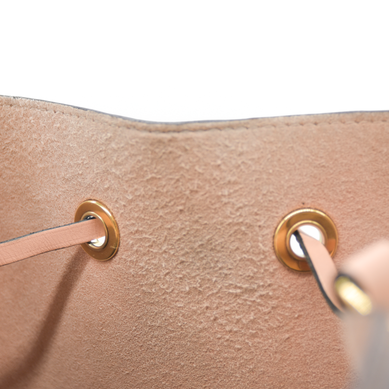 This is an authentic LOUIS VUITTON Damier Ebene Neonoe MM in Venus Pink. This classic bucket style shoulder bag is crafted of Louis Vuitton damier checkered coated canvas. The bag features a soft pink shoulder strap and top cinch strap with polished brass hardware. This opens to a soft pink microfiber interior and center zip pocket to keep you organized.
