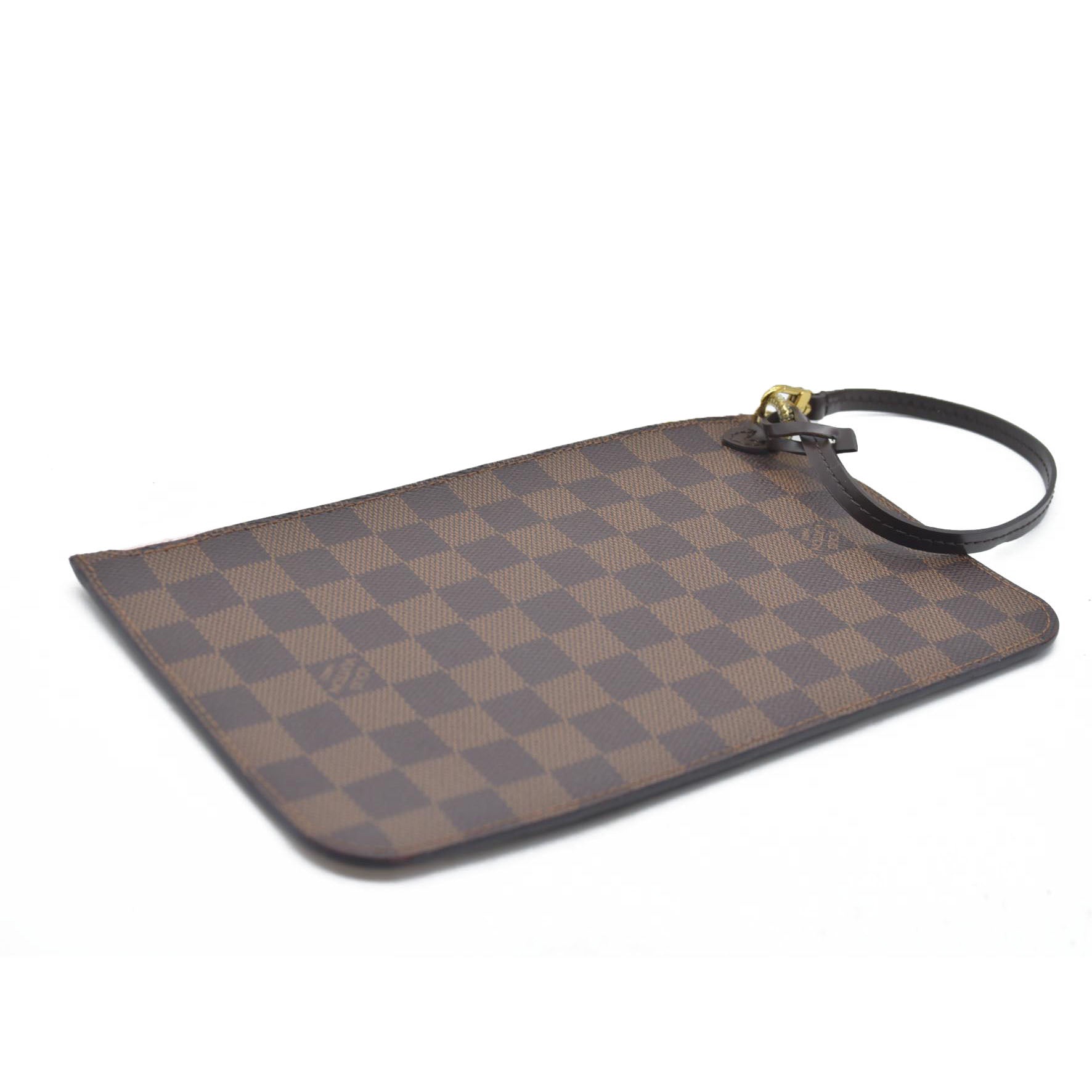 This is the authentic LOUIS VUITTON Damier Ebene Neverfull MM Pochette. This pouch is crafted of signature Louis Vuitton checkerboard-coated canvas in brown with a removable chocolate brown leather strap. It features a polished gold-toned top zipper that opens to a light pink striped fabric interior with a patch pocket.