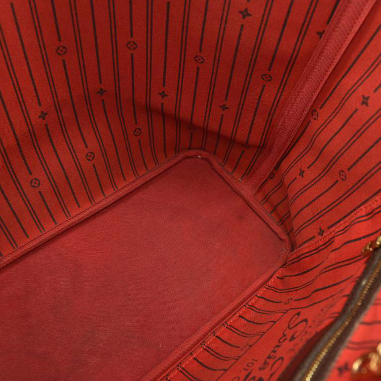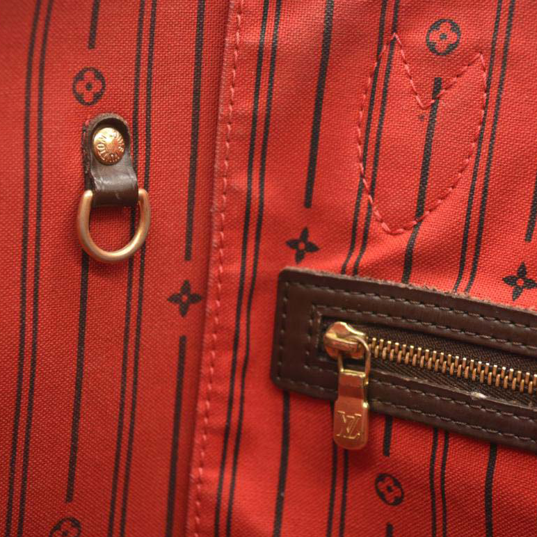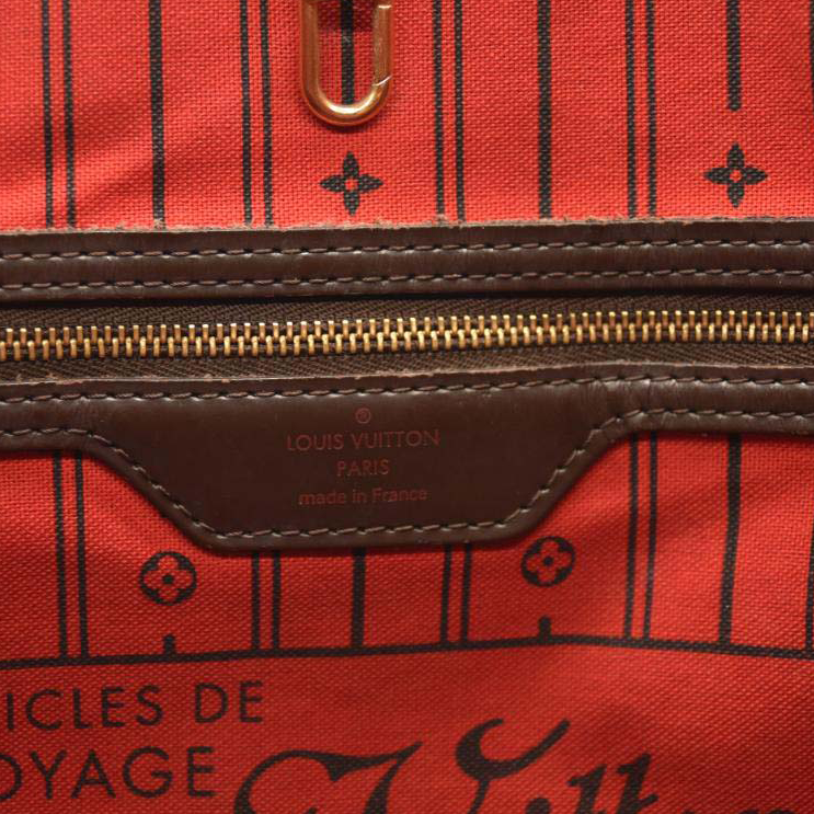 This is an authentic LOUIS VUITTON Damier Ebene Neo Neverfull MM. This chic handbag is crafted of classic Louis Vuitton Damier coated canvas in brown. The bag features dark brown cowhide leather shoulder straps and trim. The top is open to a red striped fabric interior, with a hanging zipper pocket.