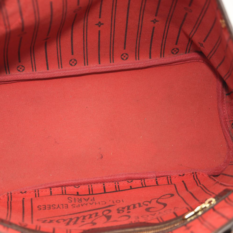 This is an authentic LOUIS VUITTON Damier Ebene Neverfull PM. This chic handbag is crafted of classic Louis Vuitton Damier coated canvas in brown. This features chocolate brown cowhide leather shoulder straps, side cinch cords, trim, and polished brass hardware. The top is open to a striped red fabric interior with a hanging zipper pocket.