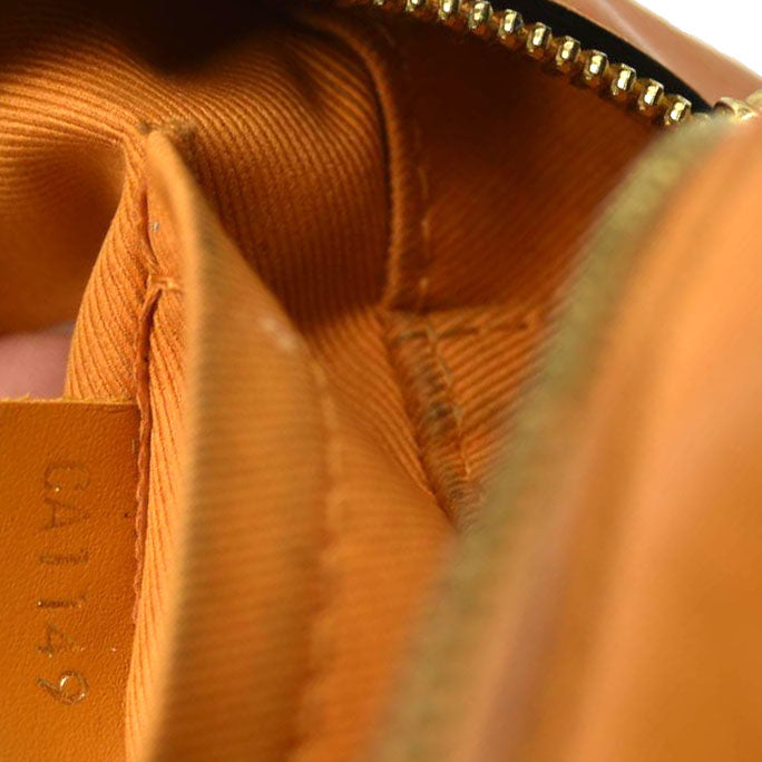 This is an authentic LOUIS VUITTON Damier Ebene Santa Monica in Safran. This is a versatile hand bag that is finely crafted of Louis Vuitton coated canvas and smooth orange trim. The bag features a leather top handle, an extra long shoulder strap, and gold hardware. The wrap around zipper opens to an orange fabric interior with a patch pocket. This is a chic bag for just the essentials or evening, from Louis Vuitton!