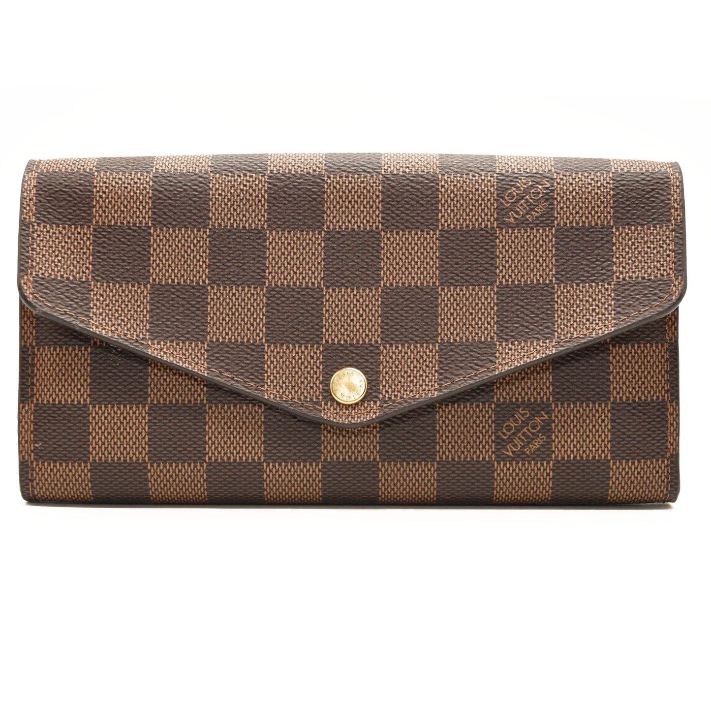 This is an authentic LOUIS VUITTON Damier Ebene Sarah Wallet NM in Rose Ballerine. This stylish wallet is crafted of Louis Vuitton signature damier canvas in brown. This wallet features a V shaped front flap which opens to a pink cross grain leather interior with card slot panels, patch pockets and a central zipper coin compartment. This is an excellent wallet that is ideal for everyday use, from Louis Vuitton!