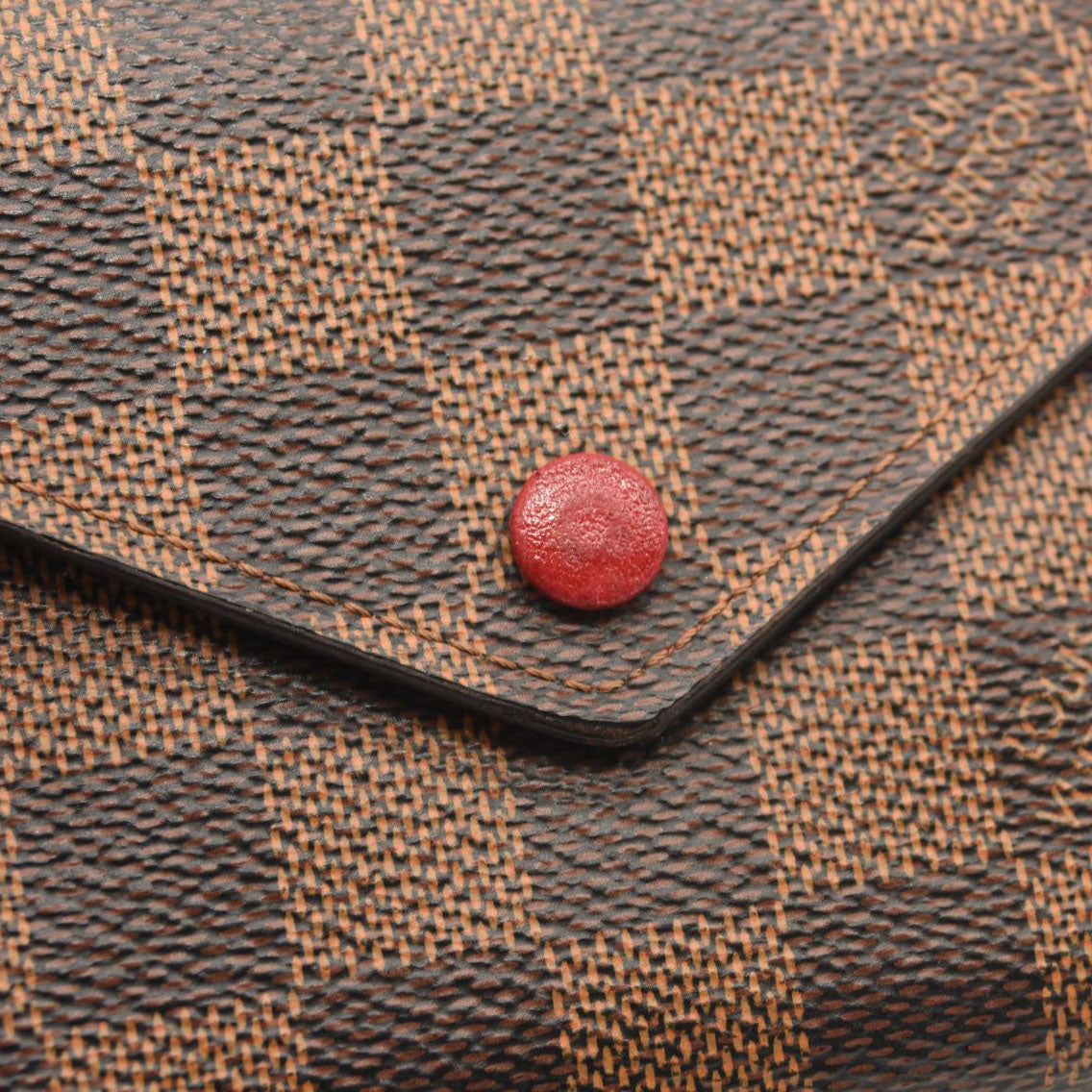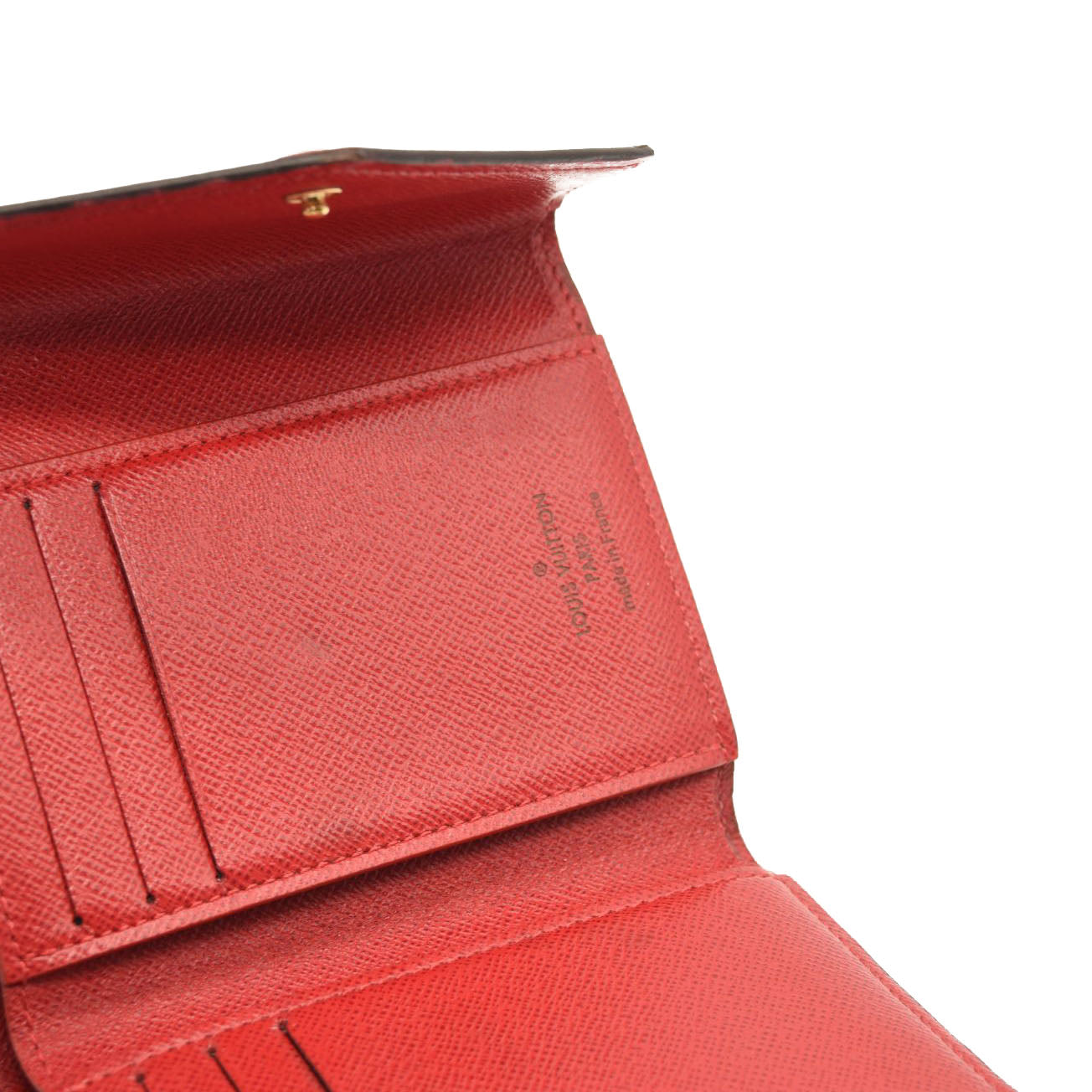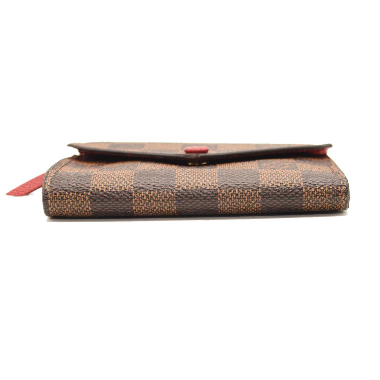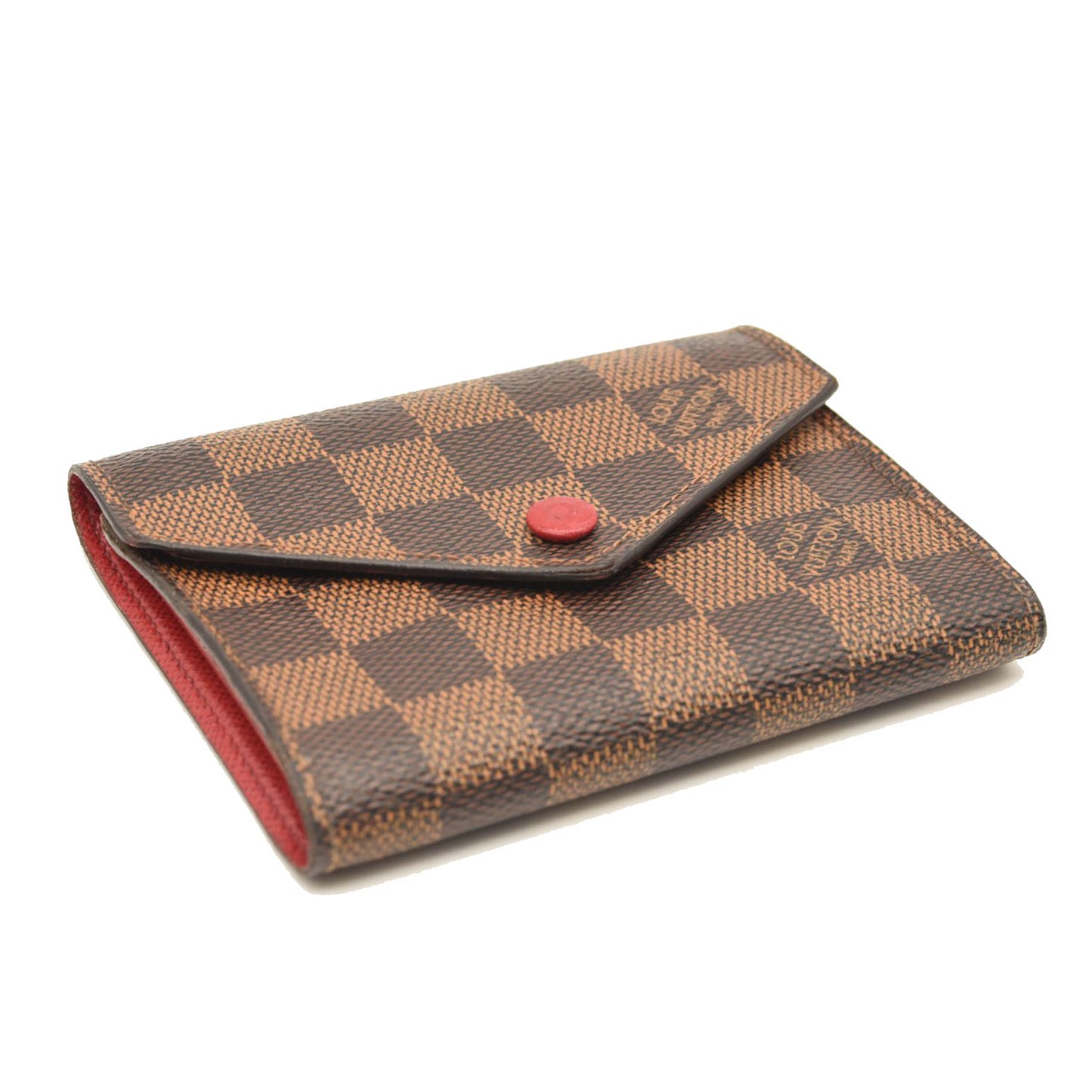This is an authentic LOUIS VUITTON Damier Ebene Victorine Wallet in Red. This wallet is crafted of traditional Louis Vuitton Damier checked toile canvas in brown. This wallet features a red cross-grain leather snap that opens to a matching interior with card slots, patch pockets, a zipper compartment, and a billfold. This is an ideal grab and go wallet with classic style and luxury, by Louis Vuitton!