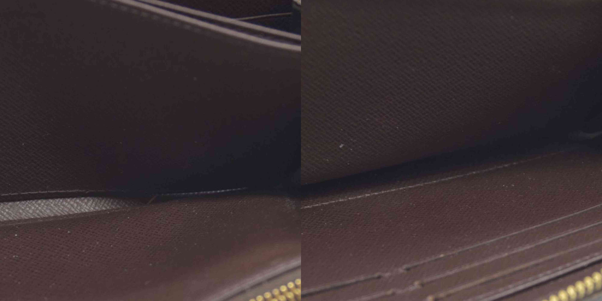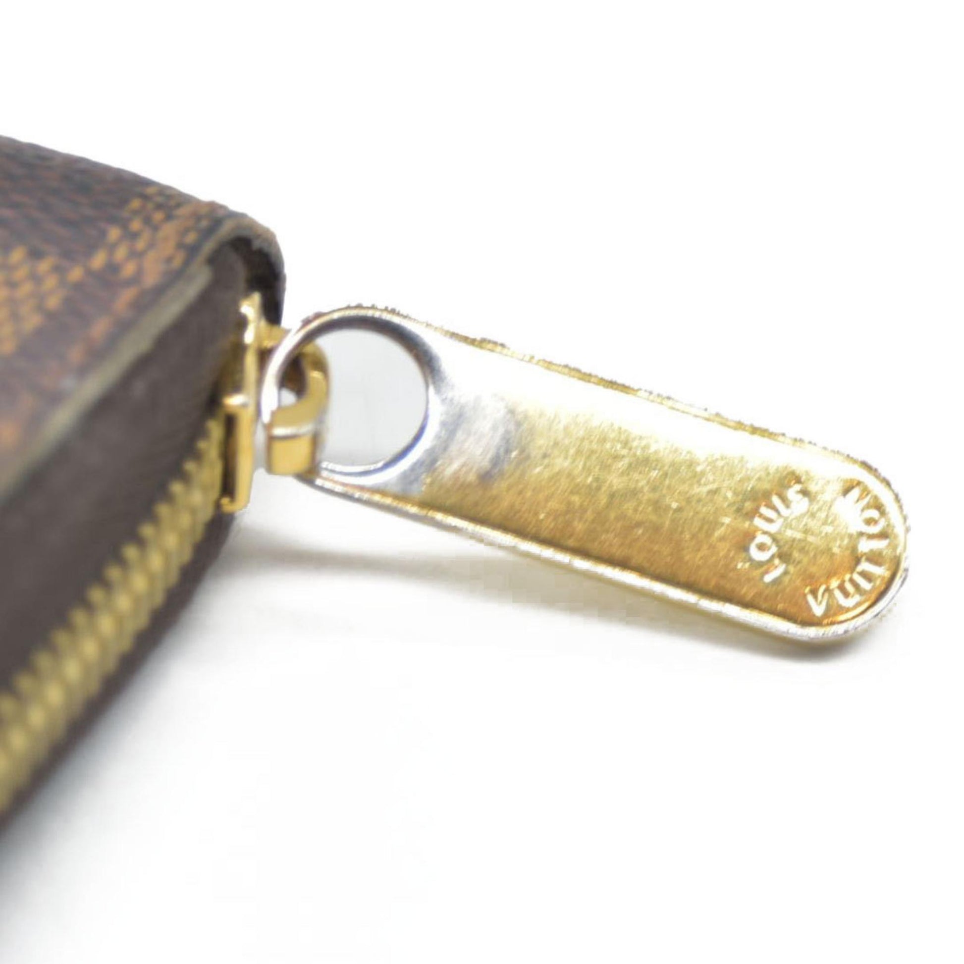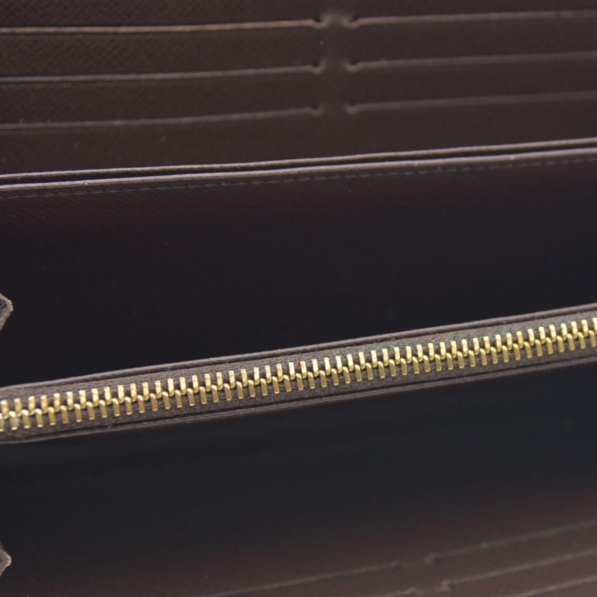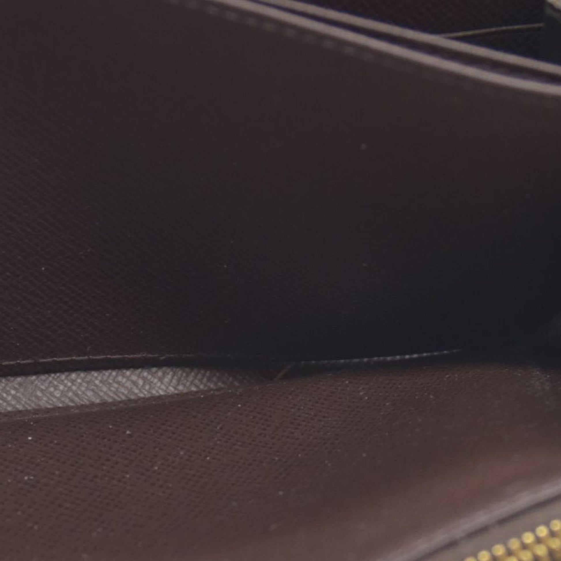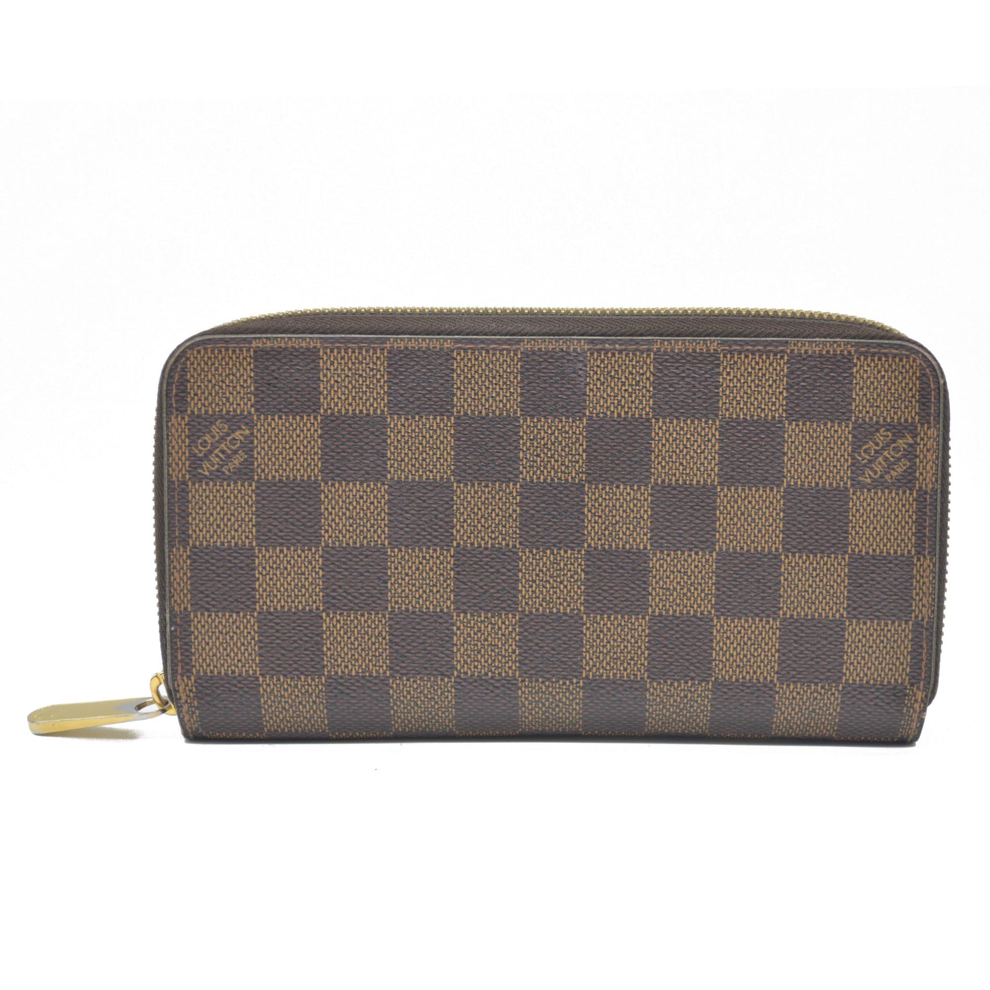 This is an authentic LOUIS VUITTON Damier Ebene Zippy Wallet. This wallet is crafted of Louis Vuitton's signature Damier check canvas in brown. The wallet features a polished gold wrap-around zipper that opens to a partitioned dark brown cross-grain leather interior with card slots, pockets, and a zipper compartment.