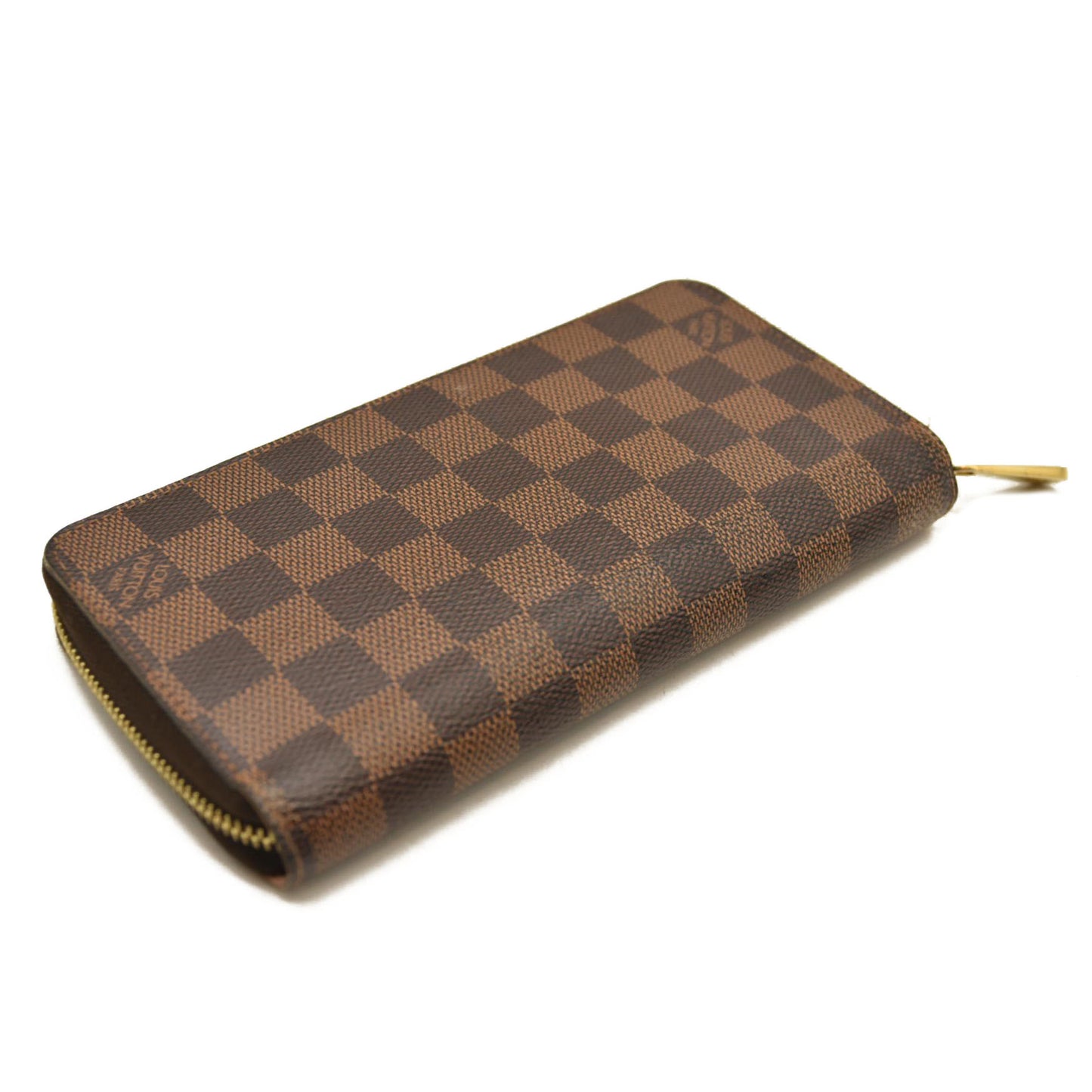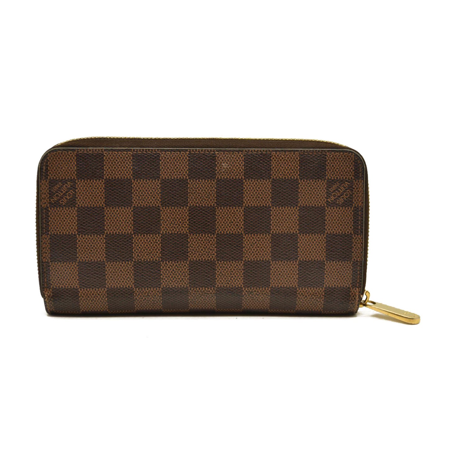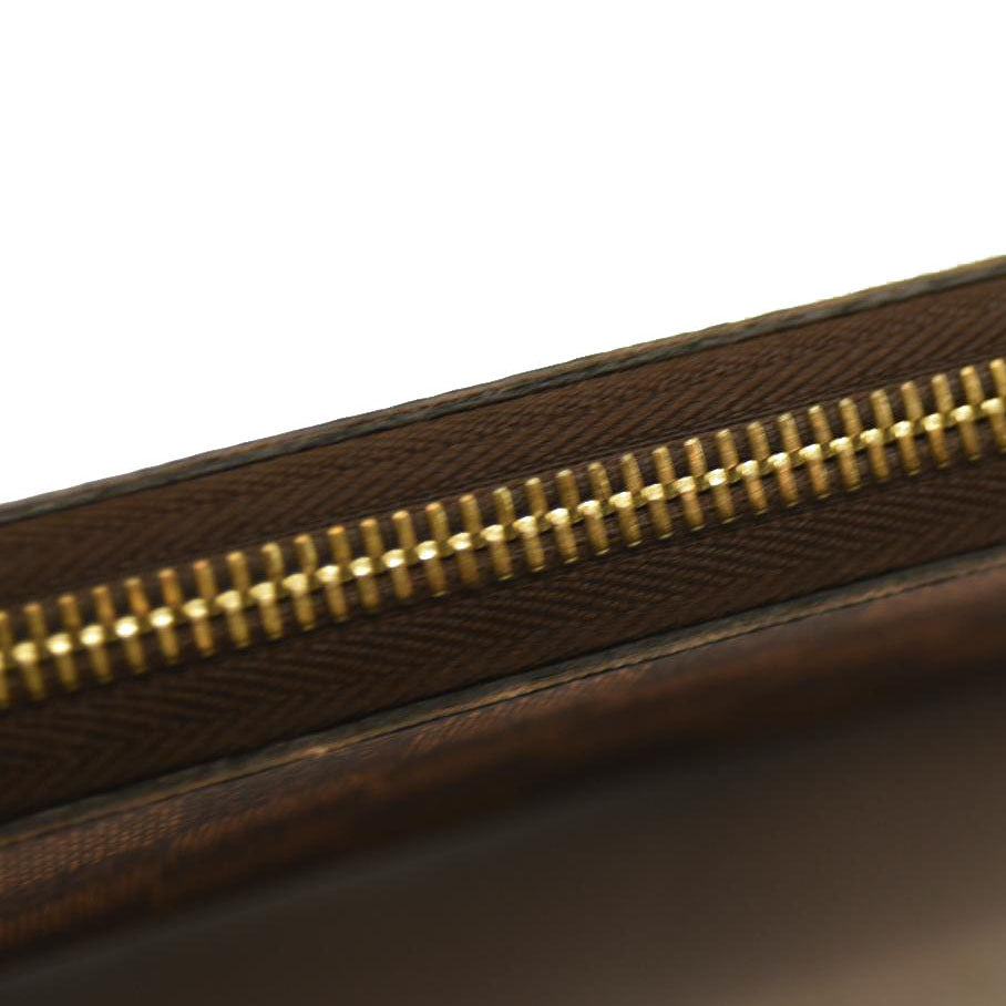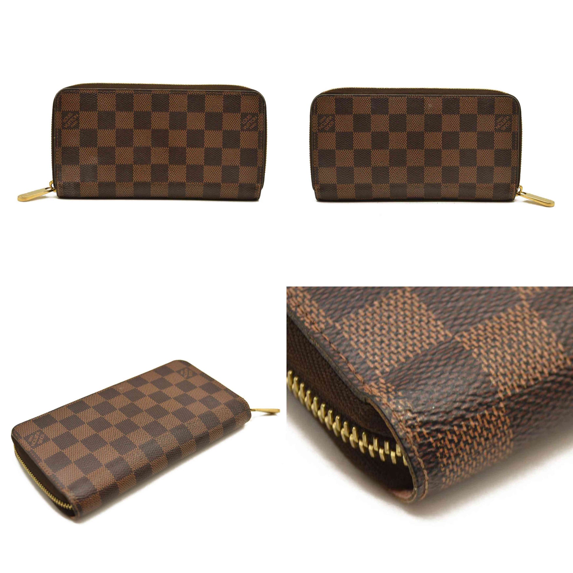 This is an authentic LOUIS VUITTON Damier Ebene Zippy Wallet in Rose Ballerine. This wallet is crafted of Louis Vuitton's signature Damier coated canvas in brown. The wallet features a polished brass wrap-around zipper that opens to a partitioned pink cross-grain leather interior with card slots, patch pockets, and a zipper compartment.