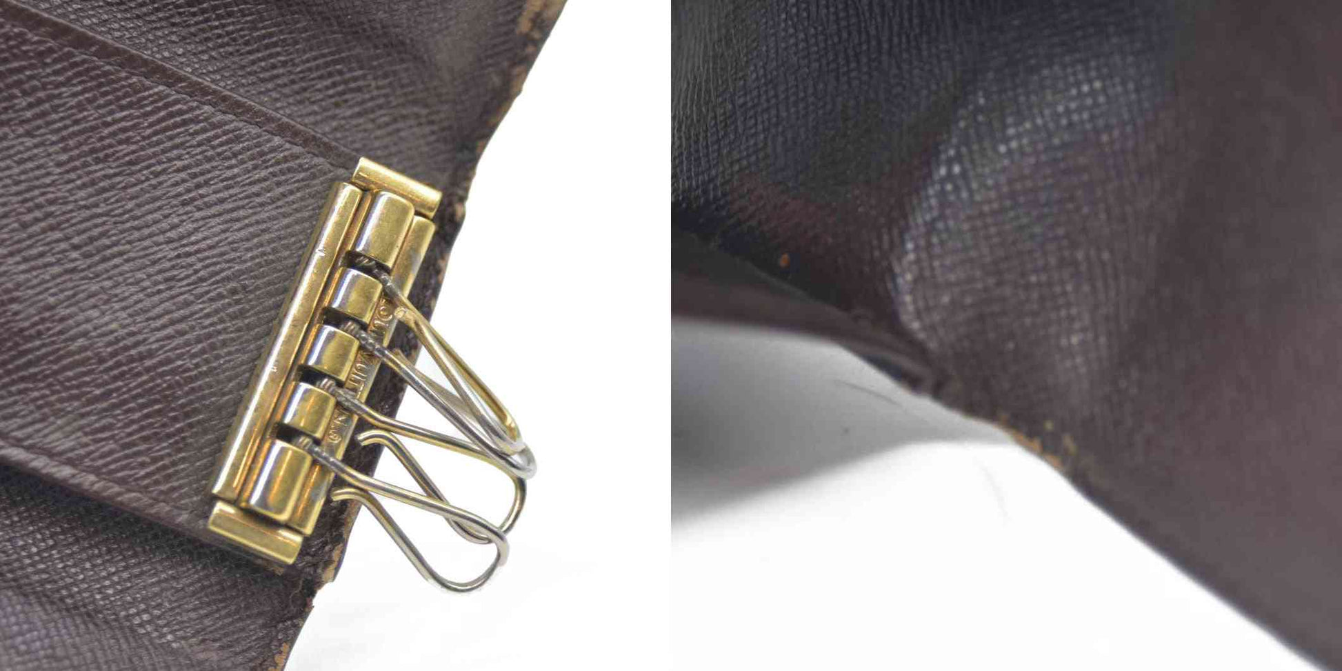 The exterior is rubbed with scratches. There are loose stitches around the folding area. There are rubbed marks on the inside.