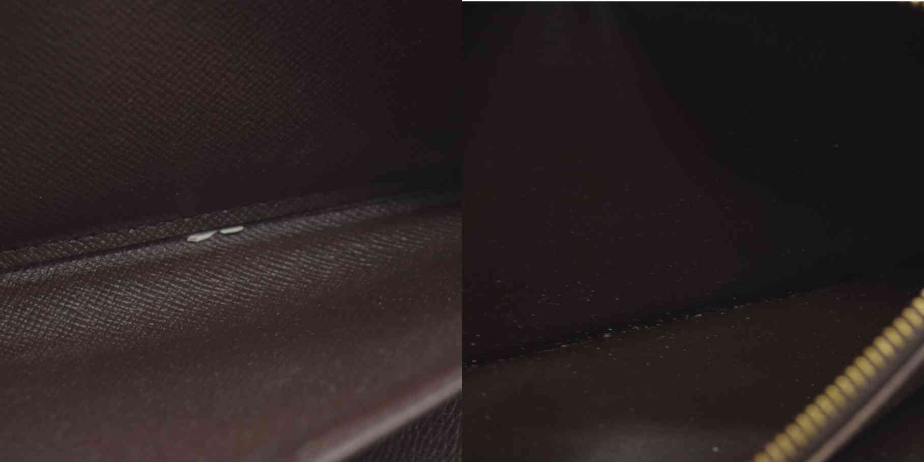The exterior is rubbed with scratches. The zipper is broken. There are rubbed marks on the inside. There are loose stitches around the folding area.
