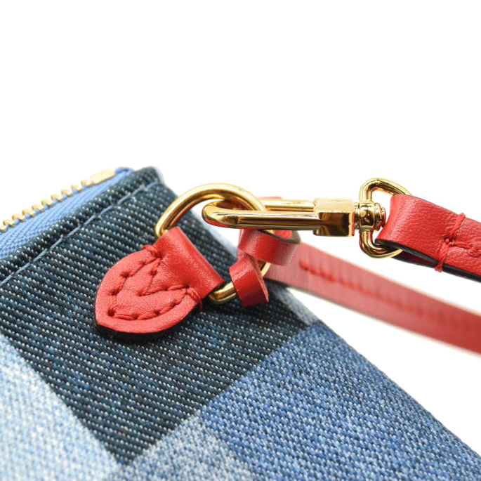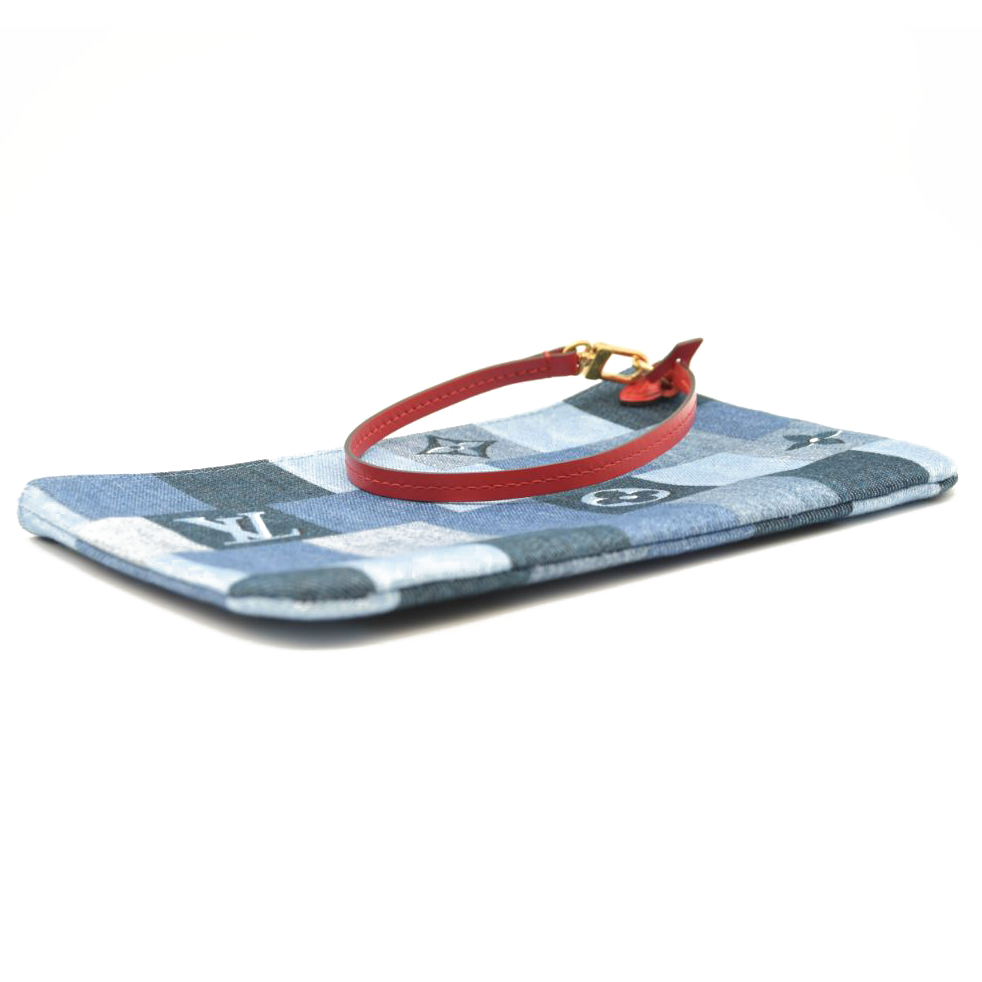 This is an authentic LOUIS VUITTON Denim Damier Monogram Patchwork Neverfull MM Pochette in Bleu and Rouge. This stylish pouch is crafted of Louis Vuitton monogram fine denim in blue. This pouch features a red leather strap and gold hardware. The top zipper opens to denim interior with a patch pocket.