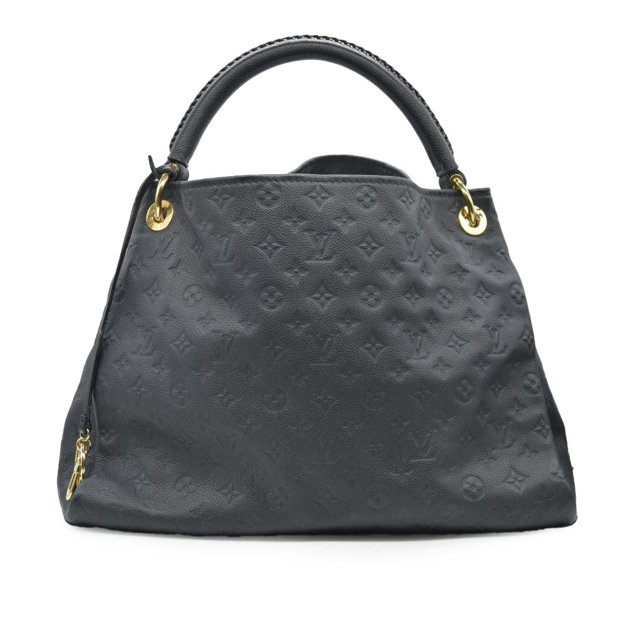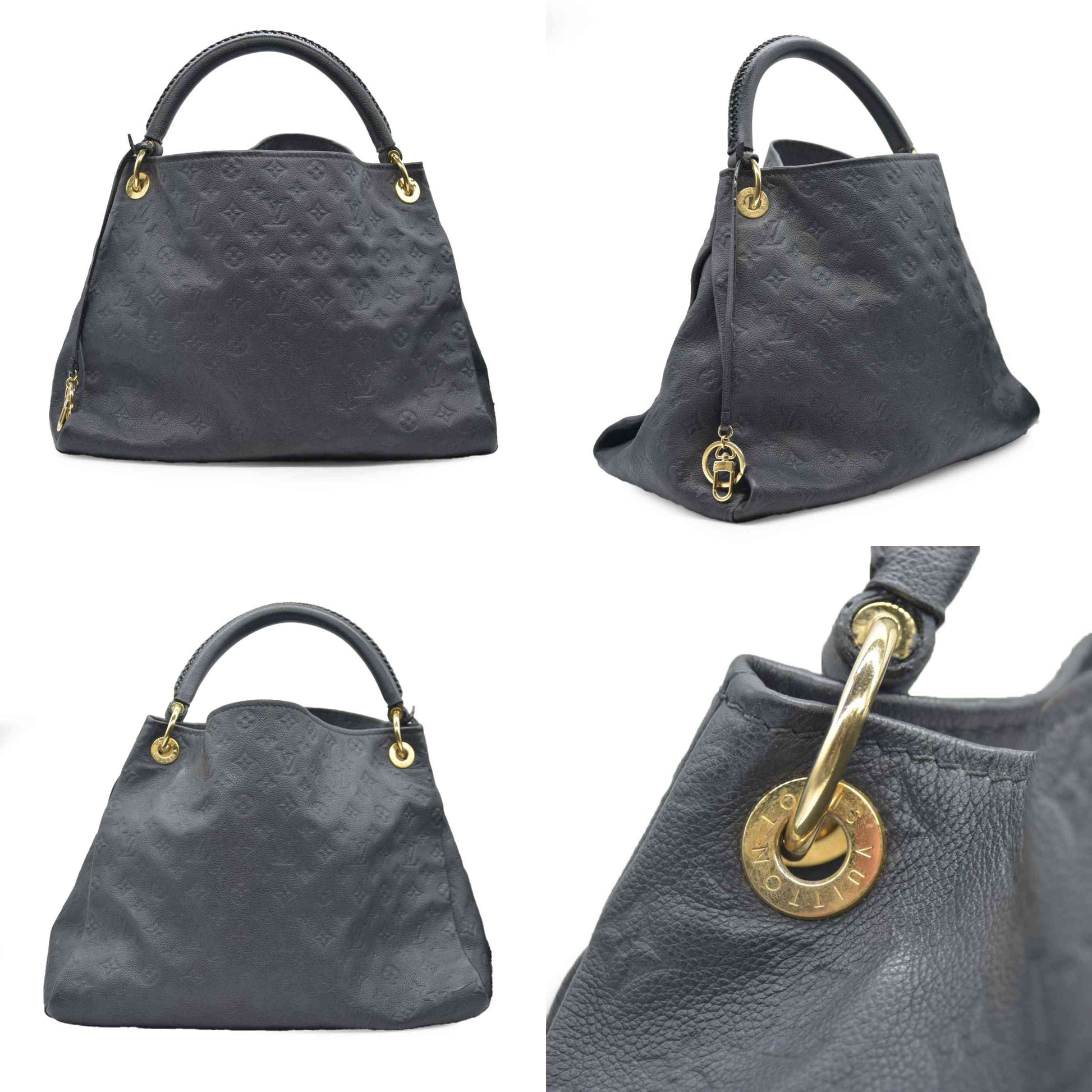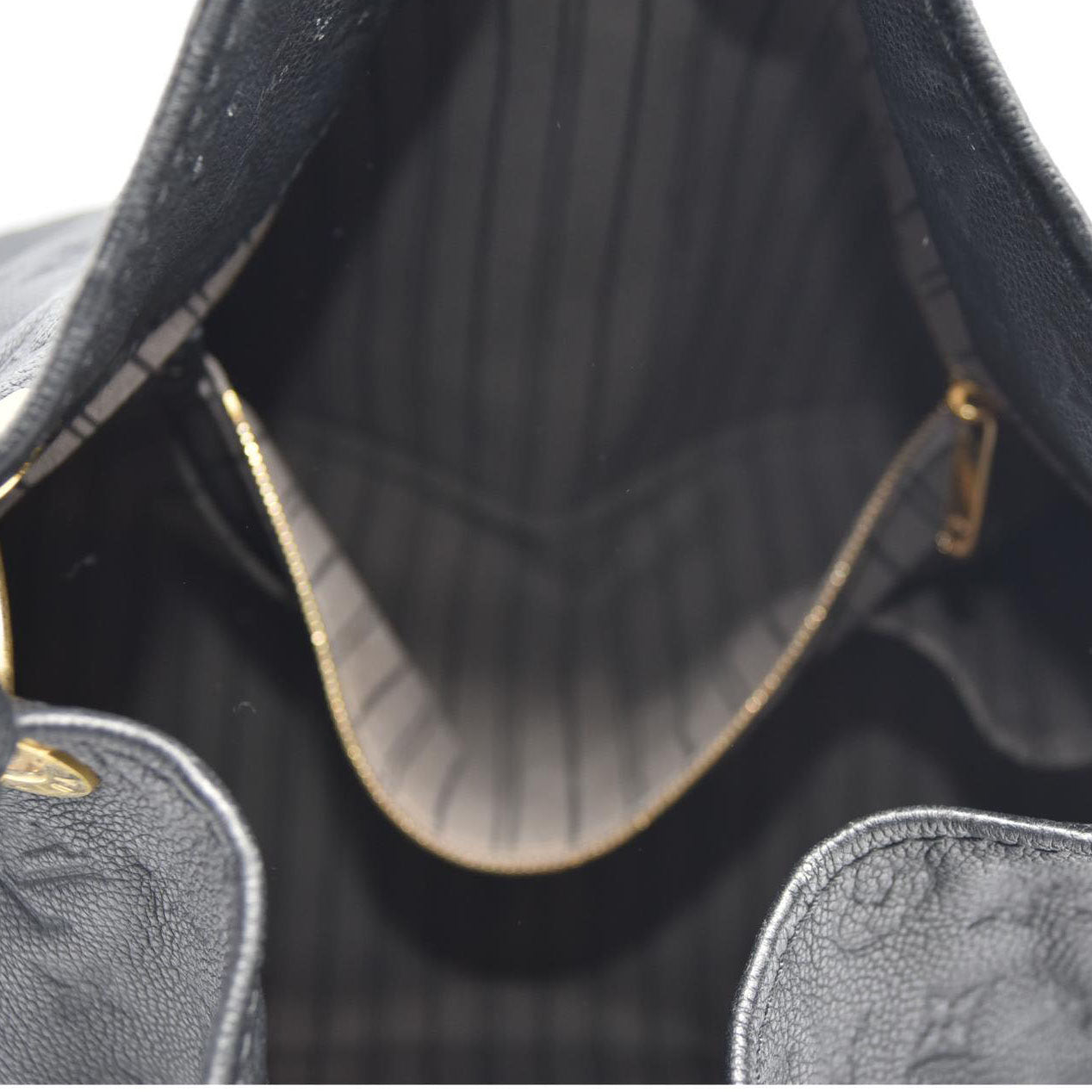 This is an authentic LOUIS VUITTON Empreinte Artsy MM in Black. This stunning hobo style shoulder bag is crafted of Louis Vuitton monogram embossed calfskin leather in black. This bag features a looping leather shoulder strap with woven braid detail and polished brass hardware. The top opens to a gray striped fabric interior with zipper and patch pockets.