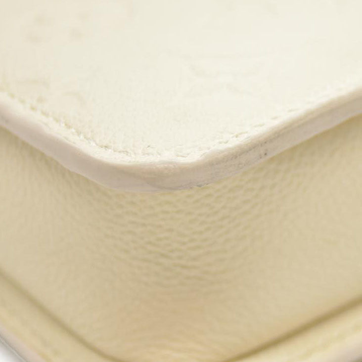 This is an authentic LOUIS VUITTON Empreinte Metis Wallet On Chain in Cream. This beautiful flap style shoulder bag is crafted of Louis Vuitton monogram embossed leather in cream. The bag features an optional brass chain-link shoulder strap with a crossover flap and a polished brass magnetic closure. The flap opens to a cream textile interior with a card slot panel.