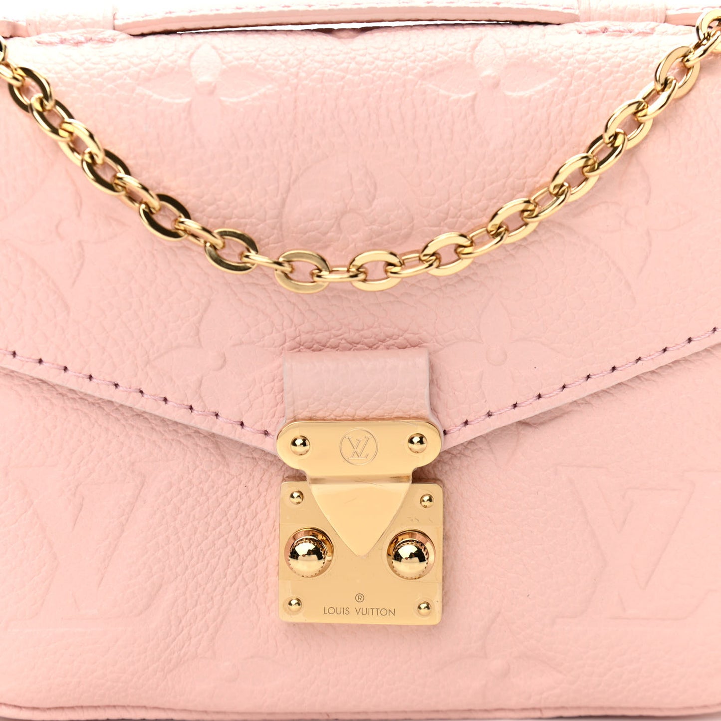 This is an authentic LOUIS VUITTON Empreinte Monogram Micro Metis in Rose Pink. This crossbody is crafted from supple Monogram Empreinte leather in pink. The shoulder bag features a top handle, a removable chain shoulder strap, and a polished brass S-lock on the flap. This opens to a partitioned pink fabric interior.