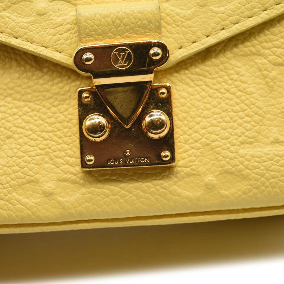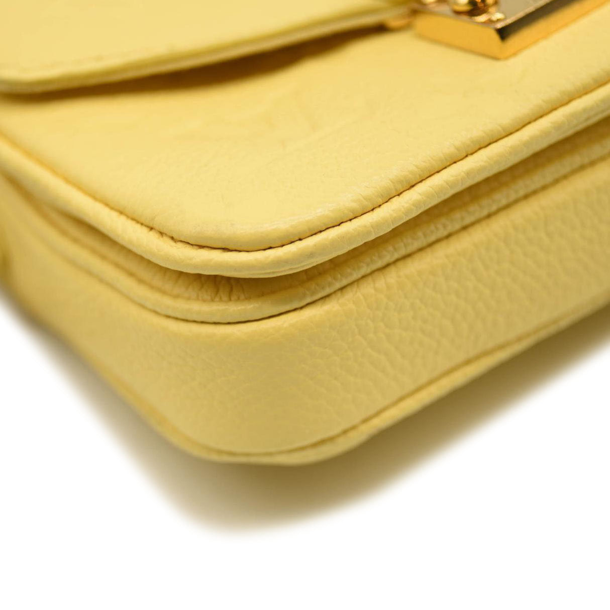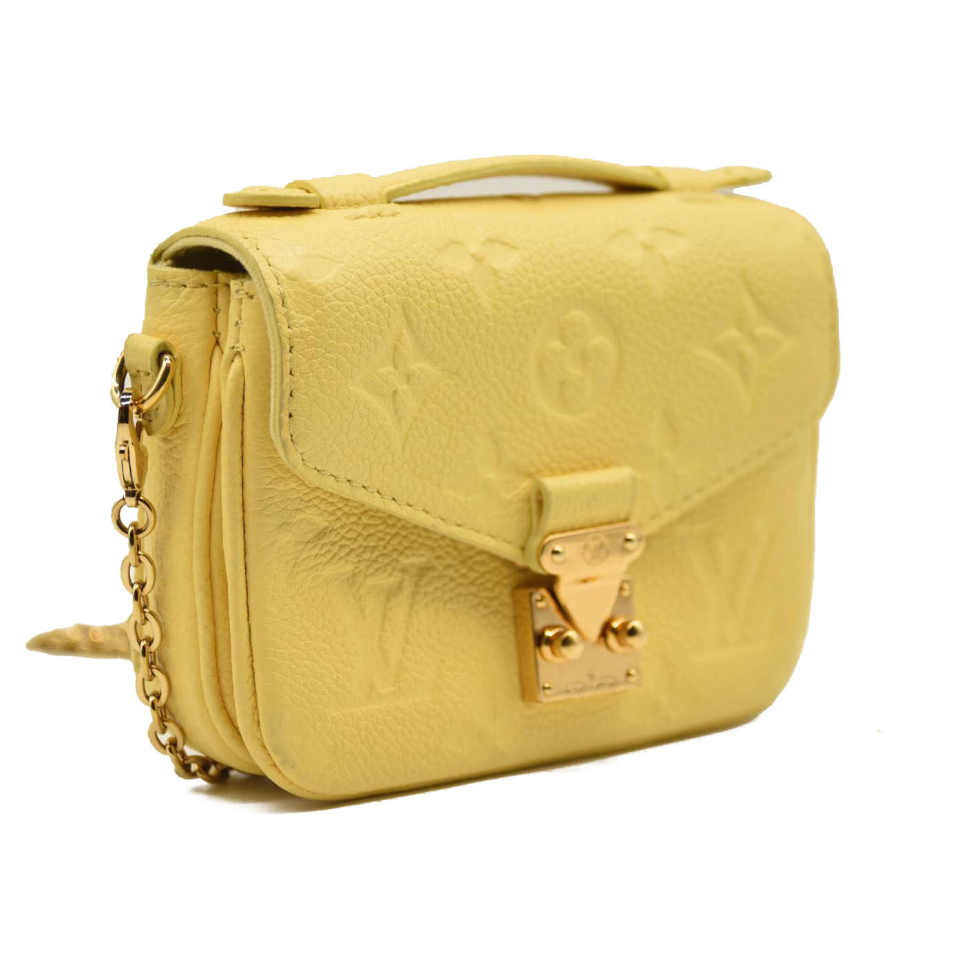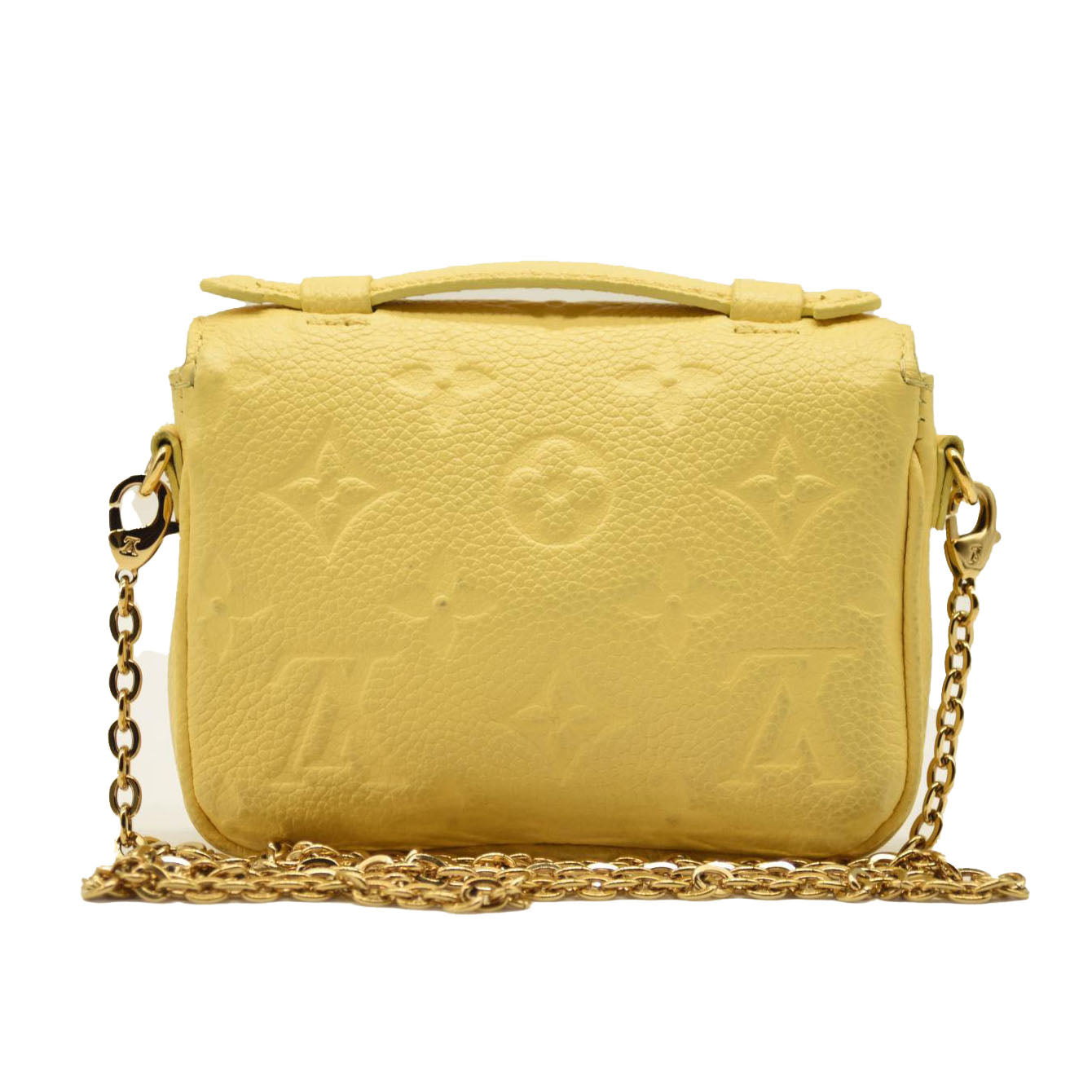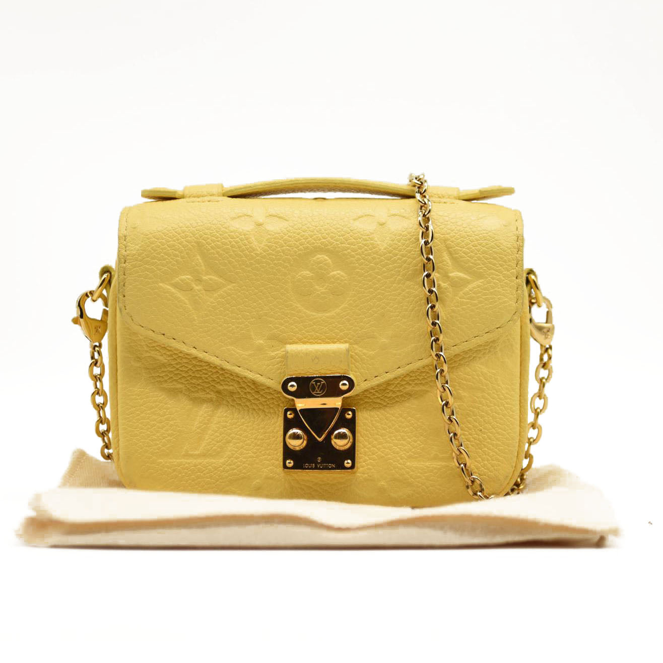 This is an authentic LOUIS VUITTON Empreinte Micro Metis in Yellow. This chic handbag is finely crafted of Louis Vuitton monogram calfskin yellow leather. The shoulder bag features a yellow leather top handle, an optional chain shoulder strap, and a V-shaped front flap with a polished brass S-lock. The flap opens to a partitioned yellow fabric interior.