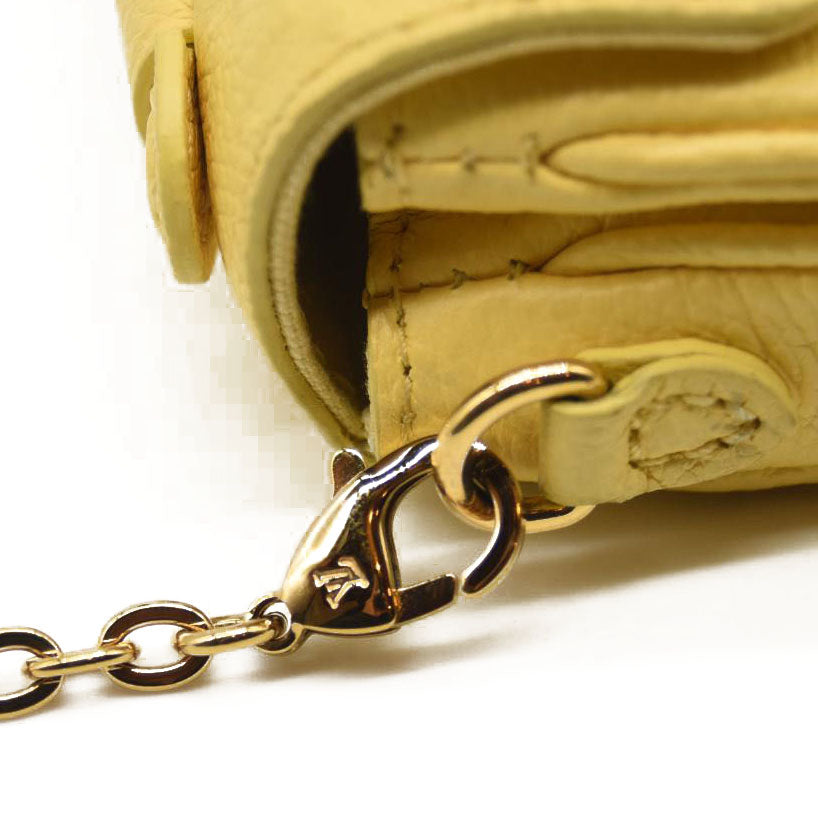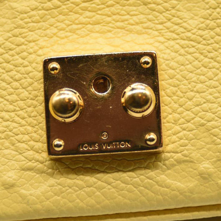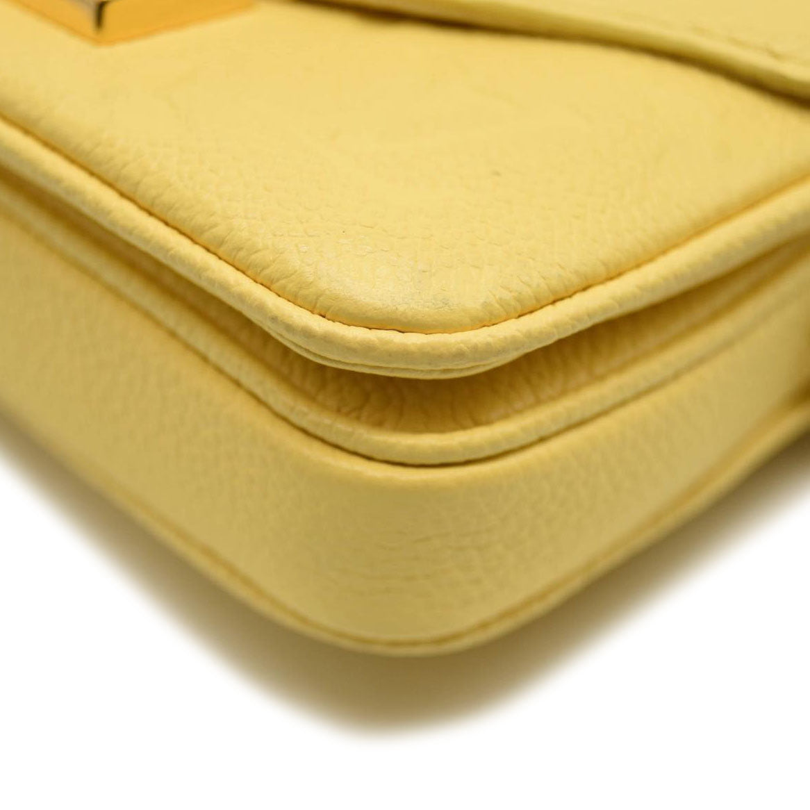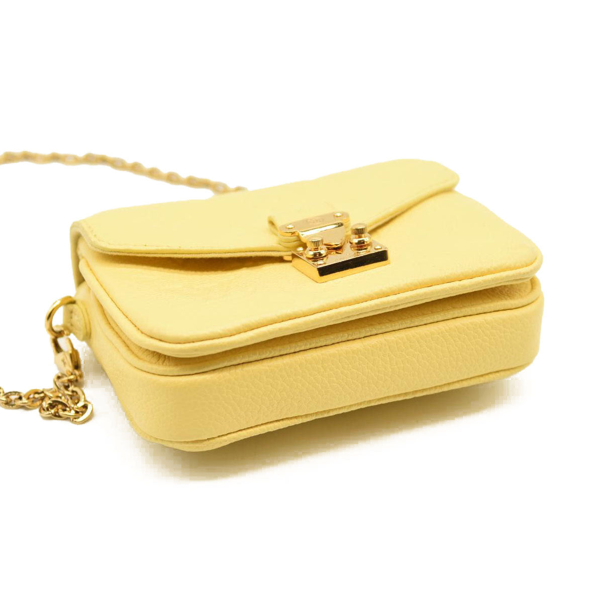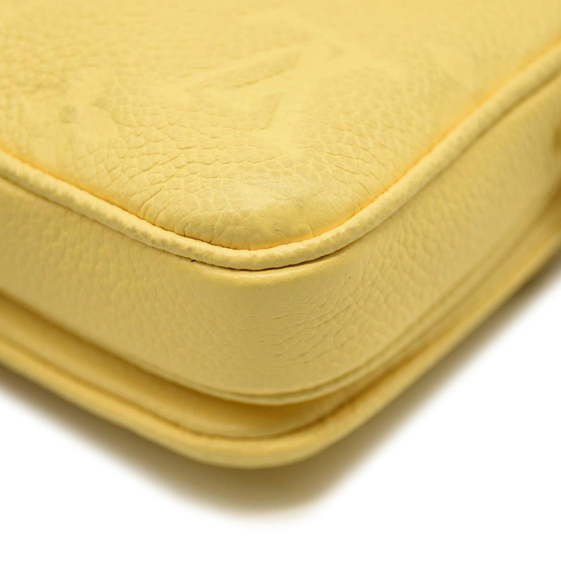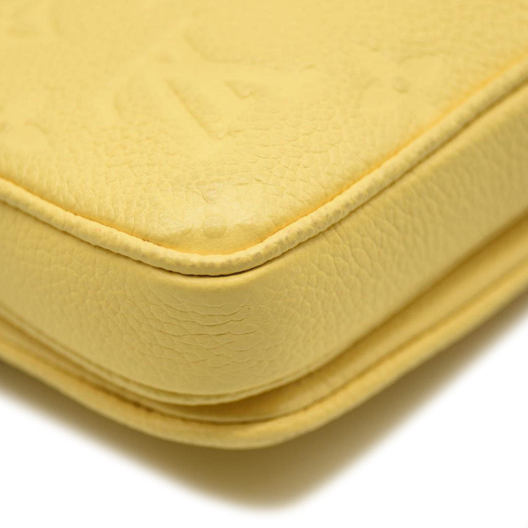 This is an authentic LOUIS VUITTON Empreinte Micro Metis in Yellow. This chic handbag is finely crafted of Louis Vuitton monogram calfskin yellow leather. The shoulder bag features a yellow leather top handle, an optional chain shoulder strap, and a V-shaped front flap with a polished brass S-lock. The flap opens to a partitioned yellow fabric interior.