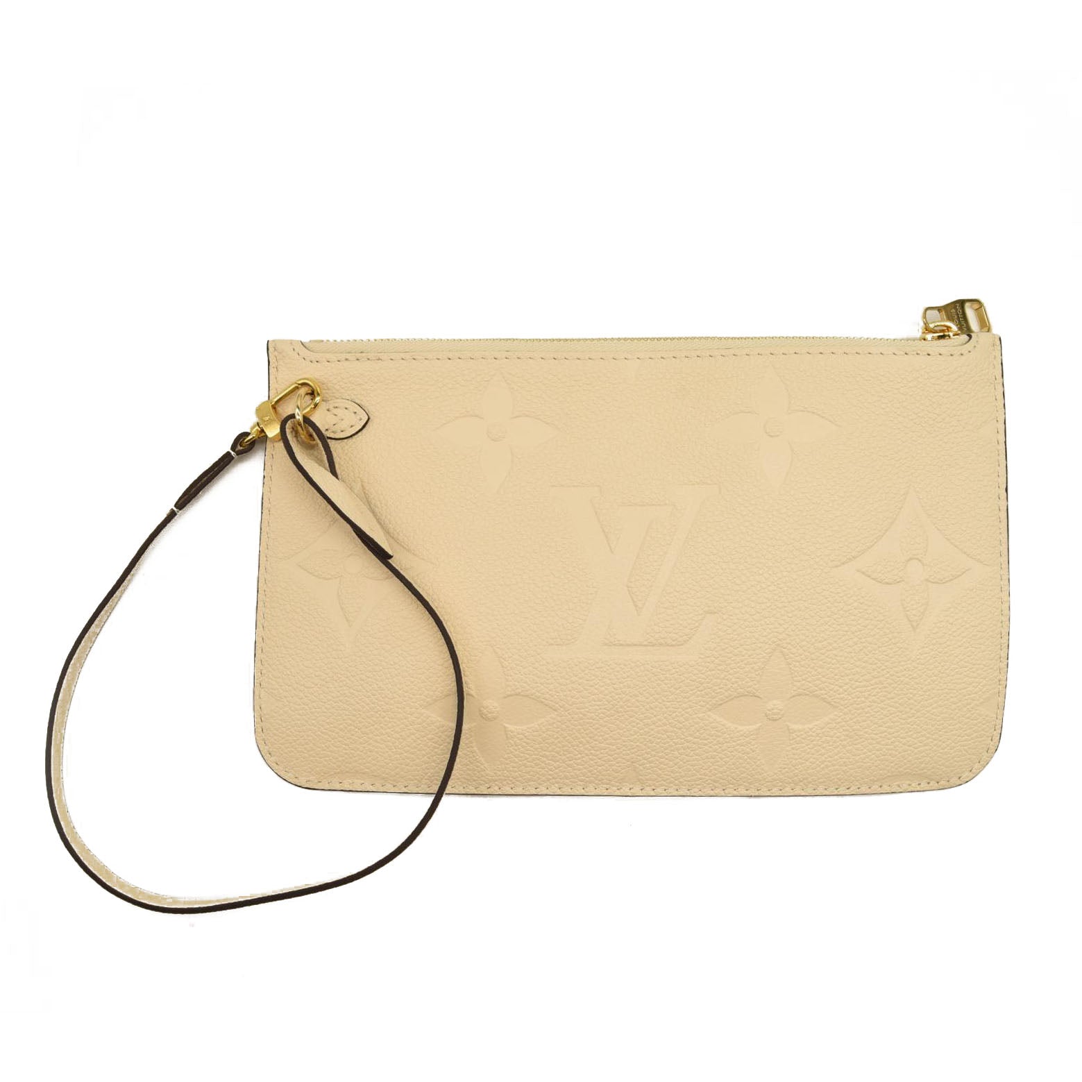 This is an authentic LOUIS VUITTON Empreinte Monogram Giant Neverfull MM in Cream. This beautiful tote is crafted of monogram-embossed leather in ivory. The bag features tall leather handles and polished gold hardware. The top is open to a spacious dark brown microfiber interior with a hanging zipper pocket and a matching pochette.
