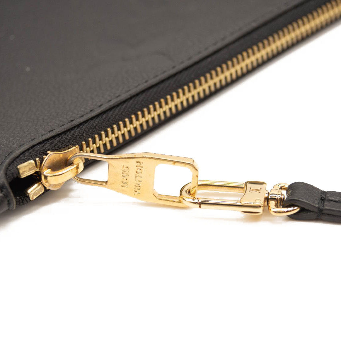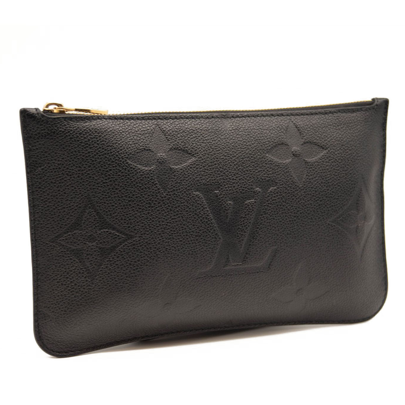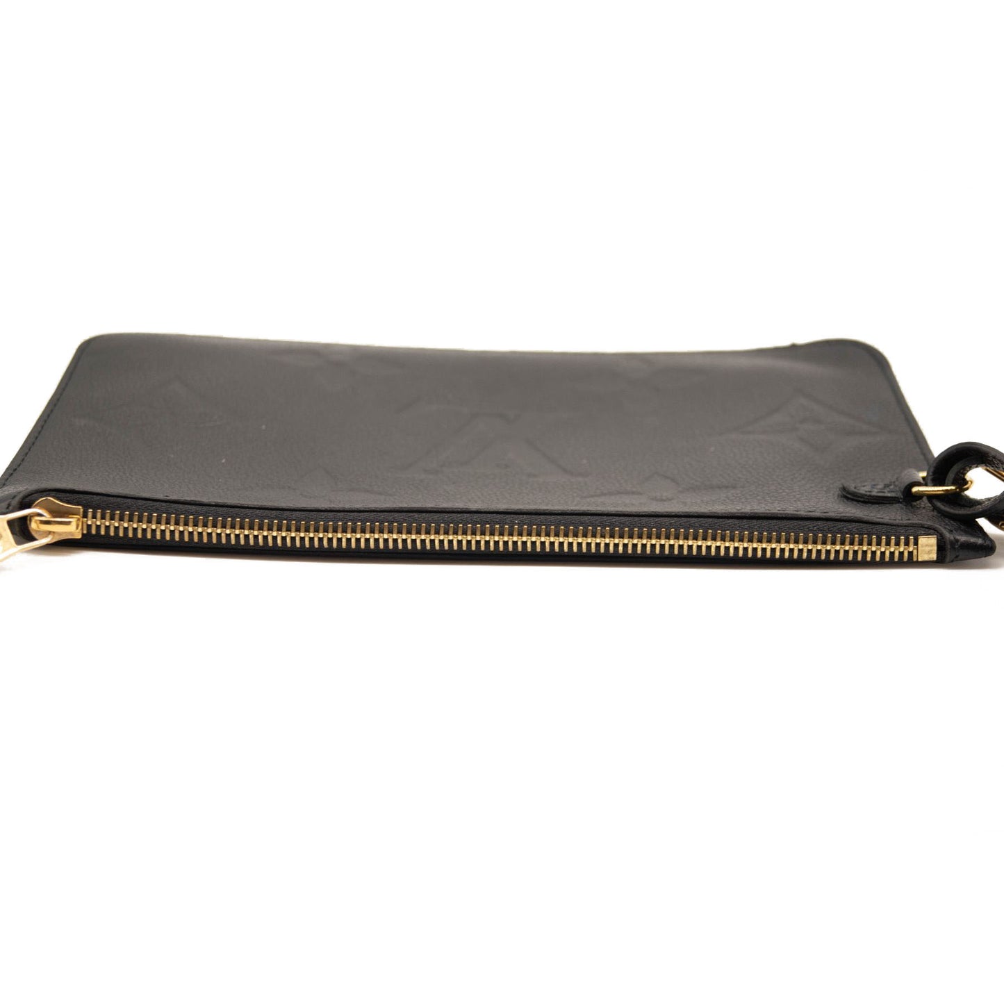 This is an authentic LOUIS VUITTON Empreinte Monogram Giant Neverfull MM Pochette in Black. This embossed monogram leather clutch features a wristlet strap, which can connect to the D-ring inside a Neverfull as an accessory, or can also be worn solo on the shoulder. This pochette opens with a polished brass top zipper to a blue microfiber interior.