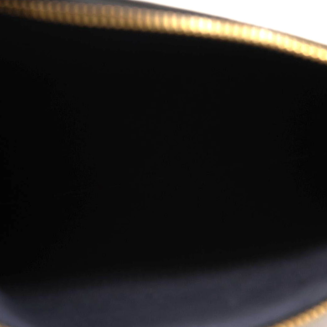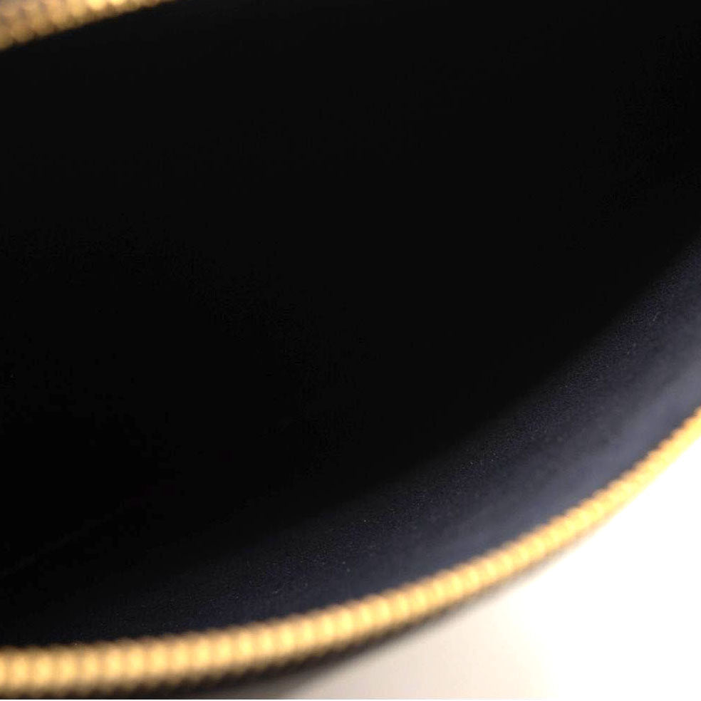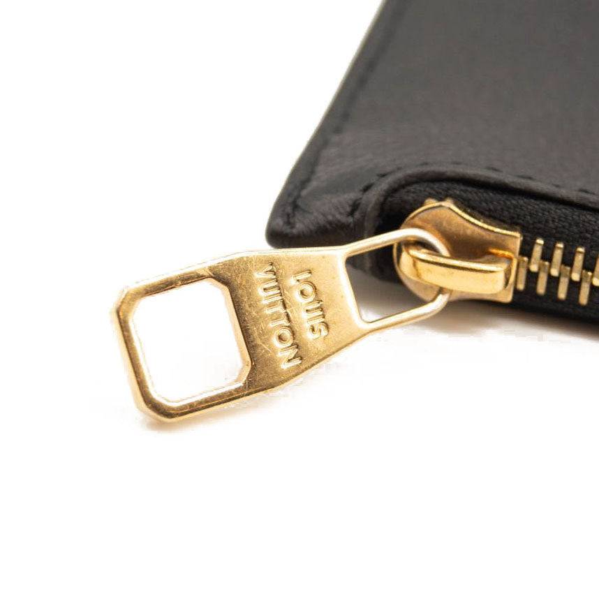 This is an authentic LOUIS VUITTON Empreinte Monogram Giant Neverfull MM Pochette in Black. This embossed monogram leather clutch features a wristlet strap, which can connect to the D-ring inside a Neverfull as an accessory, or can also be worn solo on the shoulder. This pochette opens with a polished brass top zipper to a blue microfiber interior.