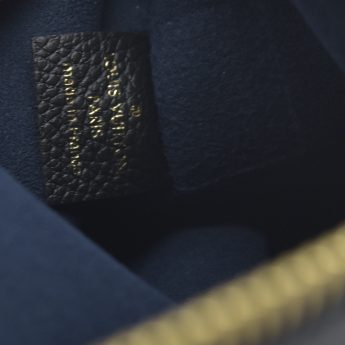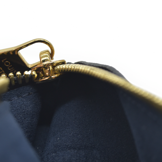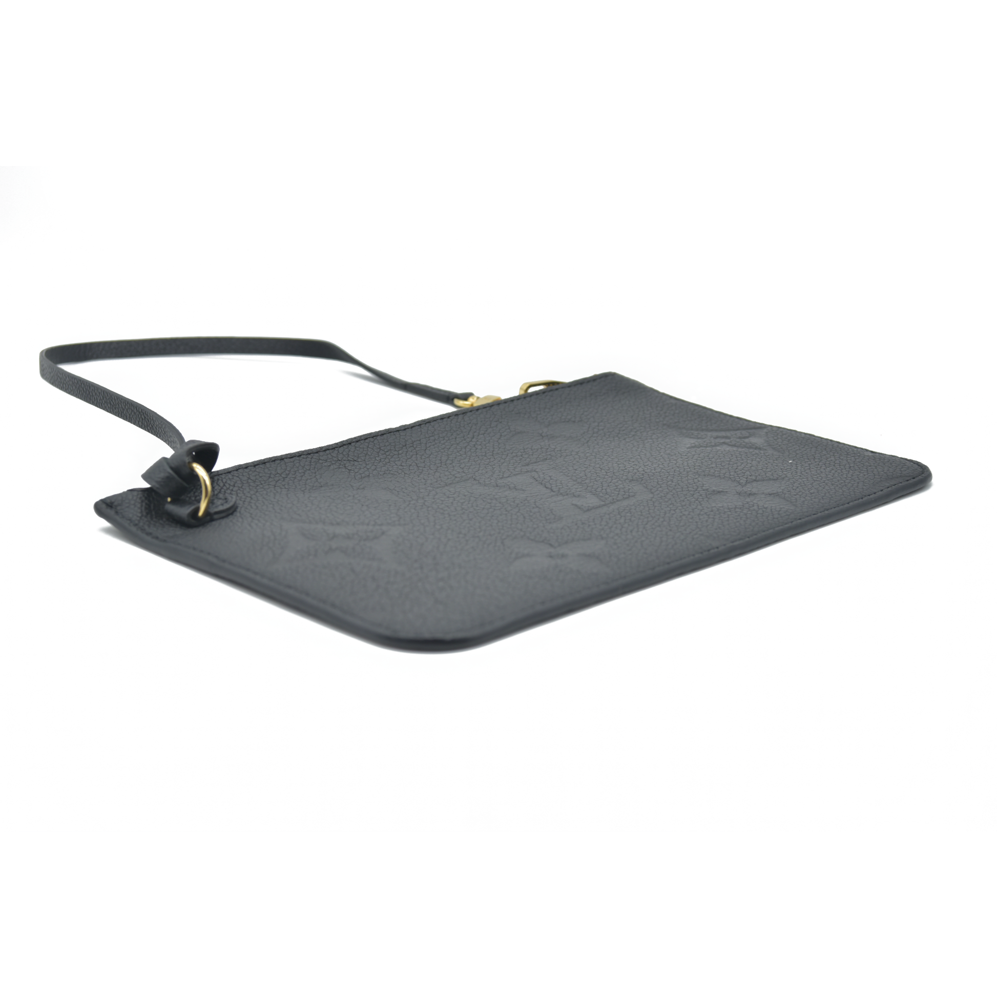 This is an authentic LOUIS VUITTON Empreinte Monogram Giant Neverfull MM Pochette in Black. This embossed monogram leather clutch features a wristlet strap, which can connect to the D-ring inside a Neverfull as an accessory, or can also be worn solo. This pochette opens with a polished brass top zipper to a navy blue microfiber interior.