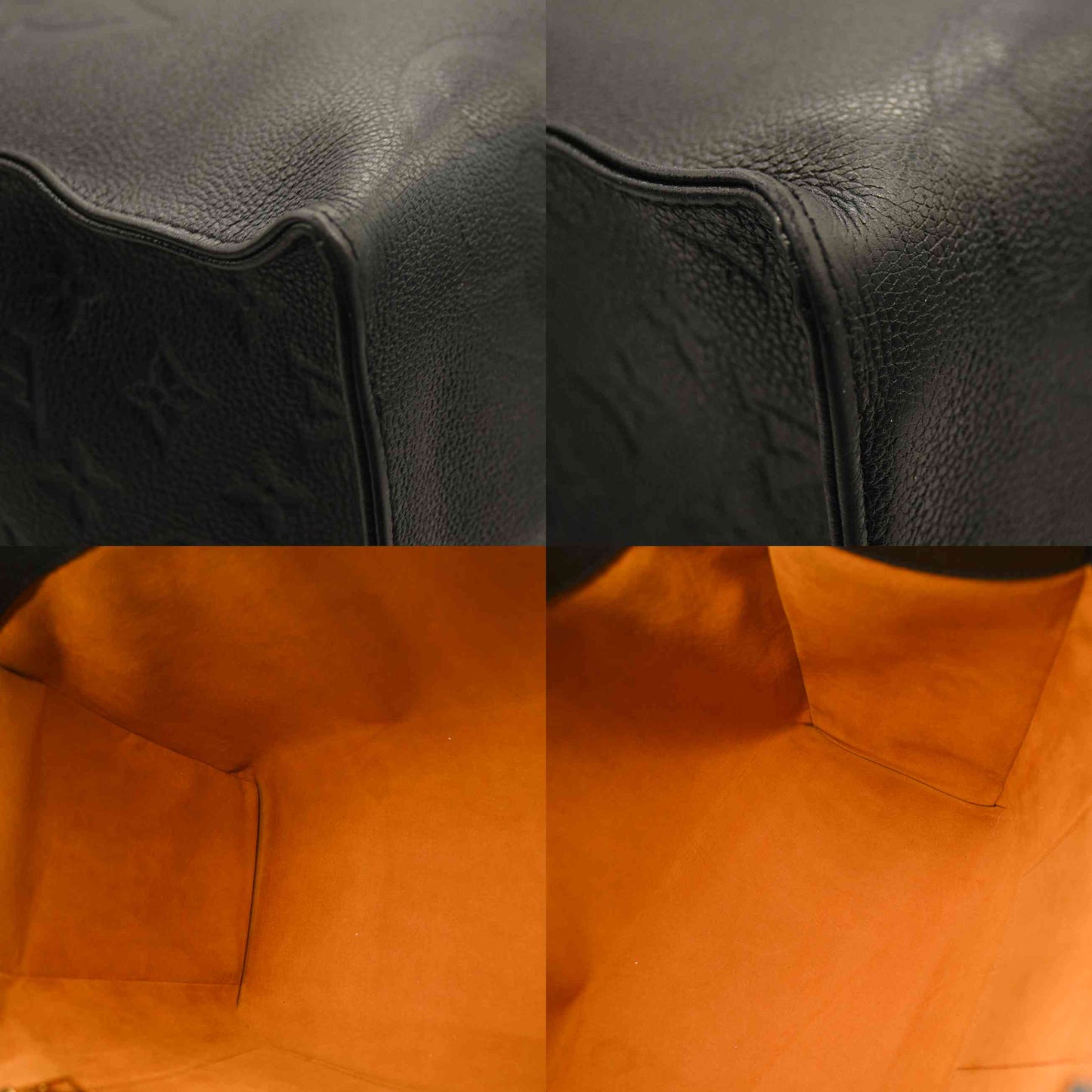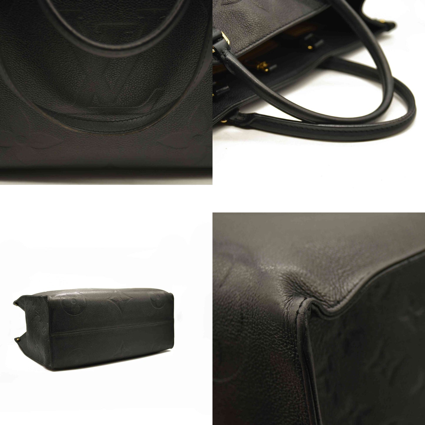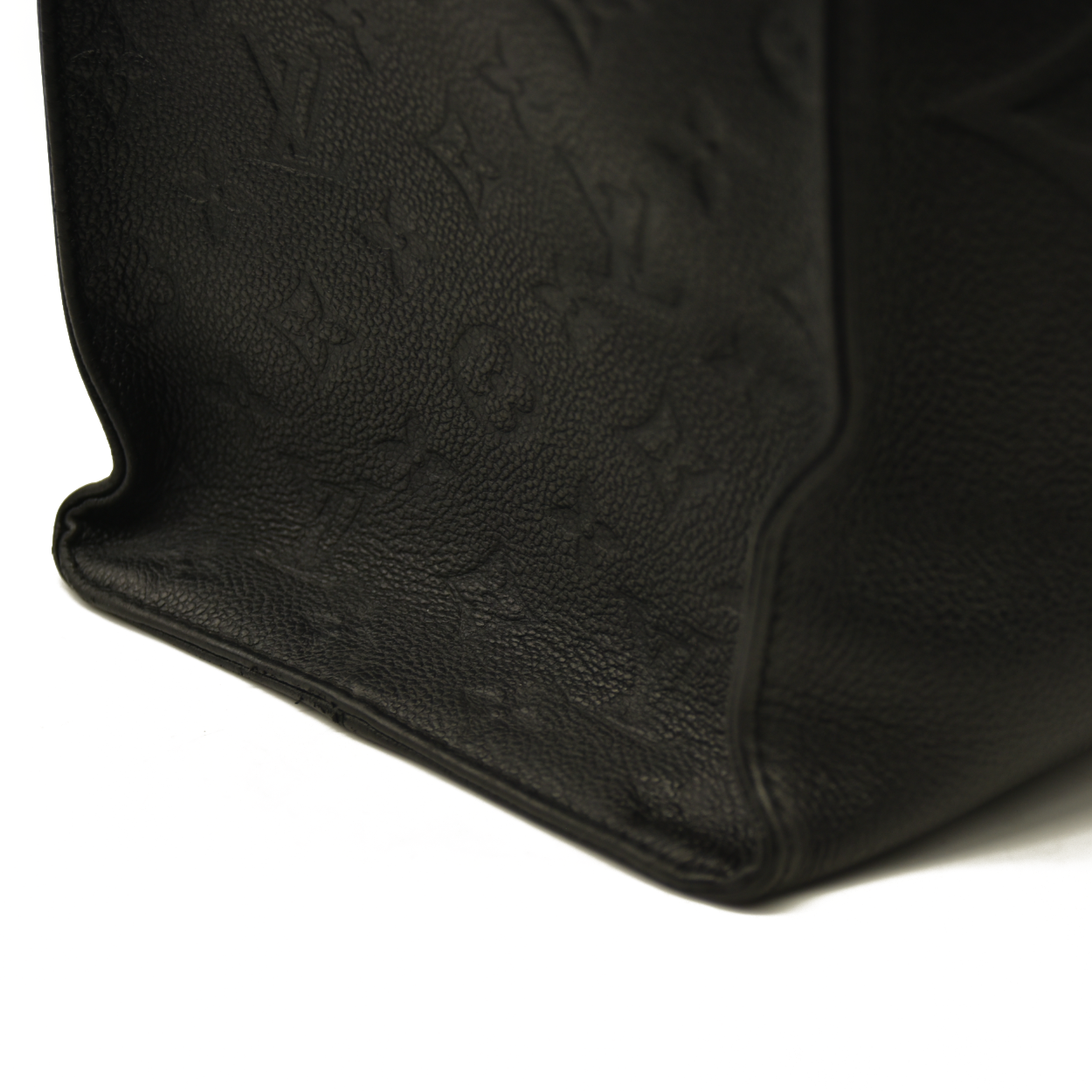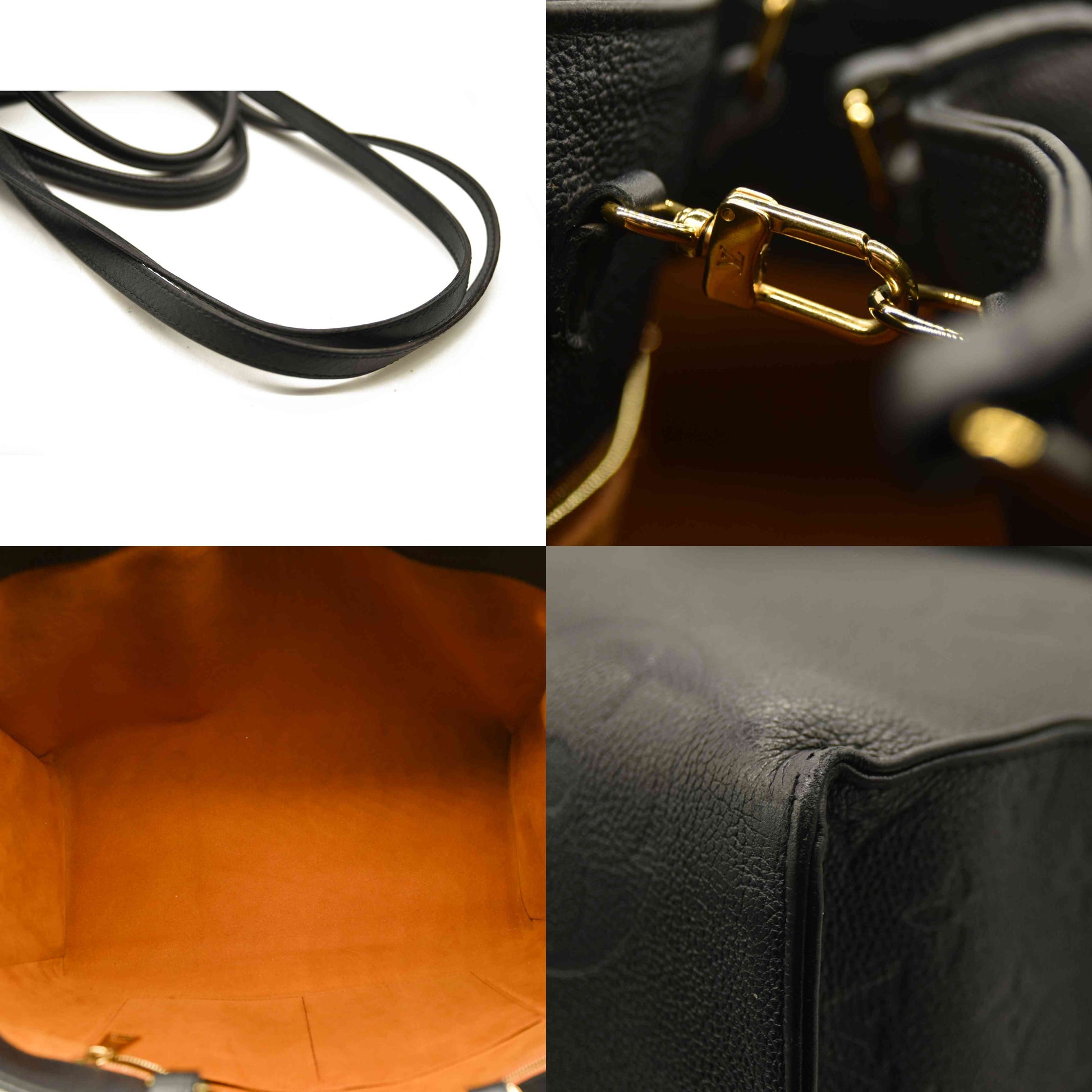 This is an authentic LOUIS VUITTON Empreinte Monogram Giant OnTheGo GM in Black. This limited edition tote is crafted of oversized and classic Louis Vuitton monogram embossed empreinte leather in black. The bag features black leather top handles and long strap handles with brass hardware. The top is open to a spacious orange microfiber interior with zipper and patch pockets.