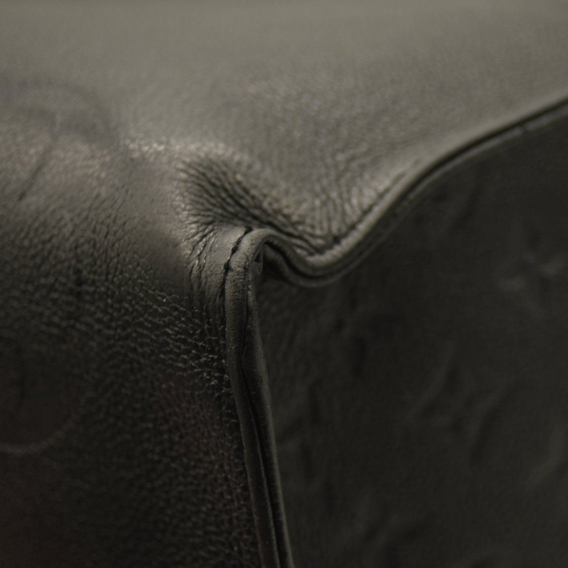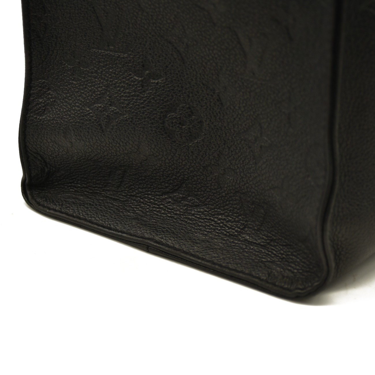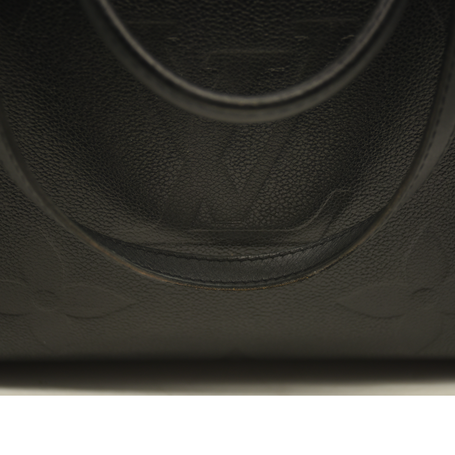 This is an authentic LOUIS VUITTON Empreinte Monogram Giant OnTheGo GM in Black. This limited edition tote is crafted of oversized and classic Louis Vuitton monogram embossed empreinte leather in black. The bag features black leather top handles and long strap handles with brass hardware. The top is open to a spacious orange microfiber interior with zipper and patch pockets.
