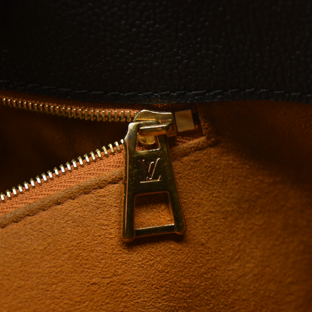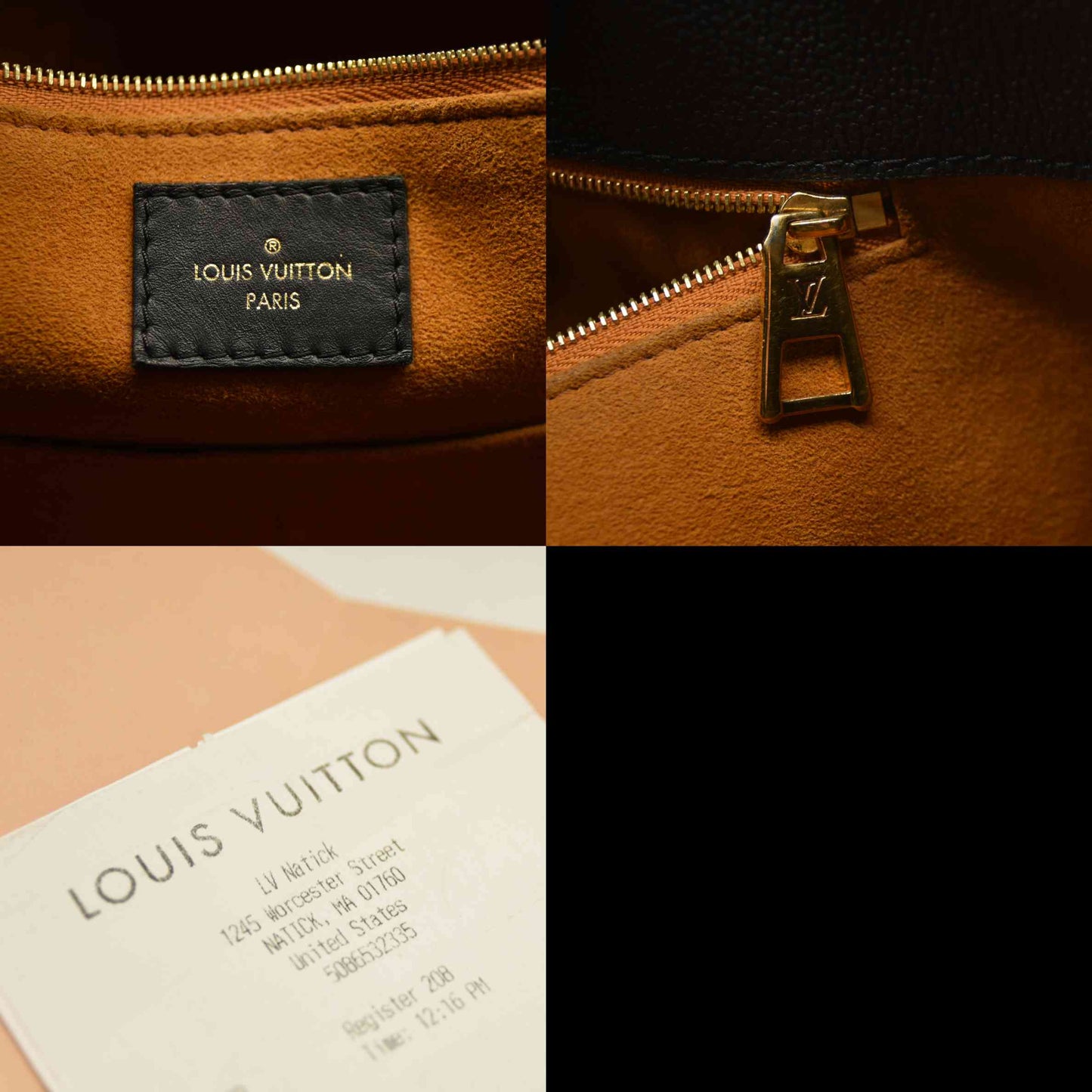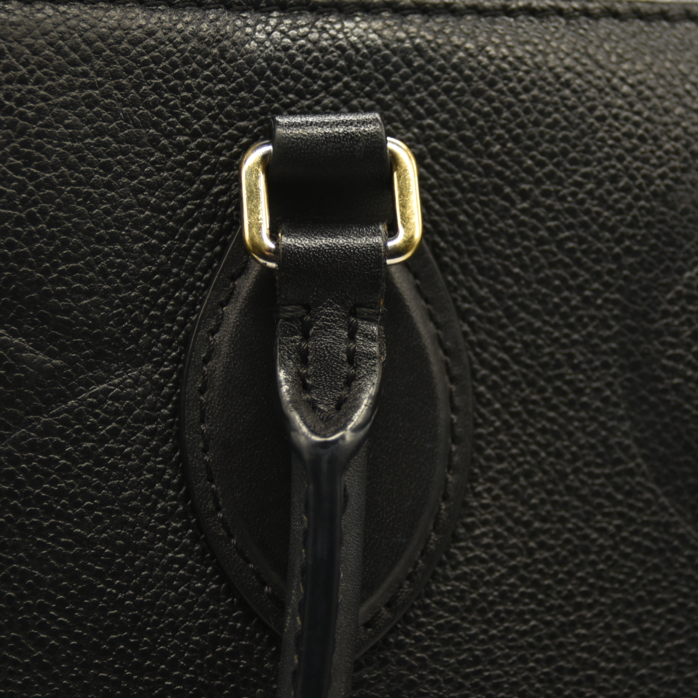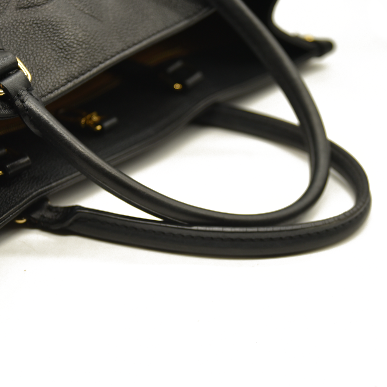 This is an authentic LOUIS VUITTON Empreinte Monogram Giant OnTheGo GM in Black. This limited edition tote is crafted of oversized and classic Louis Vuitton monogram embossed empreinte leather in black. The bag features black leather top handles and long strap handles with brass hardware. The top is open to a spacious orange microfiber interior with zipper and patch pockets.