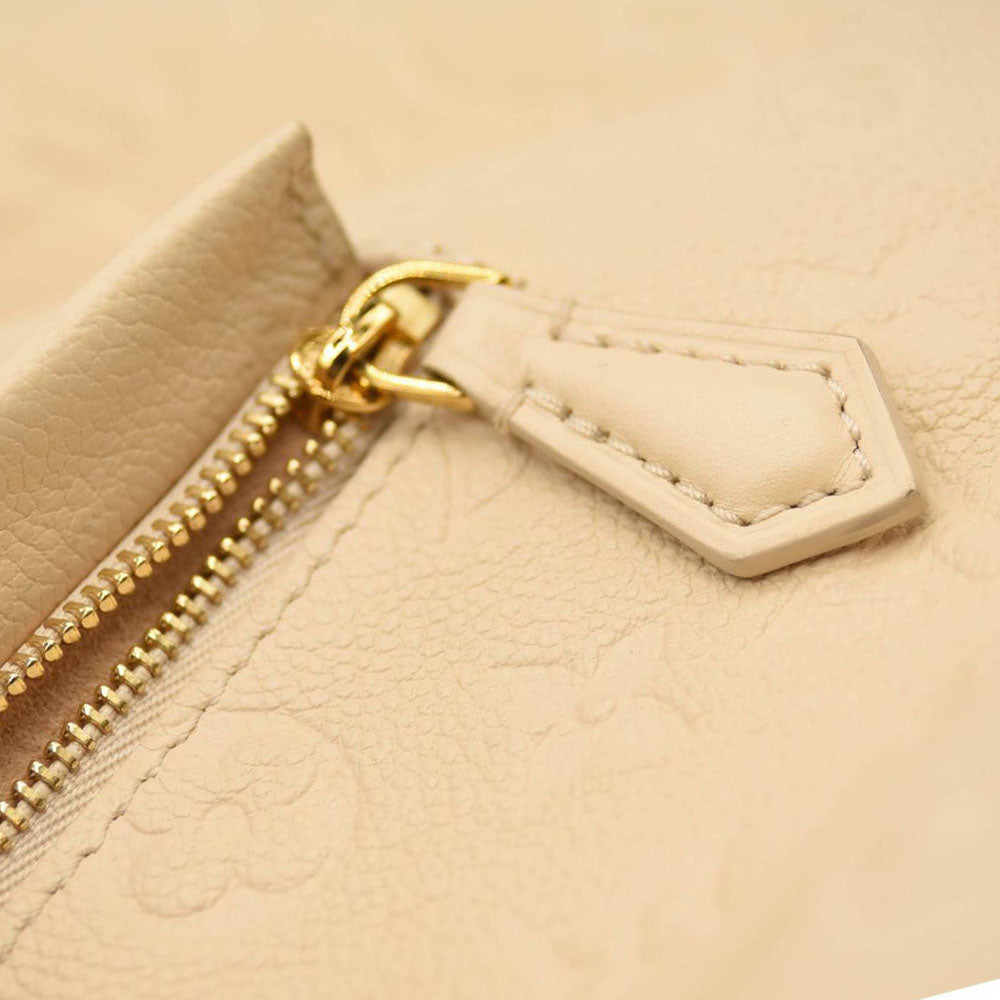 This is the authentic Louis Vuitton Empreinte Monogram Montsouris MM backpack in Turtledove. This backpack is crafted of monogram empreinte leather including shoulder straps, base, and a cinch cord. The bag also features brass hardware, an exterior zipper pocket and a flap with a belt closure. The top opens to a beige fabric interior with a flat pocket and a D ring.