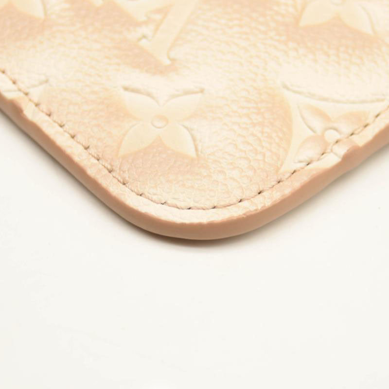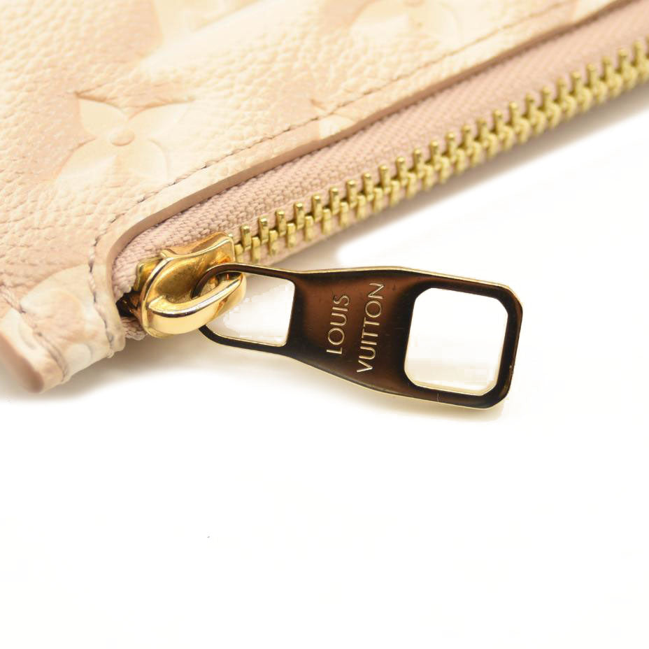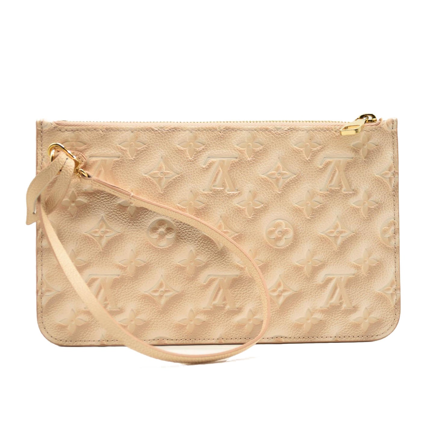 This is an authentic LOUIS VUITTON Empreinte Monogram Summer Stardust Neverfull MM Pochette in Beige Clair. This pre-owned luxury pochette is part of the Louis Vuitton Summer 2022 “Summer Stardust” collection. This limited-edition pochette is crafted of sprayed Louis Vuitton monogram embossed calf leather in glimmering tones of beige and cream. This pochette features an optional leather wristlet strap and a polished gold top zipper that opens to a matching microfiber interior