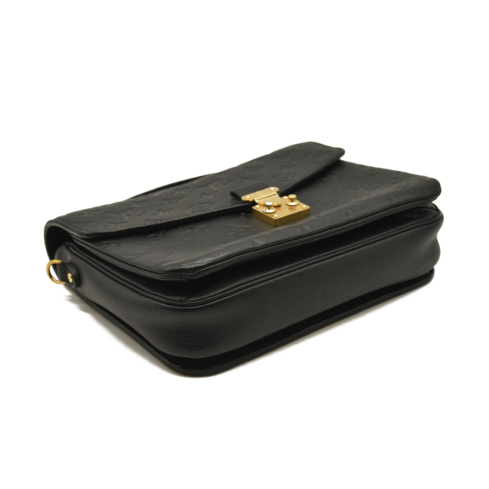 This is an authentic LOUIS VUITTON Empreinte Pochette Metis in Noir Black. This stylish shoulder bag is finely crafted of classic monogram empreinte leather in black. The shoulder bag features a short handle, a long black leather shoulder strap and polished brass hardware. The front has a brass press lock that opens to a gray striped fabric partitioned interior that is ideal for any occasion with the luxury and style, from Louis Vuitton!