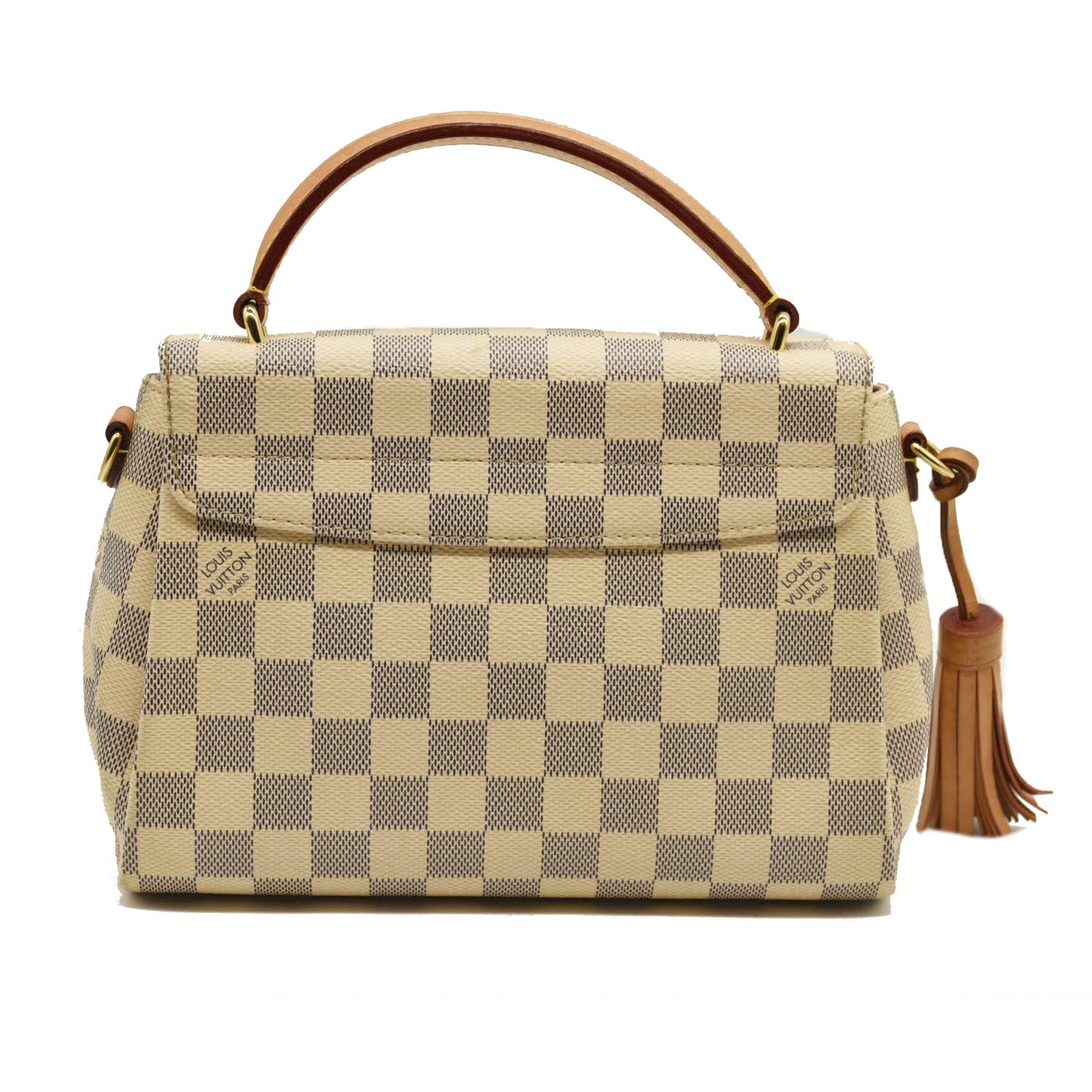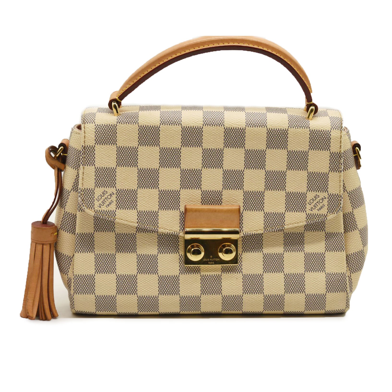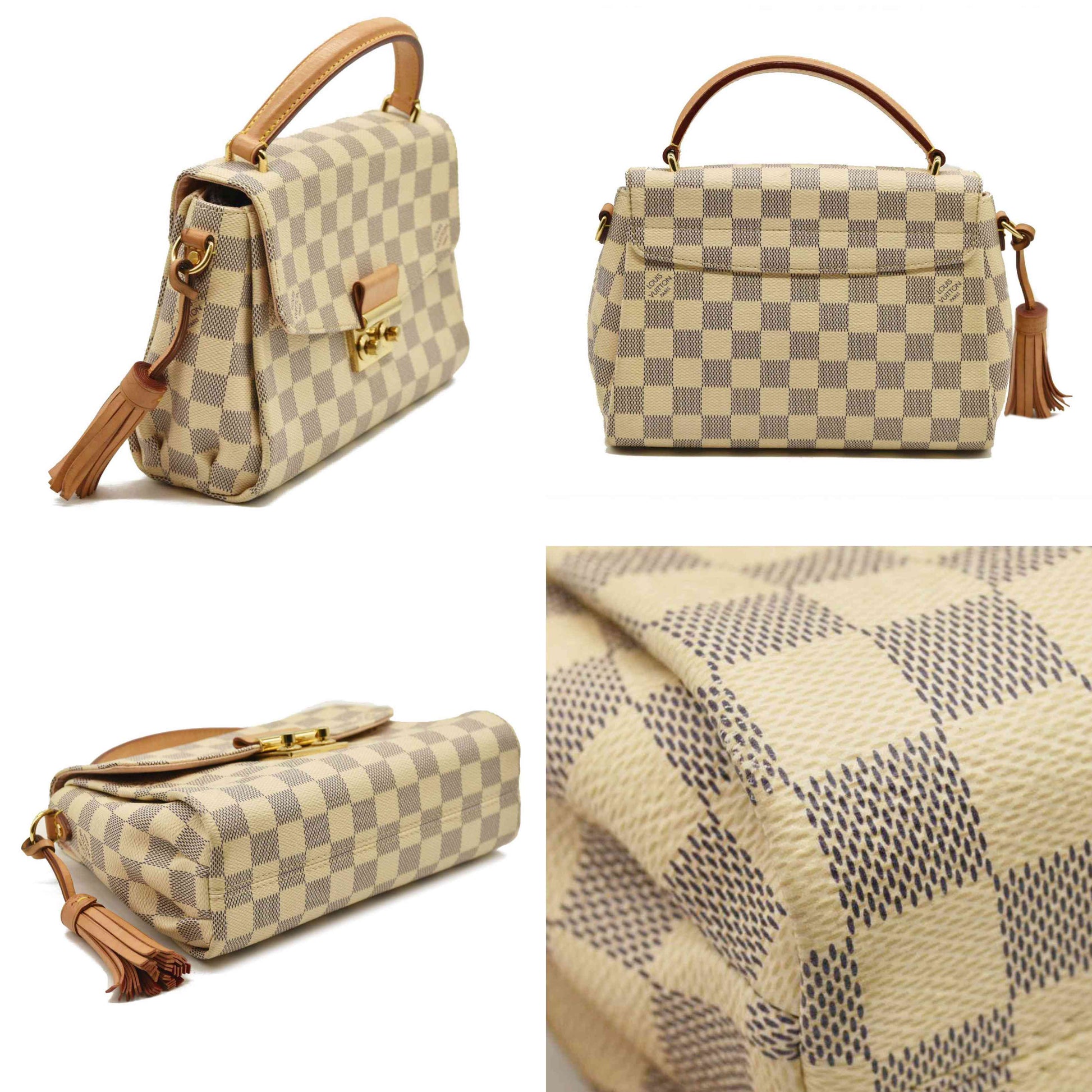 This is an authentic LOUIS VUITTON Damier Azur Croisette. This compact tote is crafted of Louis Vuitton checkerboard coated canvas in blue and white. The bag features signature vachetta cowhide leather trim including a top handle, a removable tassel, and an optional shoulder strap with brass hardware. The crossover flap opens with an s-lock to a ballerina pink fabric interior with a patch pocket.
