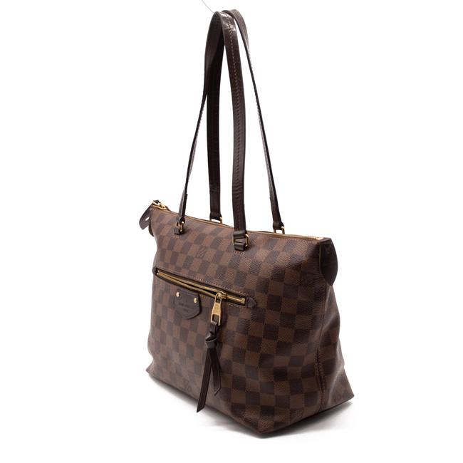 We guarantee this is an authentic LOUIS VUITTON Damier Ebene Iena PM or 100% of your money back. This stylish tote is crafted of Louis Vuitton Damier coated canvas in brown. The bag features a front zipper pocket, and chocolate brown leather trim and strap handles, with polished brass hardware. The top zipper opens the bag to a plum fabric interior with patch pockets.