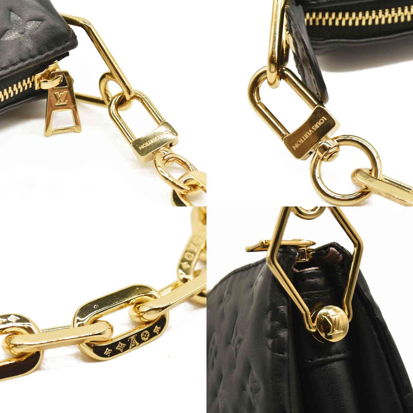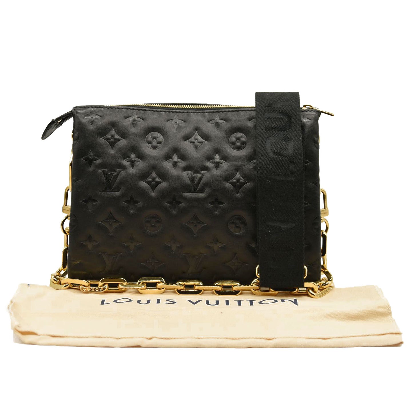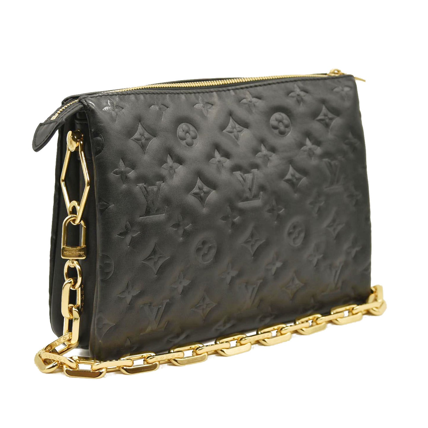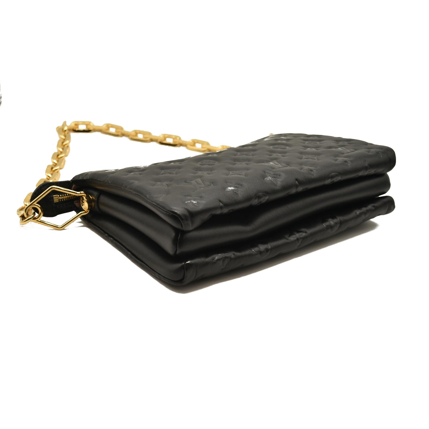 This is an authentic LOUIS VUITTON Lambskin Embossed Monogram Coussin PM in Black. From Louis Vuitton's spring 2021 collection, this soft and supple shoulder bag is featured in puffy lambskin in black, and is embossed with Louis Vuitton monogram. The bag can be carried solo as a clutch, or with the gold hardware Edge Chain strap or the adjustable black strap for wearing crossbody or on the shoulder. The three zippered compartments are lined in microfiber.