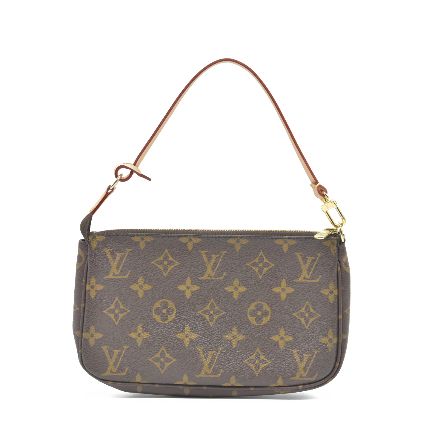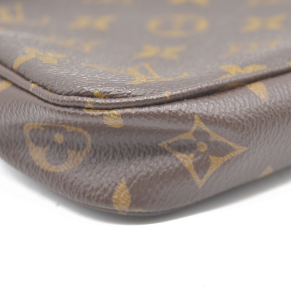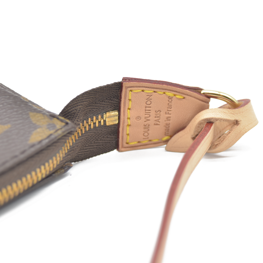 This is an authentic Louis Vuitton Pochette Accessoires in Brown Monogram Canvas. Crafted from the iconic monogram coated canvas with natural Vachetta leather trim, this timeless pouch features a gold-tone top zipper and a detachable leather strap for shoulder or clutch wear. The interior is lined in textile and offers just enough room for your daily must-haves.