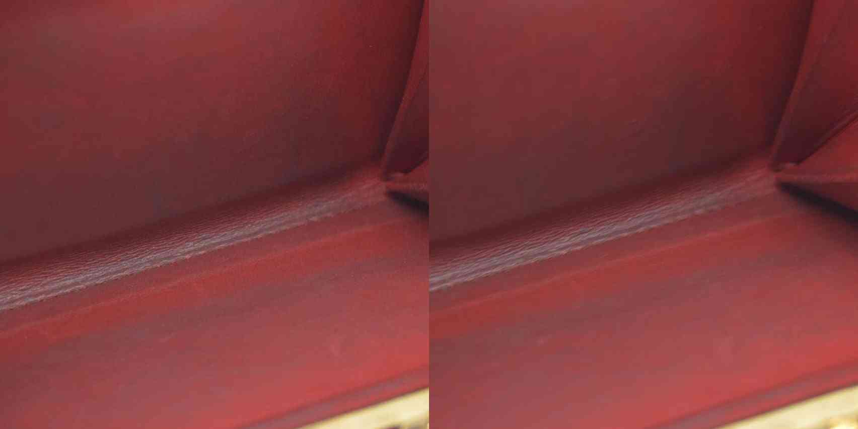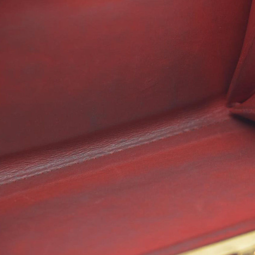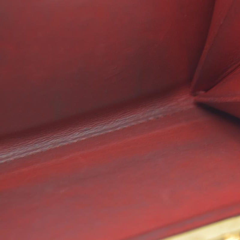 Heavy discoloration at interior pocket; notable peeling at closure and piping;moderate scratches at interior; moderate patina and scratches at hardware